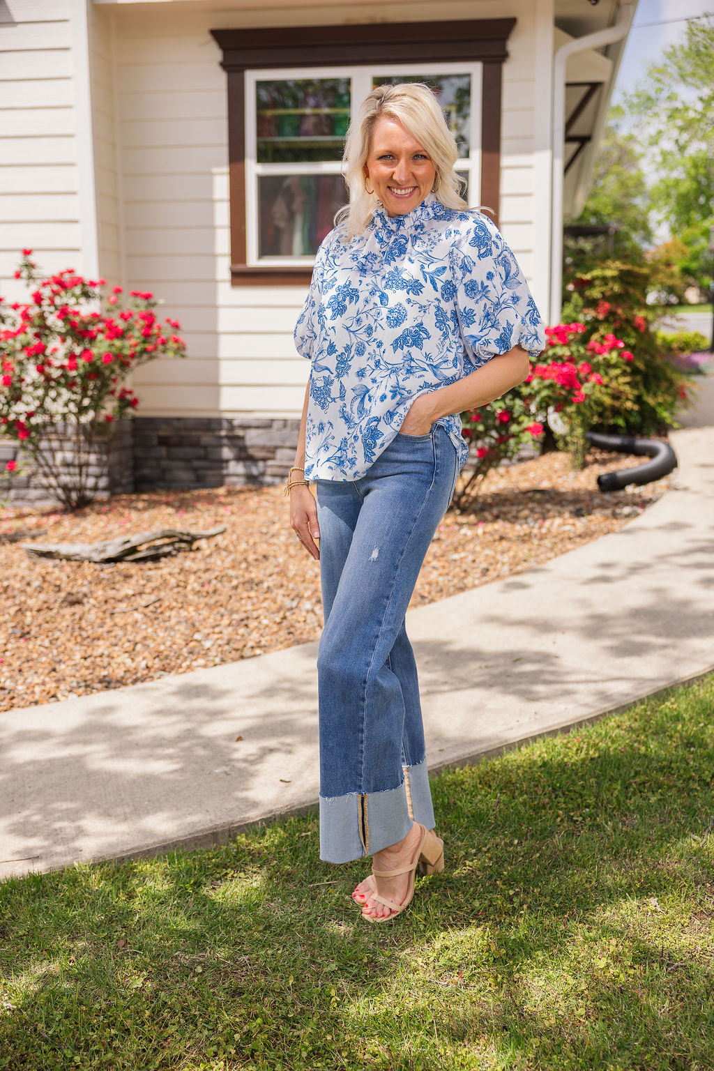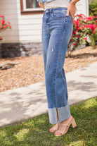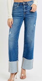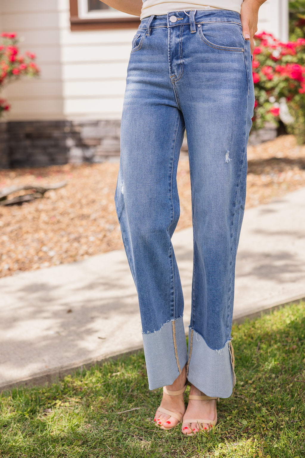 These Skyline Cuff Jeans feature a high-rise, ankle length fit with a wide, cuffed design. The perfect blend of style and comfort, these jeans offer a flattering silhouette and on-trend look. Elevate your wardrobe with these must-have jeans.