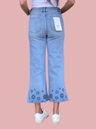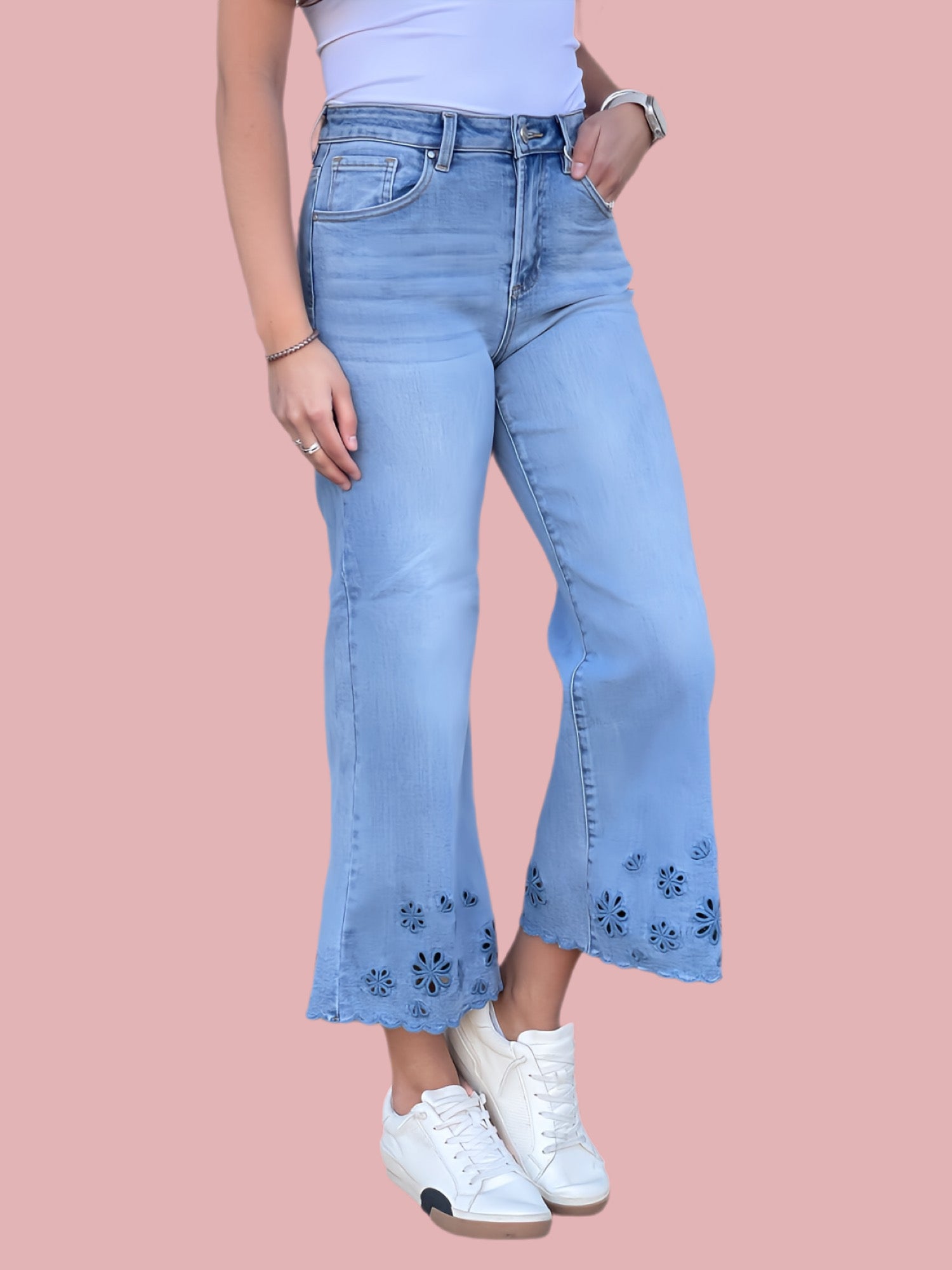 These high rise crop jeans feature a wide cut out detail, providing a unique and stylish look. Made with high-quality materials, these jeans offer superior comfort and durability. Their flattering fit accentuates your curves, making them a must-have addition to your wardrobe. Elevate your style with these versatile and trendy jeans.