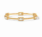 Baguette-cut gemstones set in gold and embellished with twisted wire details.