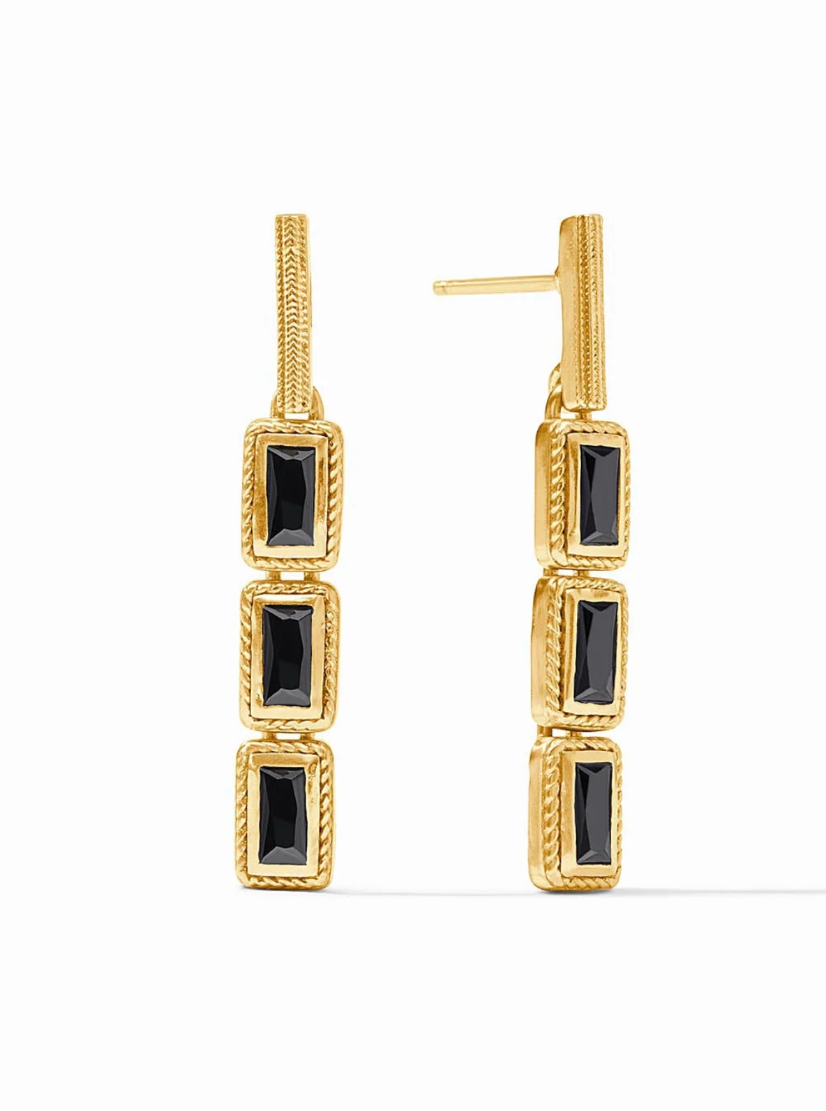 Three baguette-cut gemstones embellished with twisted golden wire, dangling from a braided gold bar.