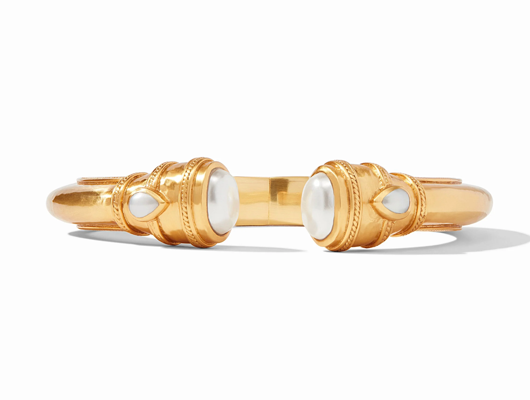 This sumptuous cuff features gemstone endcaps and two more pear-shaped gemstones set in a luxuriously gilded shank.