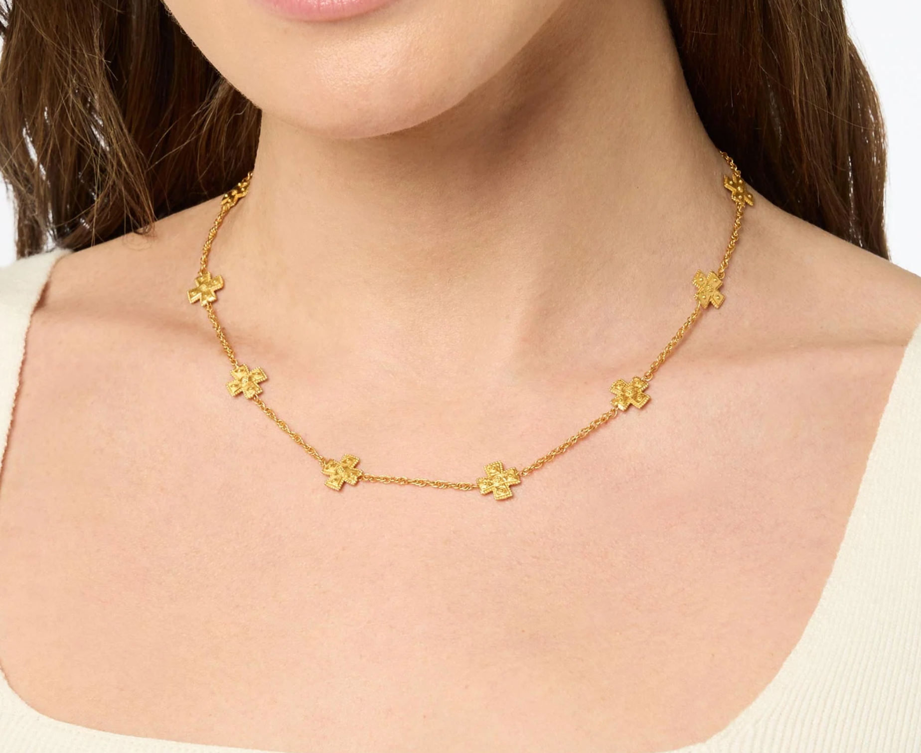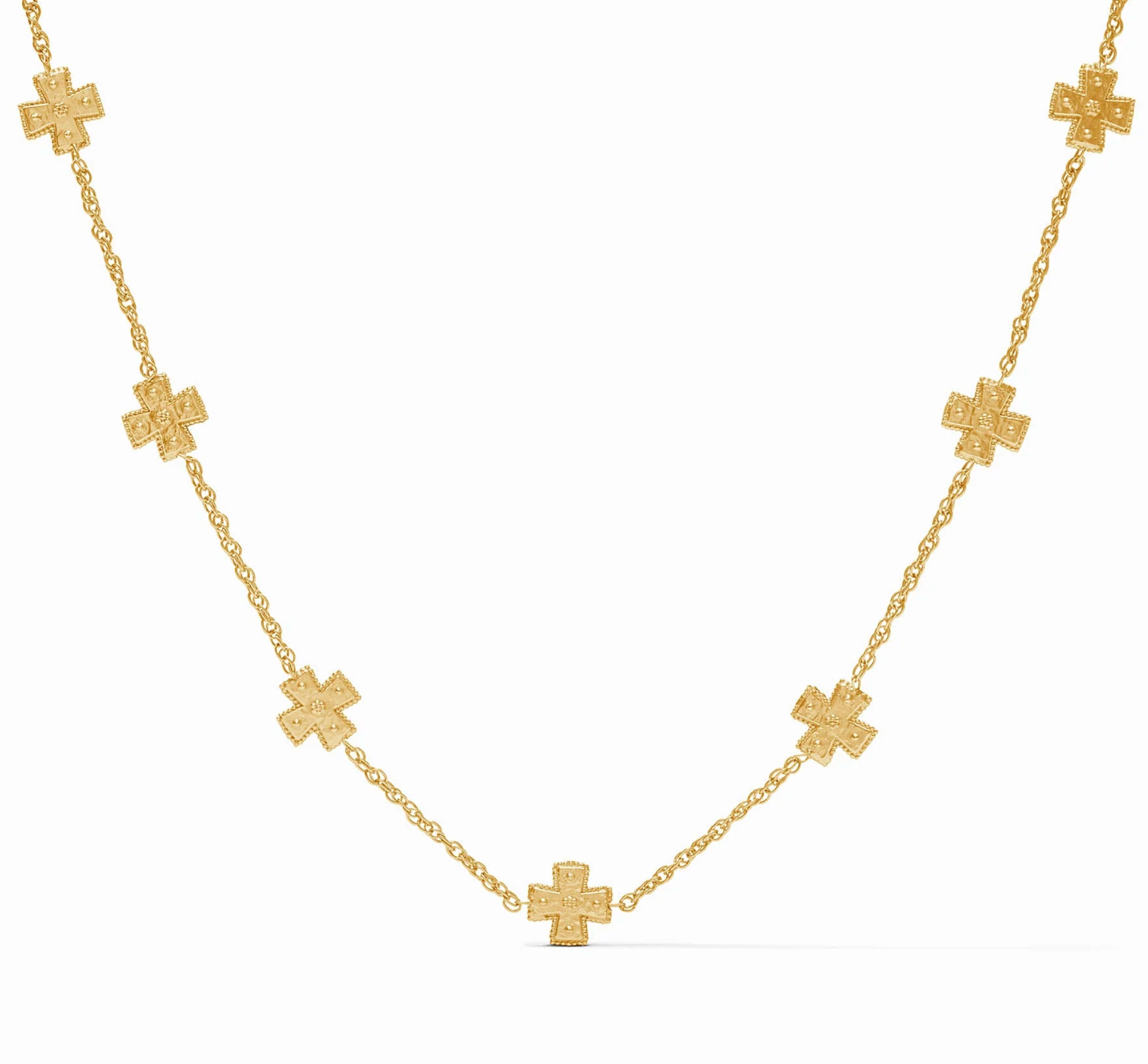 Hand-hammered crosses decorated with golden beads, connected with delicate gold rope chain.