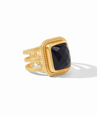 A faceted rectangular gem embellished with braided golden wire, on a sculpted shank with matching texture.