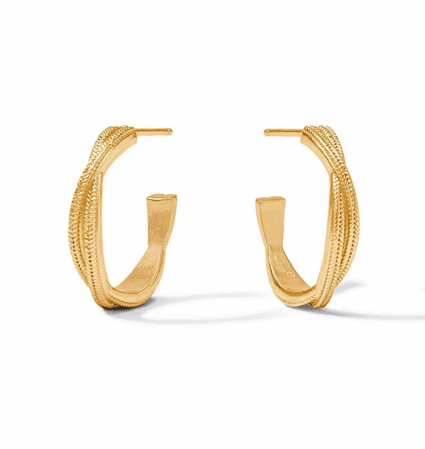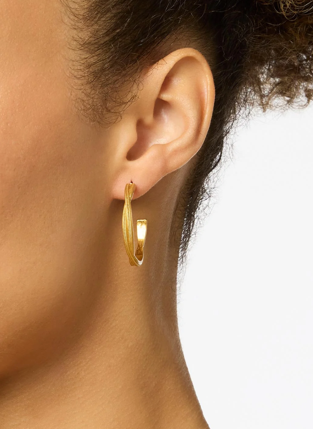 Each earring is formed from two twisting, interlocked hoops textured with braided golden wire.