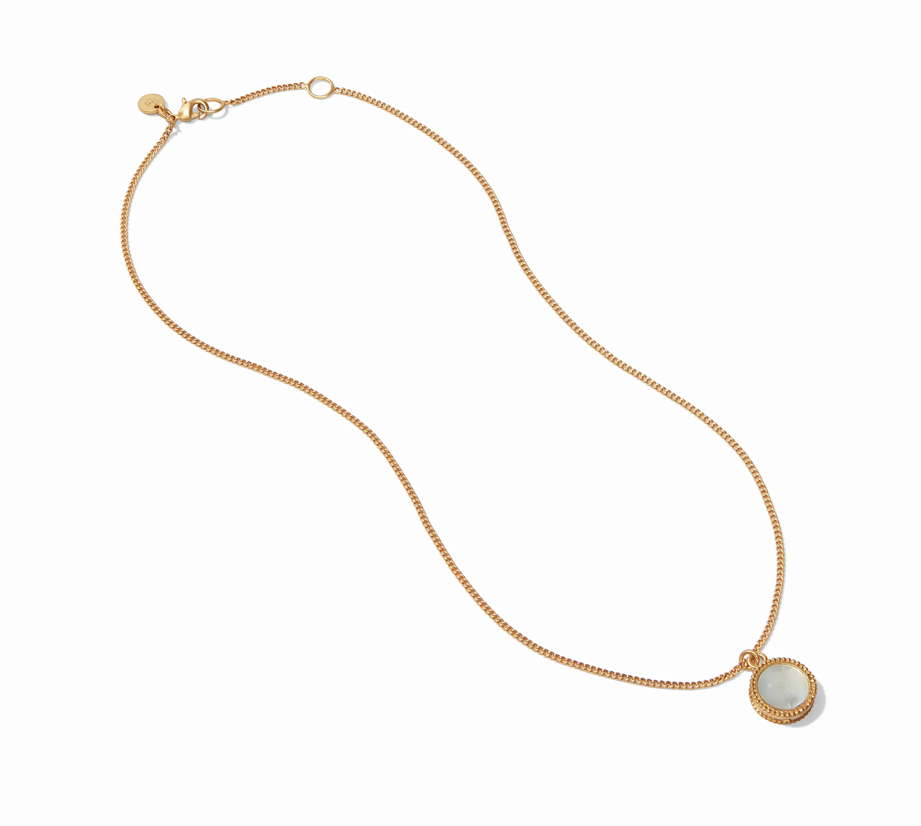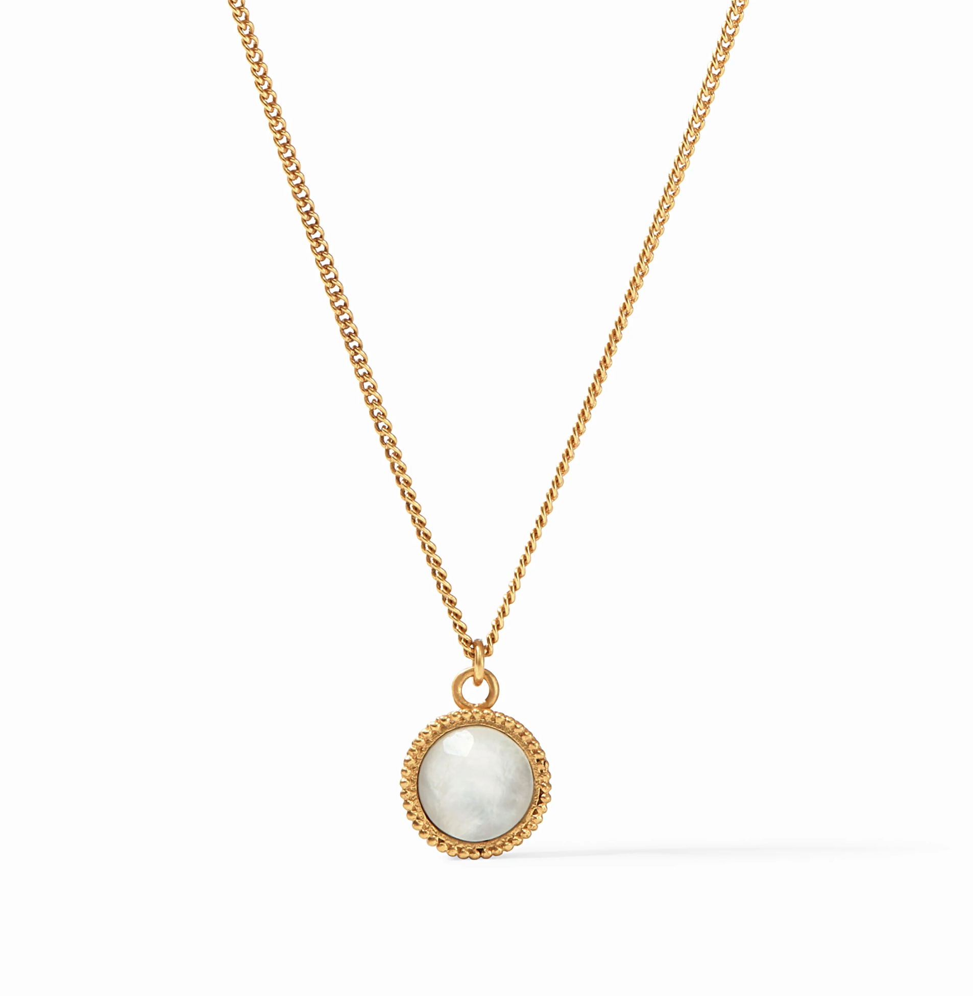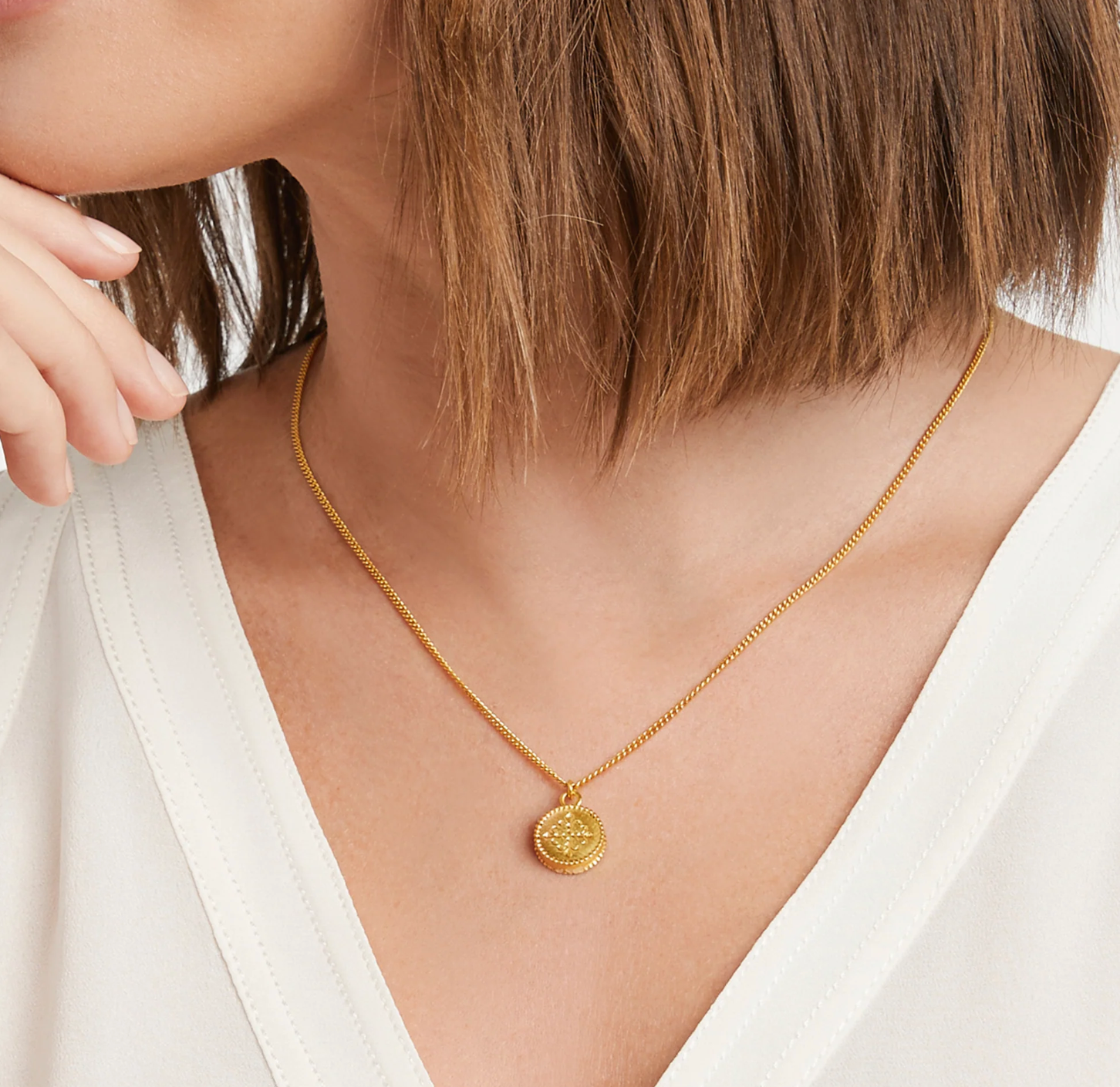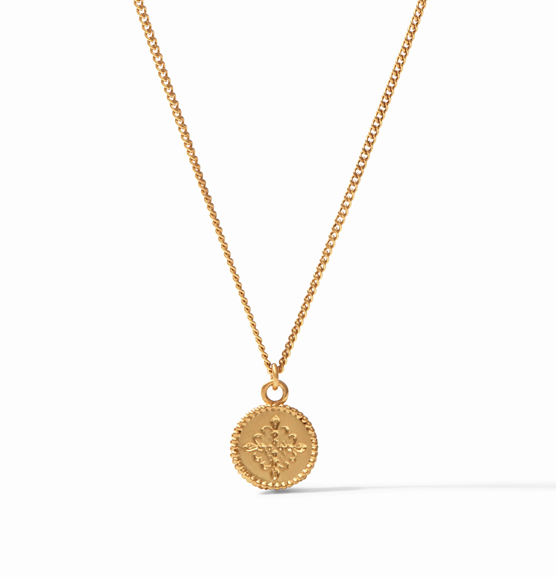 One necklace, two ways to wear it—one side features a glittering gemstone, while the reverse side features a fleur-de-lis intaglio.