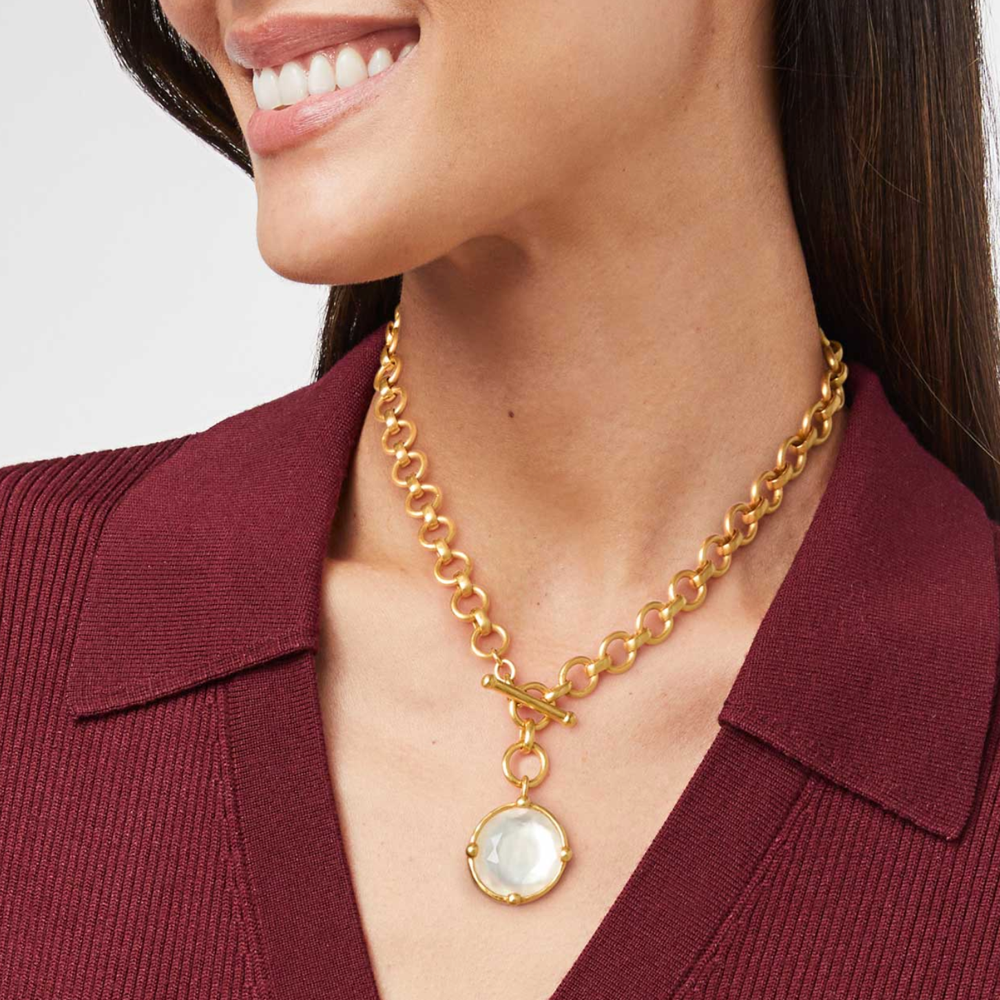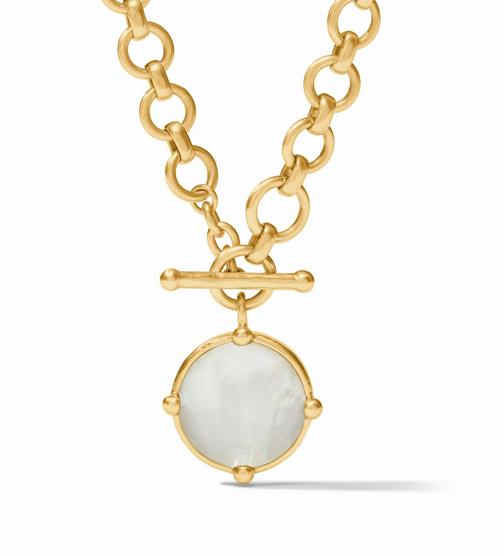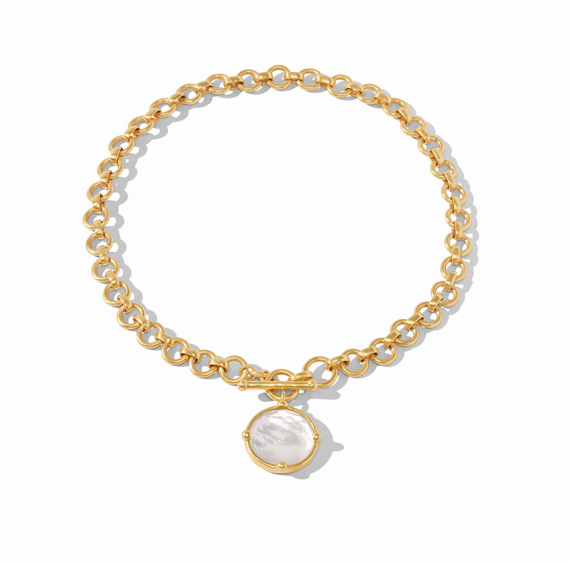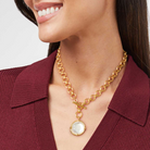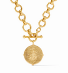 This demi-sized version of a favorite necklace has two ways to wear: Show the rose cut stone accented with golden beads or flip it to display a detailed bas relief bee.