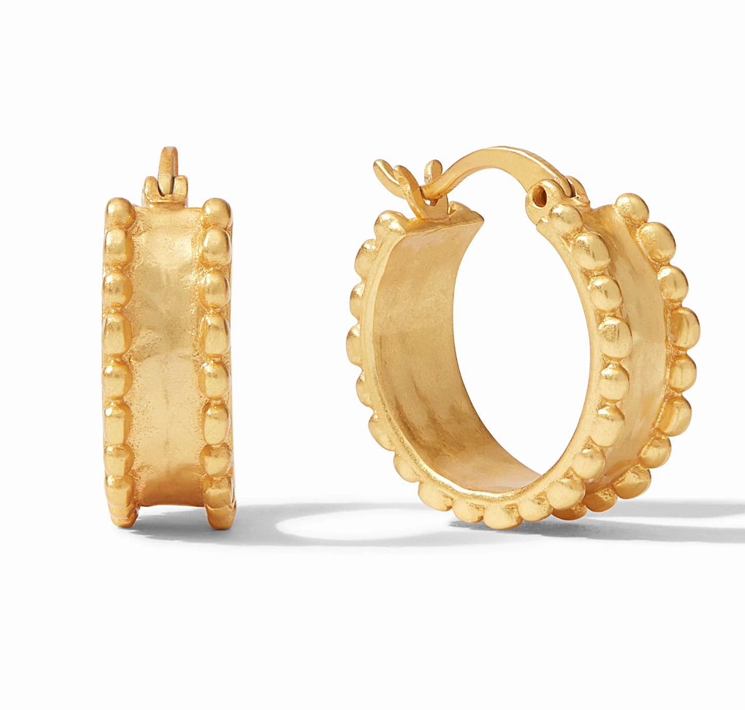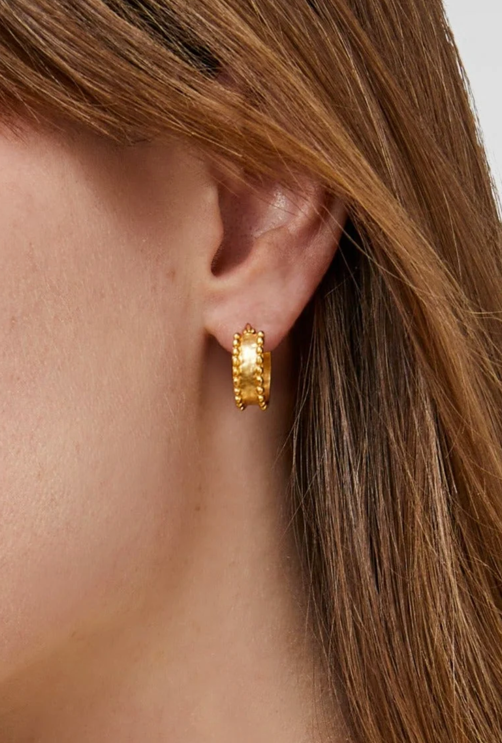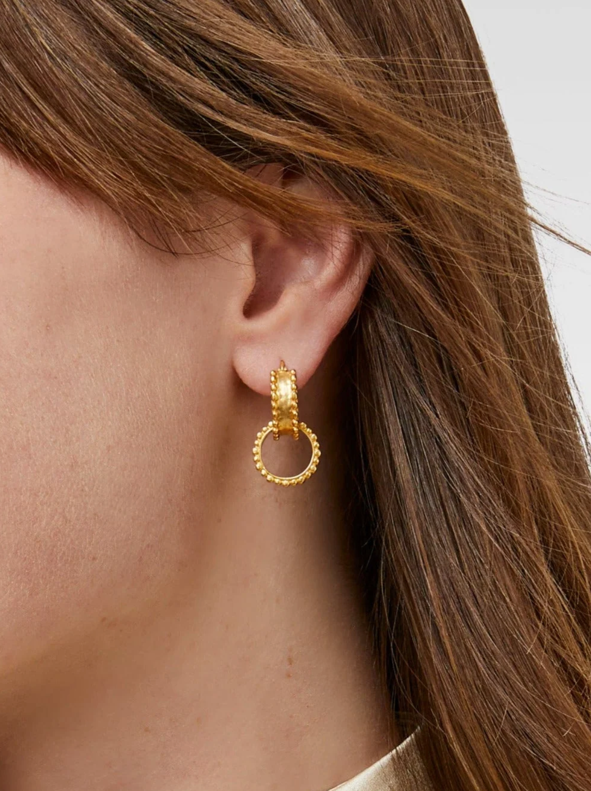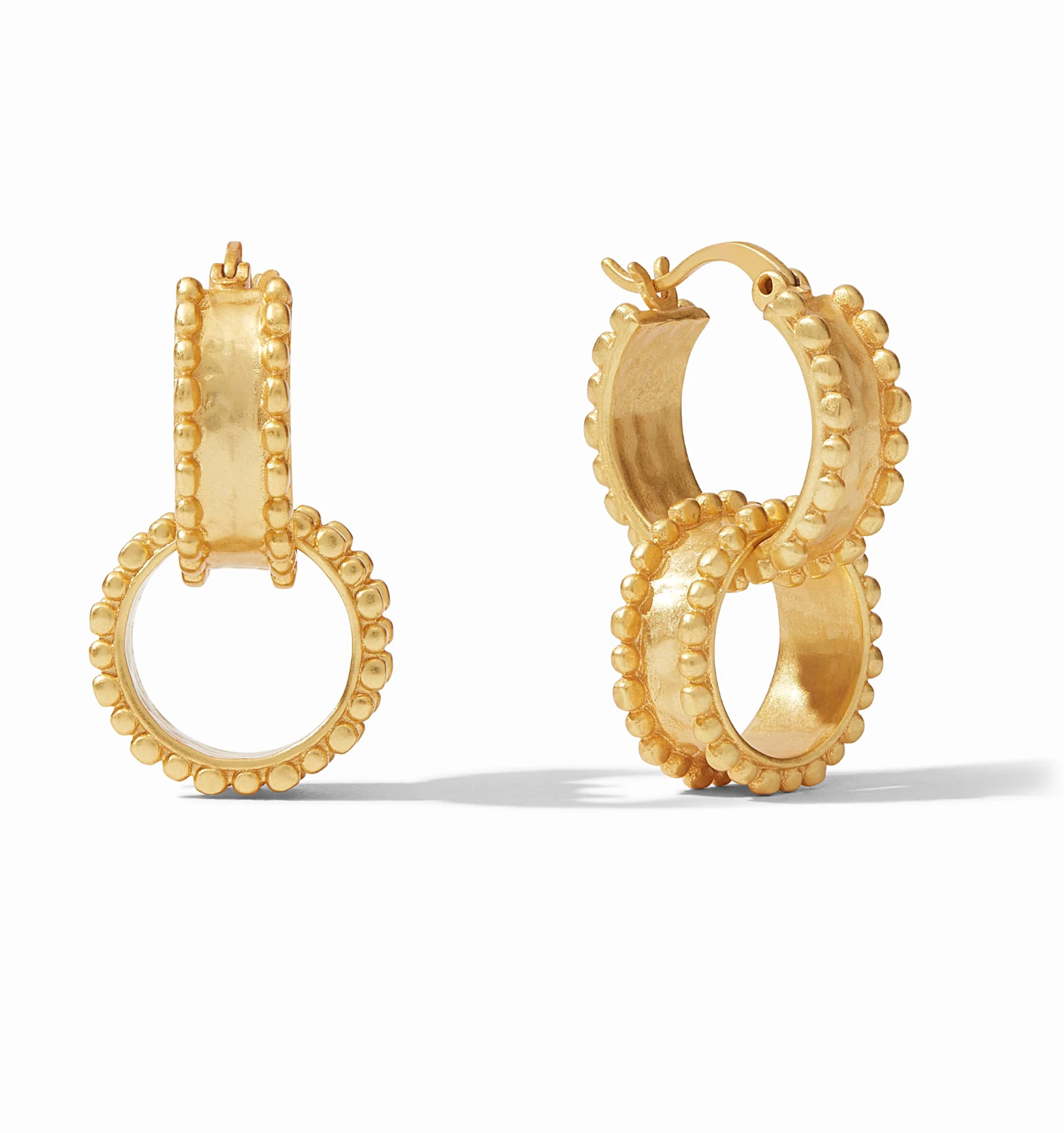 These customizable earrings feature small hoops with another hooped charm that adds depth and texture to a classic style. Impeccably imperfect beading along each hoop makes them feel like an antique find with modern appeal.