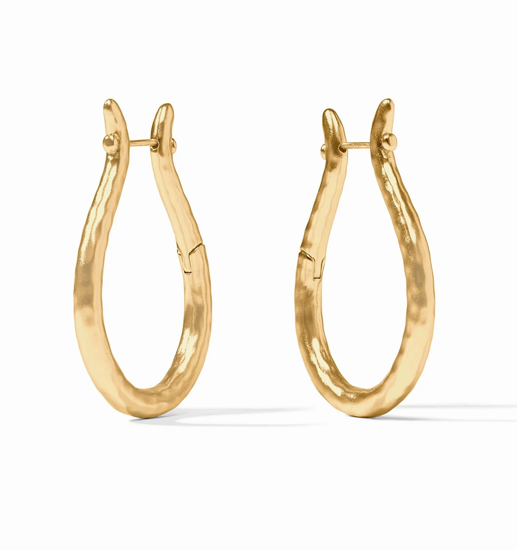 Brimming with timeless equestrian elegance, these lightly hammered golden hoops recall the form of vintage bridle rings.