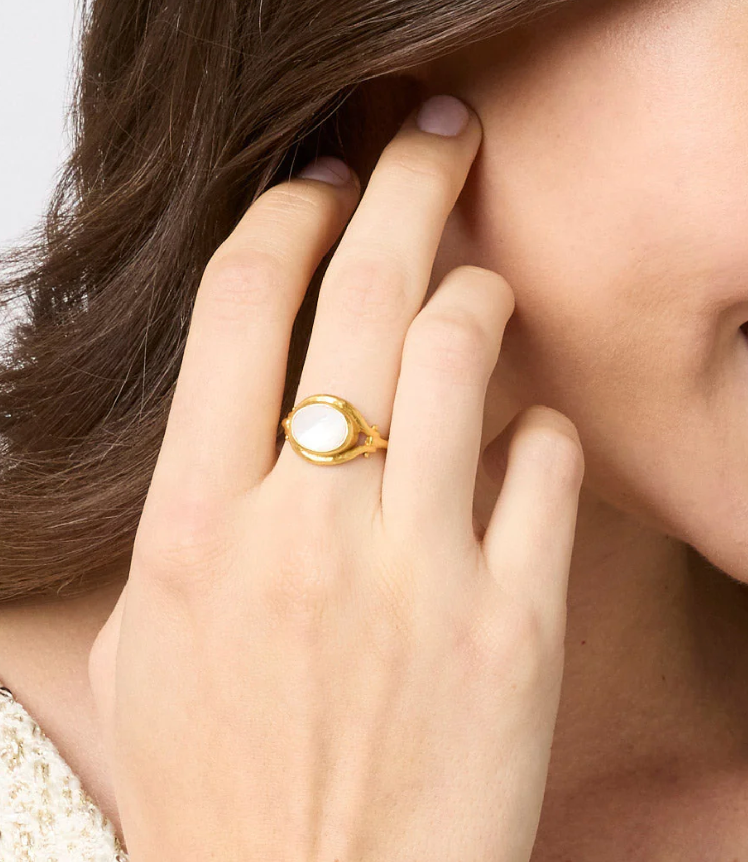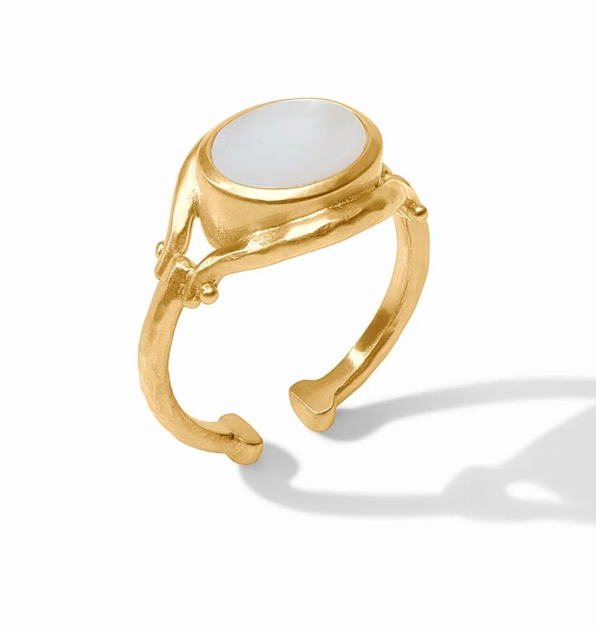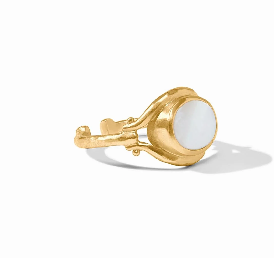 This elegant ring pays homage to the shining equestrian spirit with a mother of pearl disc cradled between two elongated golden bridle rings.