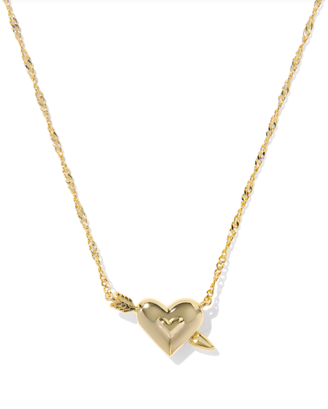 Our sweetest style gets a romantic makeover in the Ari Heart Arrow Gold Short Pendant Necklace. Set on a dainty chain, this darling pendant features an organic heart shape and dimensional arrow design, framed with our signature hoofprint detailing. Wear it with the Ari Heart Arrow Huggie Earrings for an oh-so-cute look.