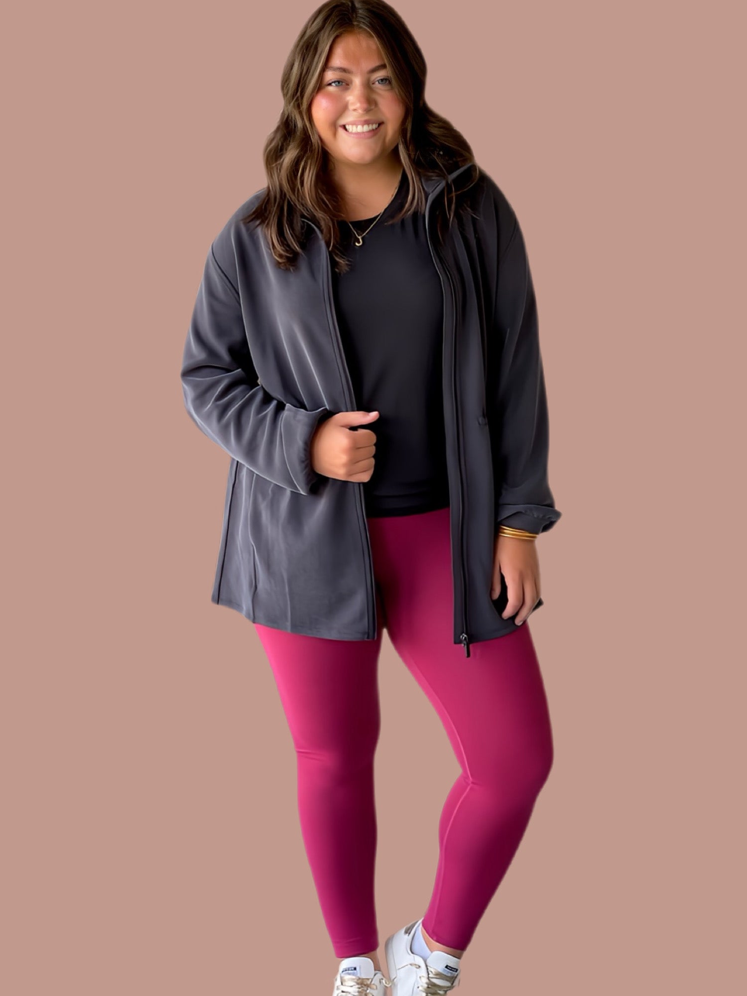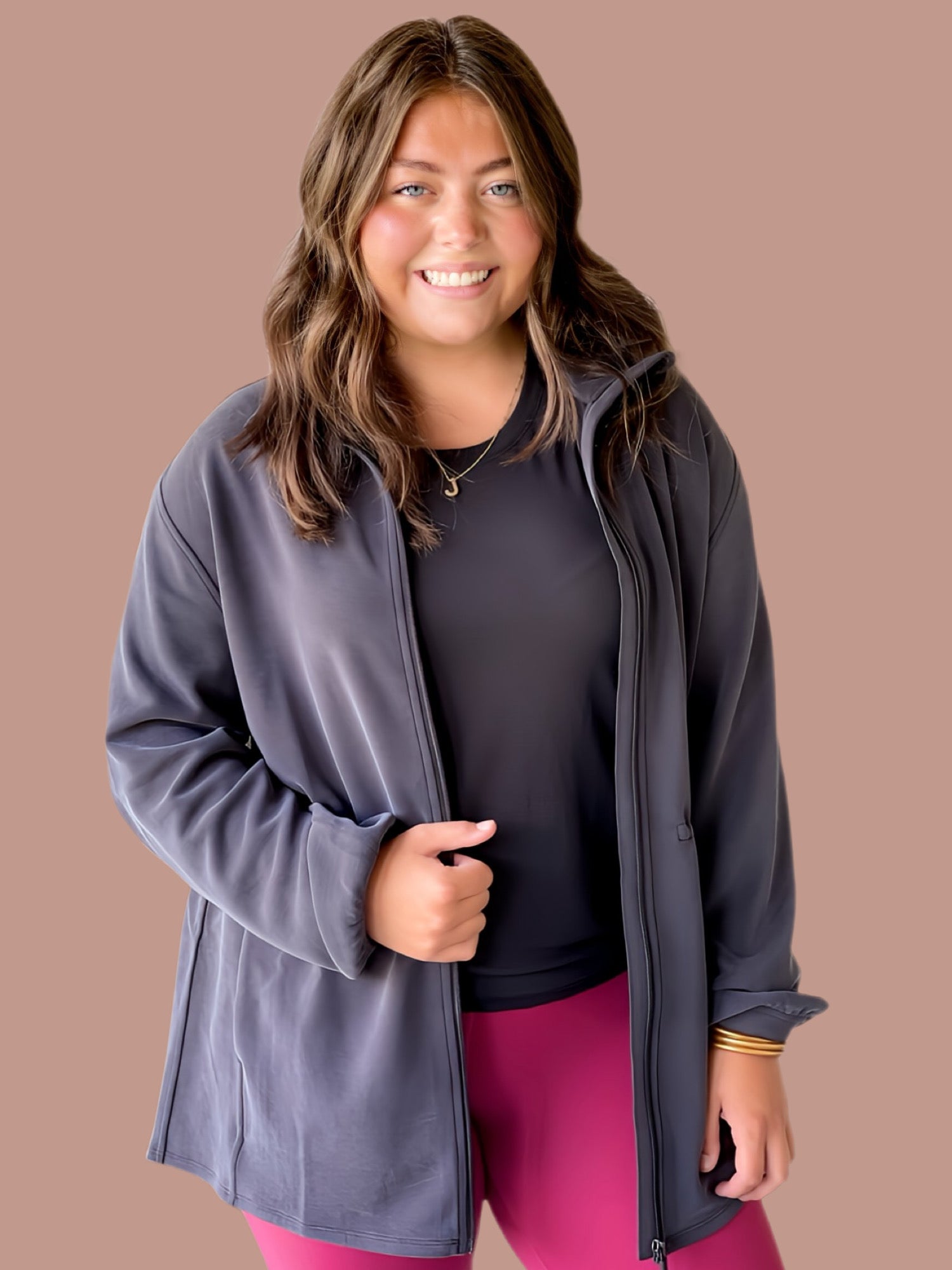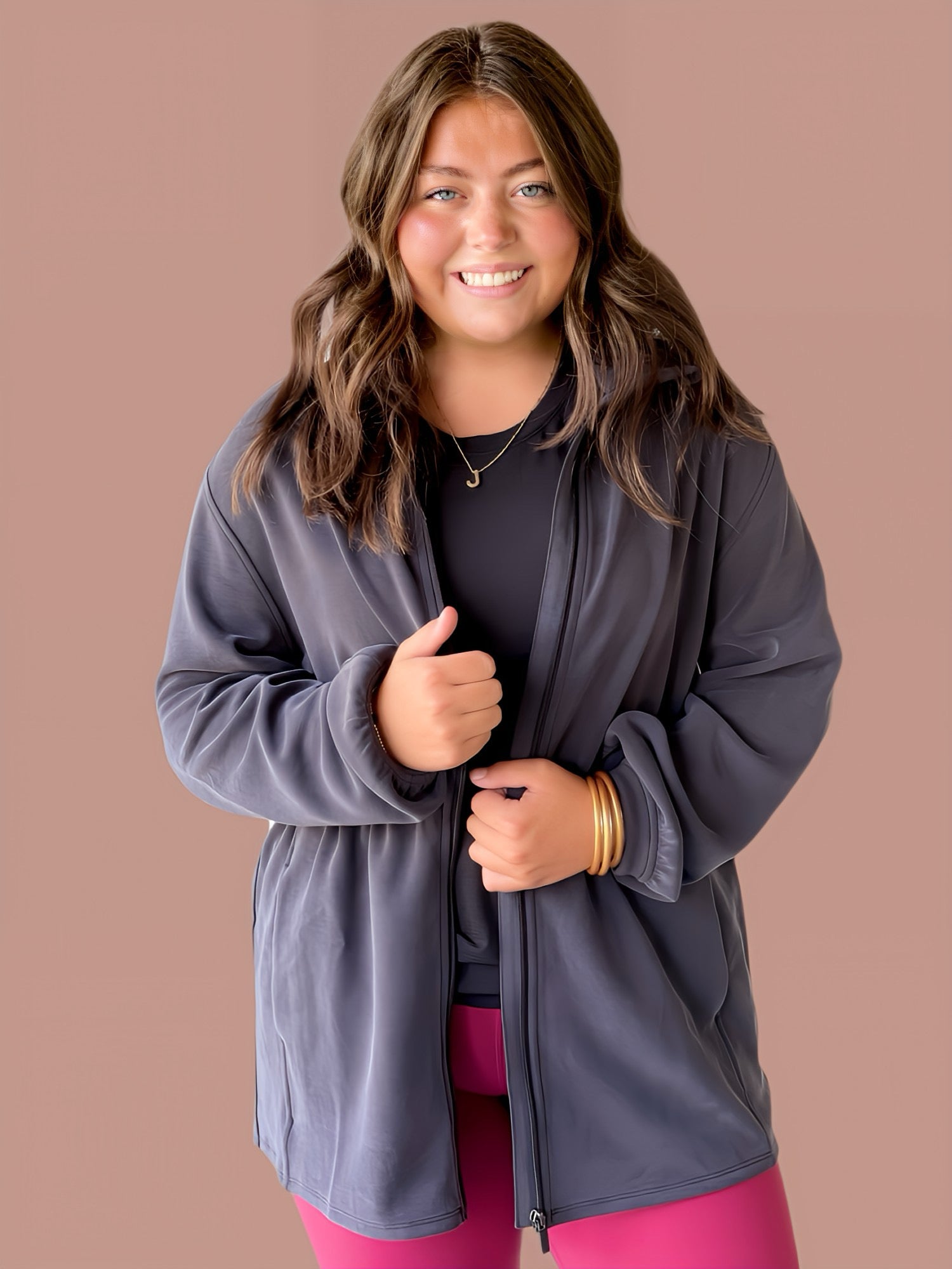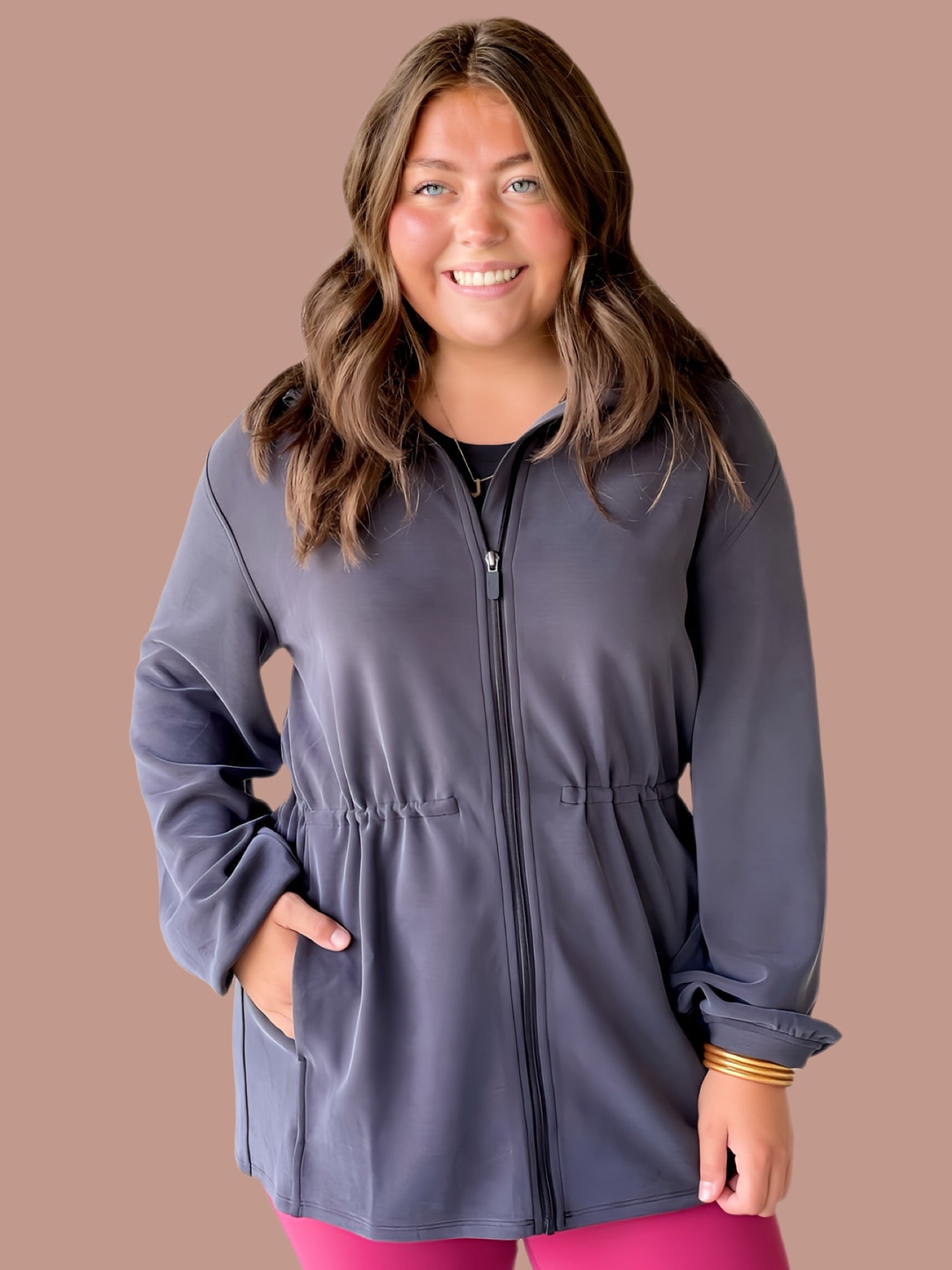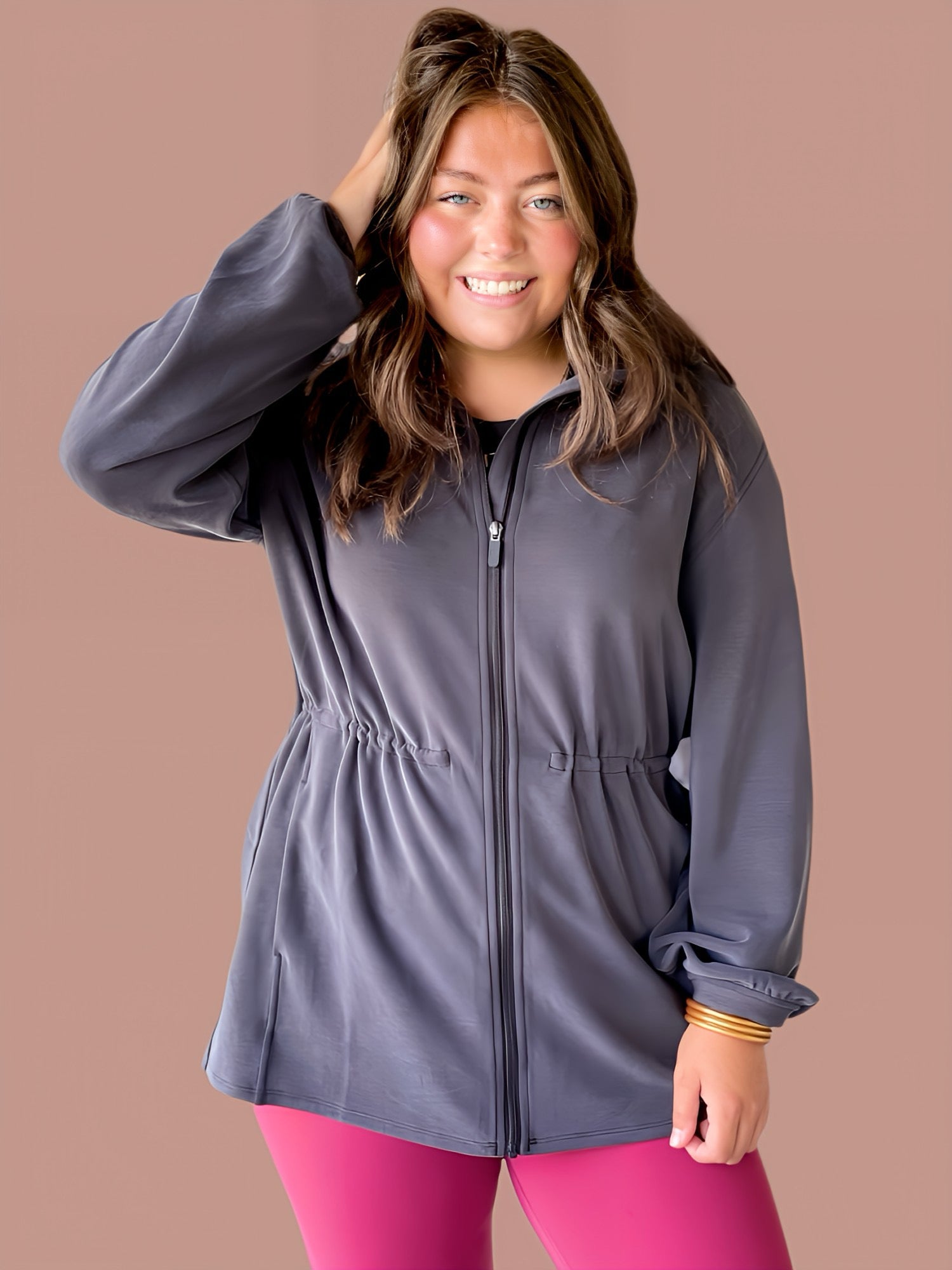 Style in a cinch. This funnel-neck jacket has a voluminous design with an inner cinchable waist drawcord so you can adjust your look.