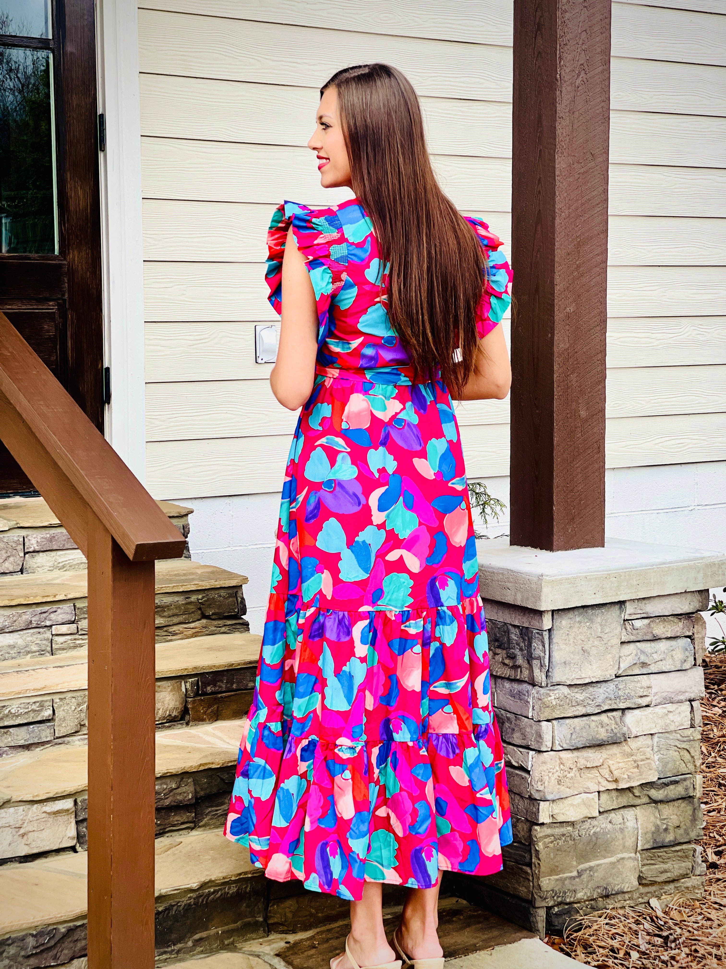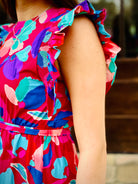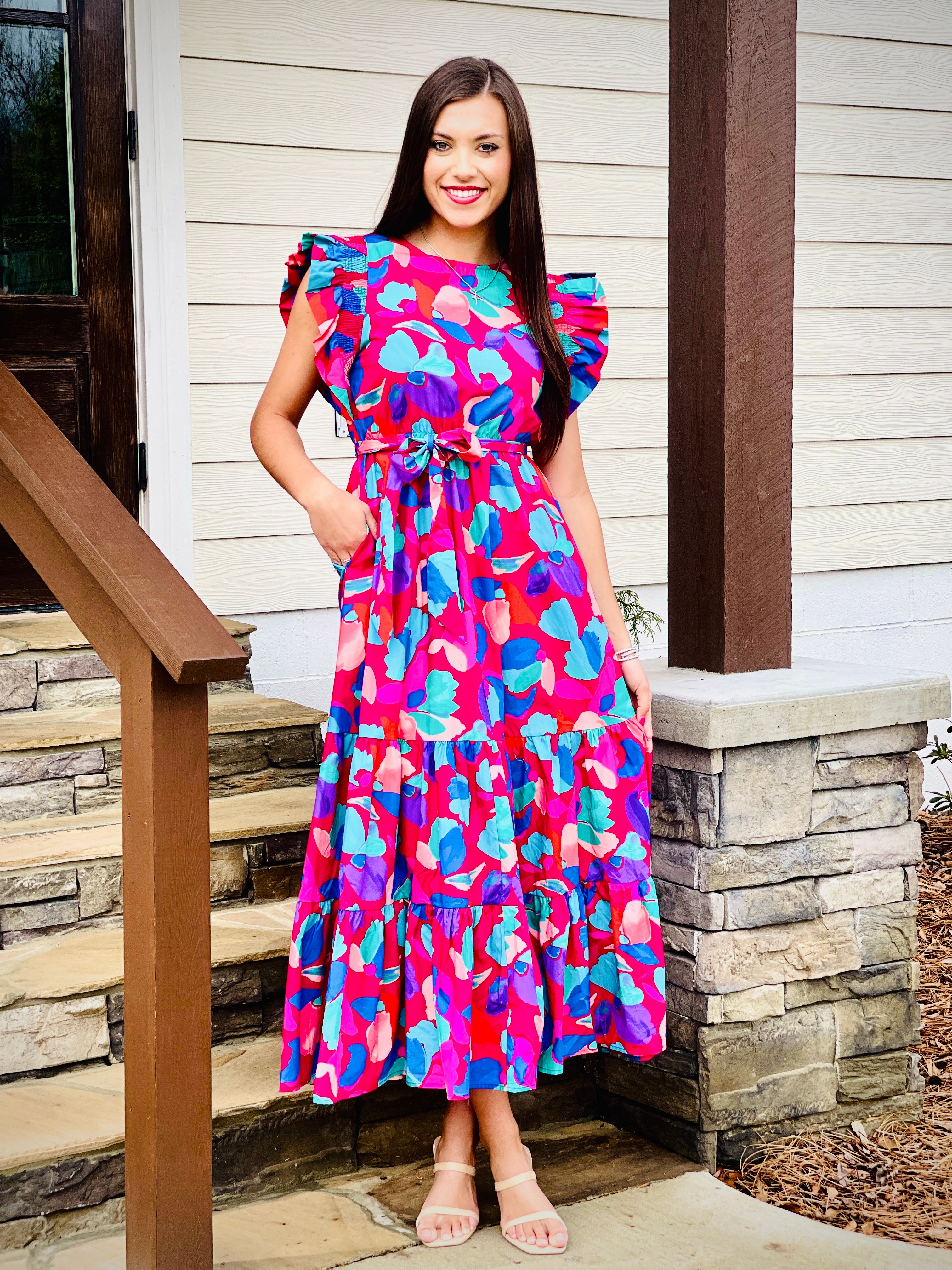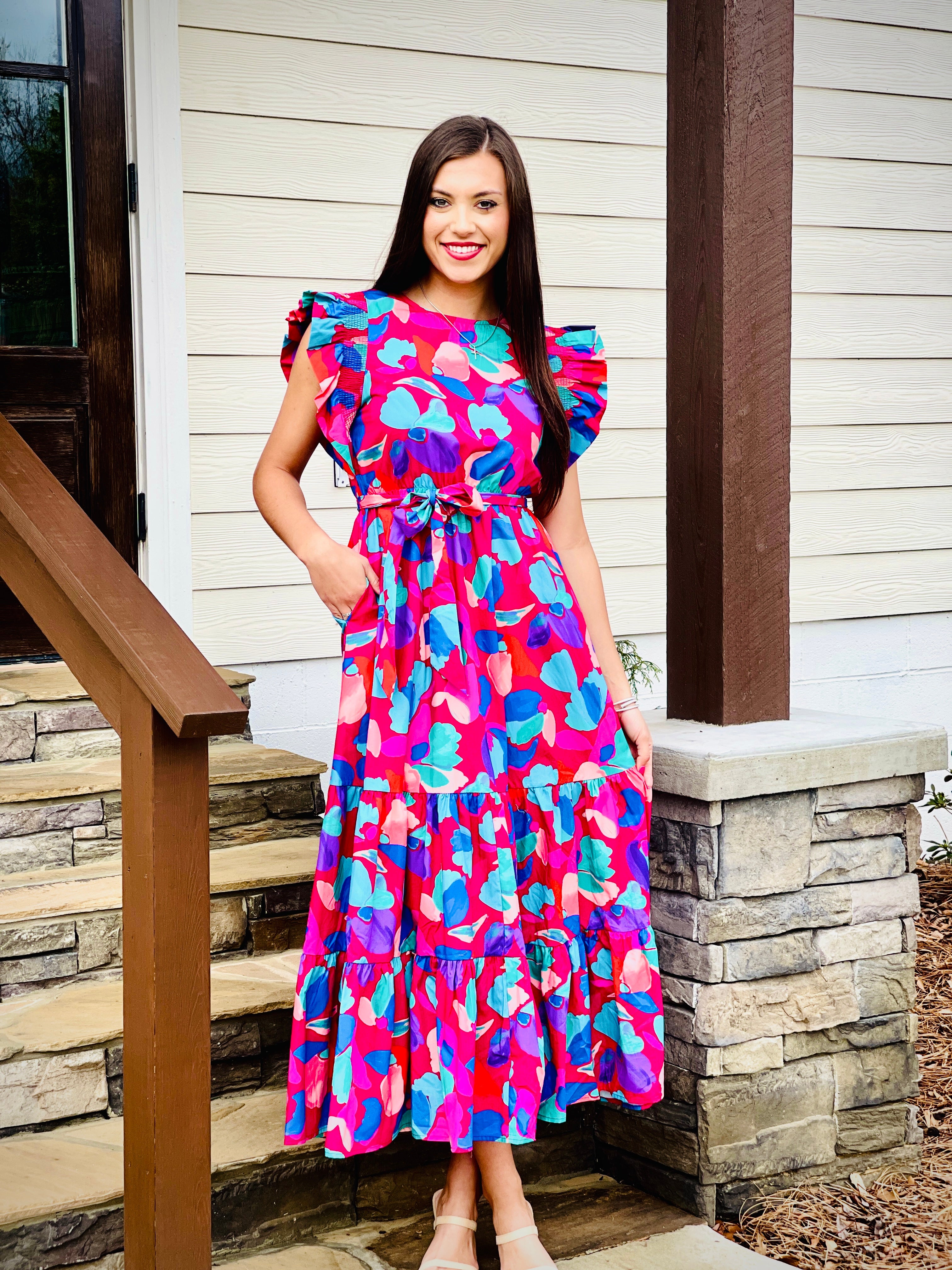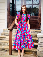 A must-have for your summer wardrobe, our Floral Waist Tie Maxi Dress is crafted from lightweight poplin and features a chic mock neck design and feminine shoulder ruffle. The tiered silhouette and waist tie add a touch of effortless elegance, while the colorful floral print pattern adds a playful yet sophisticated touch. Perfect for any occasion, this dress is sure to be a staple piece this season.