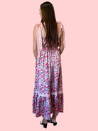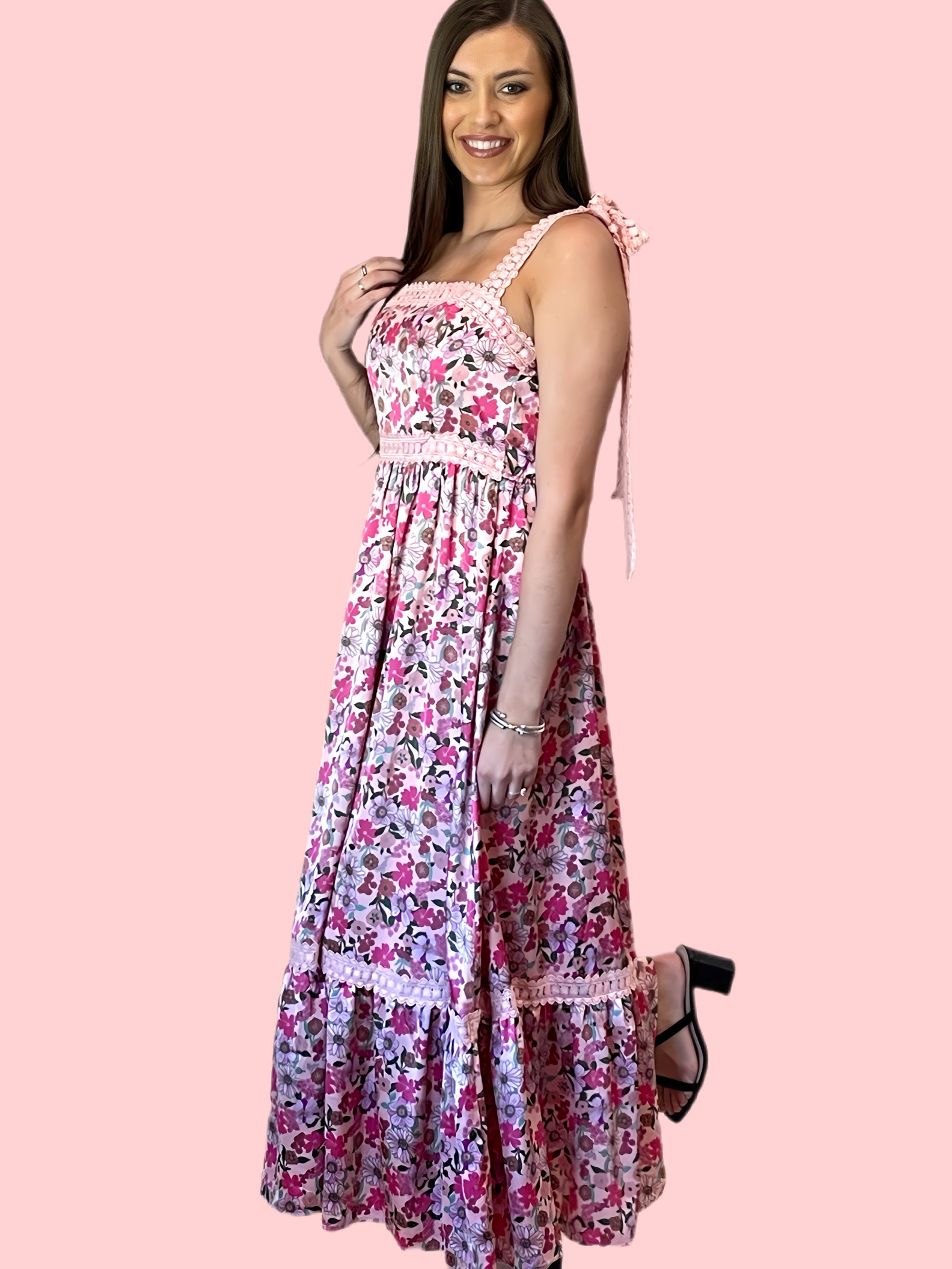 Expertly crafted with a flattering floral design, this maxi dress is perfect for any occasion. The ribbon tie and lace strap add delicate details to this stylish piece. Made with high-quality materials, this dress is comfortable and durable. Elevate your wardrobe with this versatile and elegant dress.