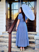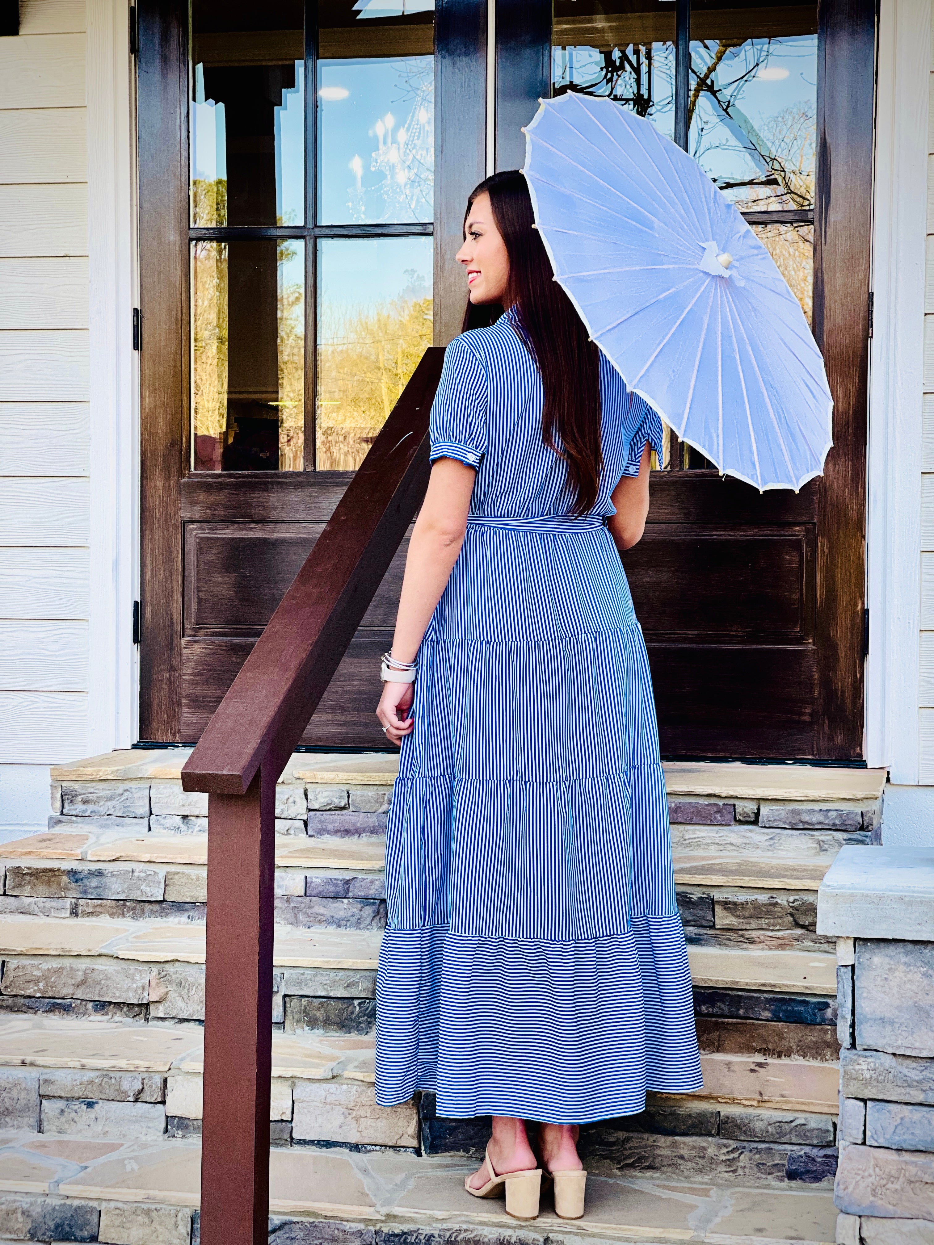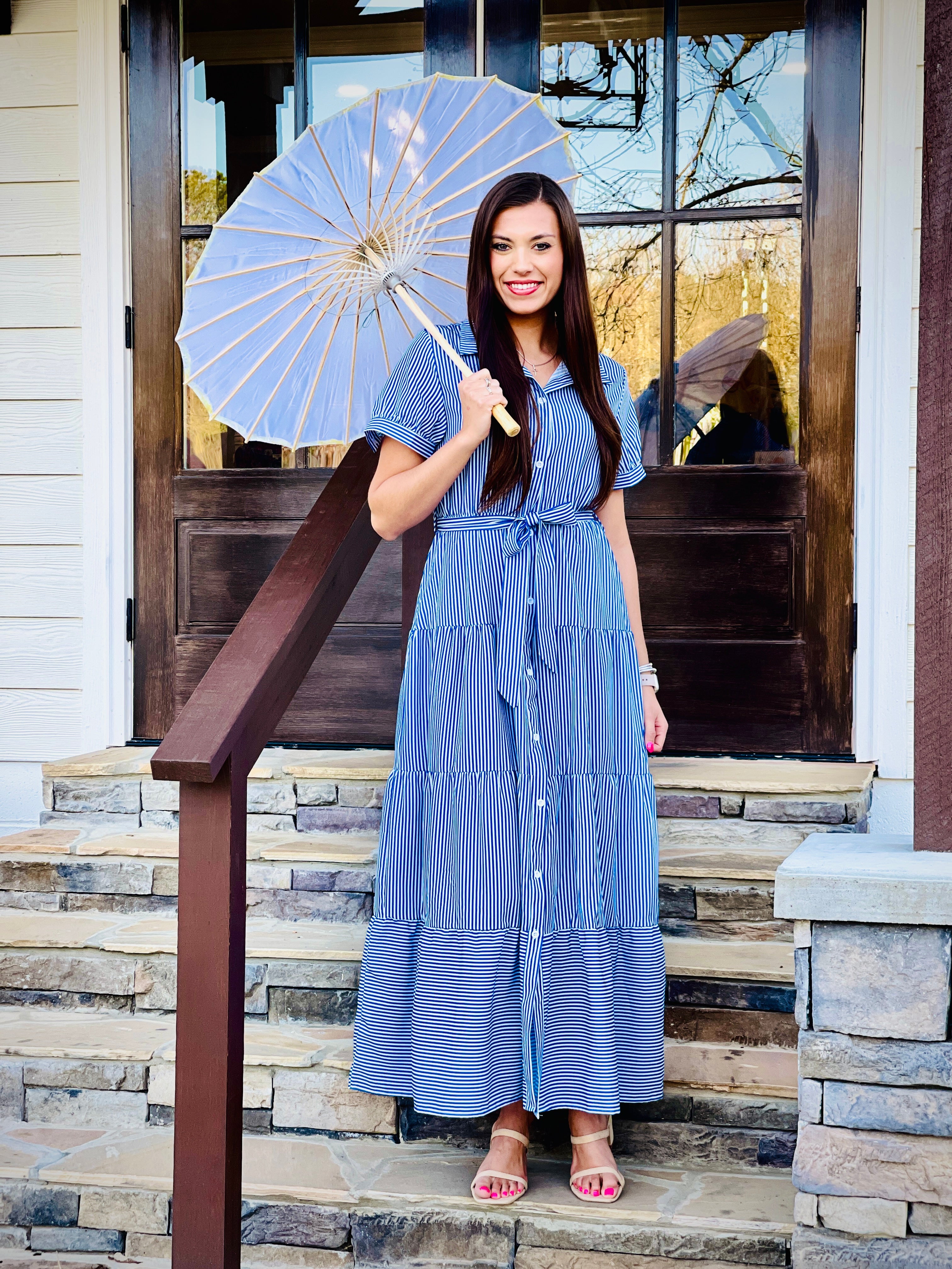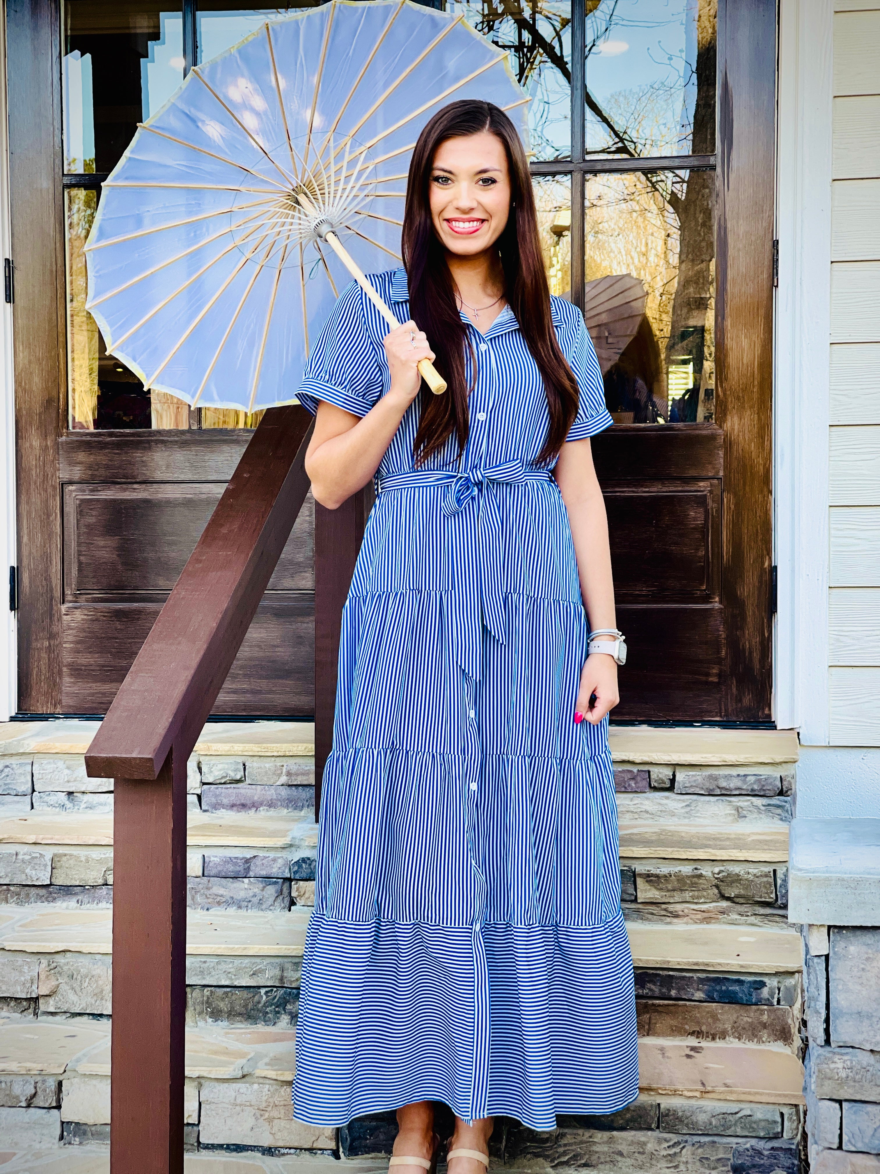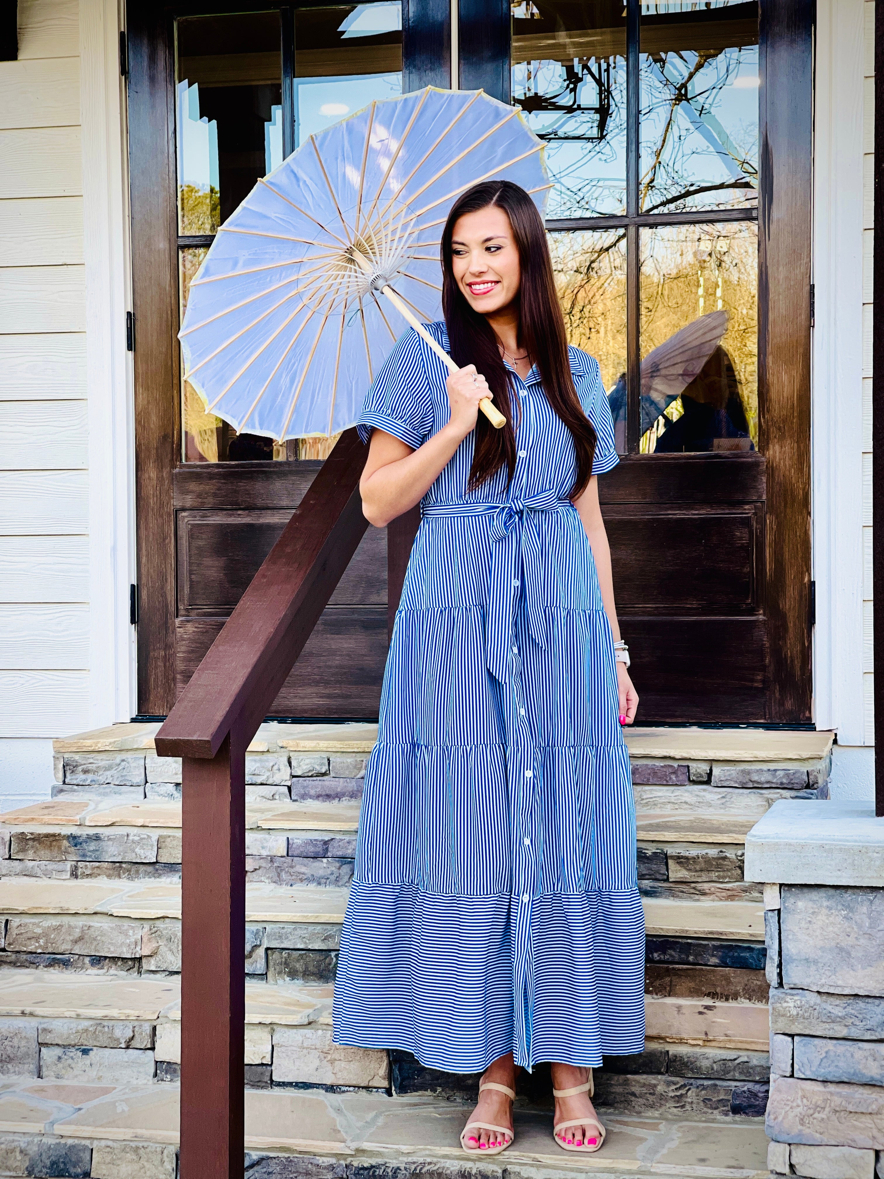 This versatile maxi dress features a classic pattern, adding a touch of sophistication to any setting. The button front design allows for customizable style while the shirt collar adds structure and elegance, making it suitable for casual or semi-formal occasions. The belted waist defines and accentuates your silhouette for a flattering, feminine look.