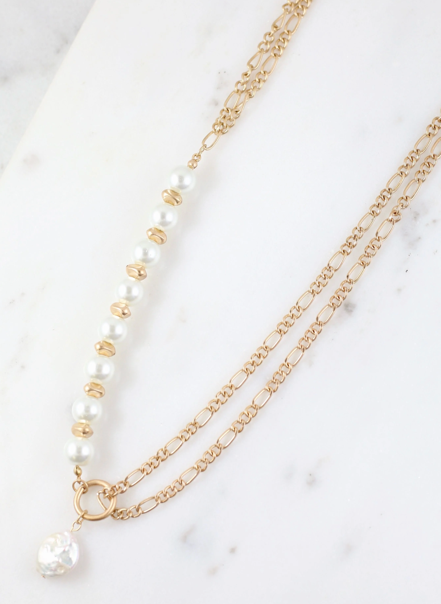 This necklace has a unique look. It features pearls on one side and a double stranded accent on the other. There is also a freshwater pearl drop accent.