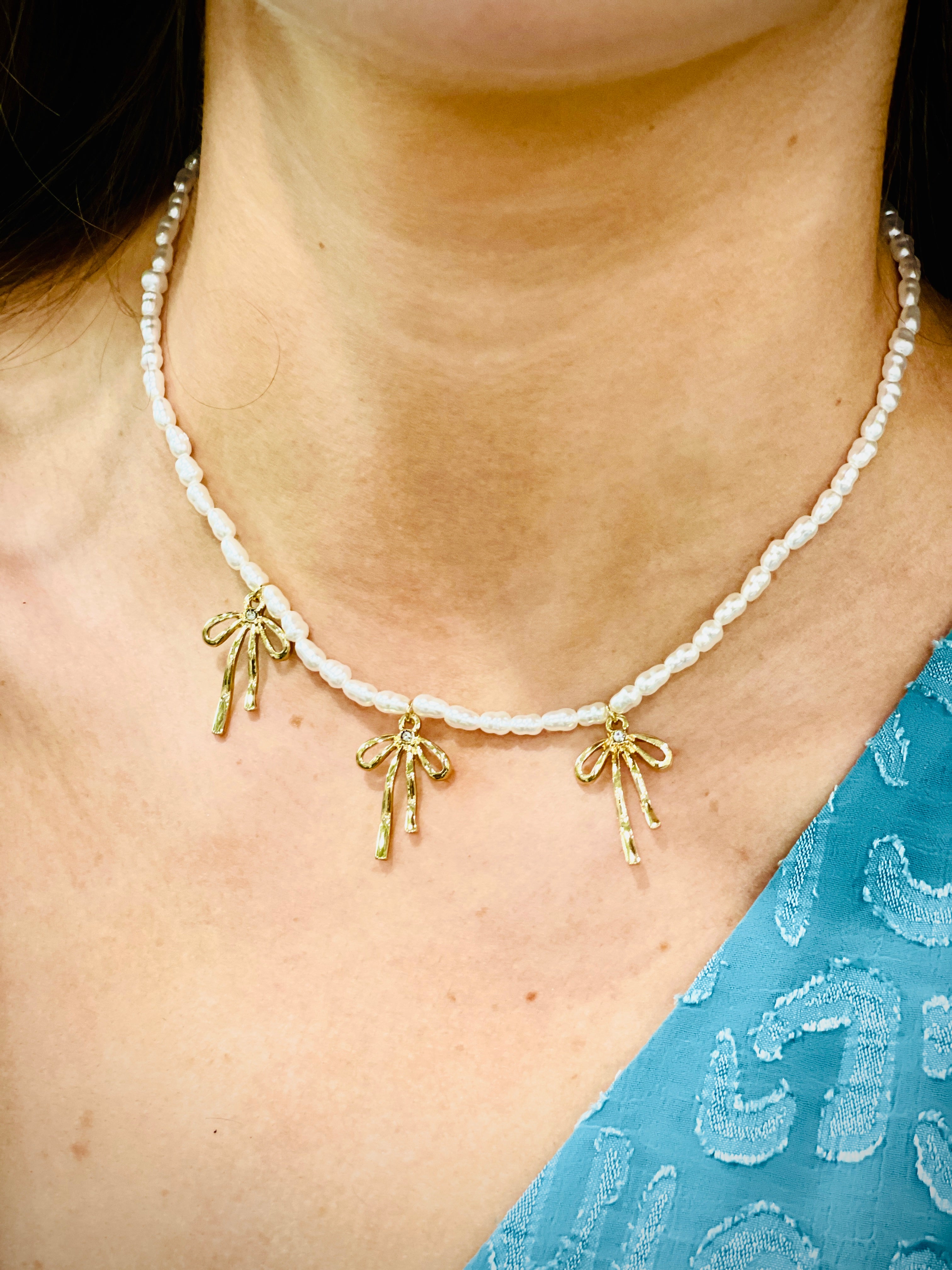 Enhance your look with this elegant and timeless Stationed Bow & Pearl Necklace. Featuring a fresh pearl and metal material, this necklace boasts a classic design that will never go out of style. With a convenient lobster clasp closure and a length of 15", this piece is perfect for any occasion.
