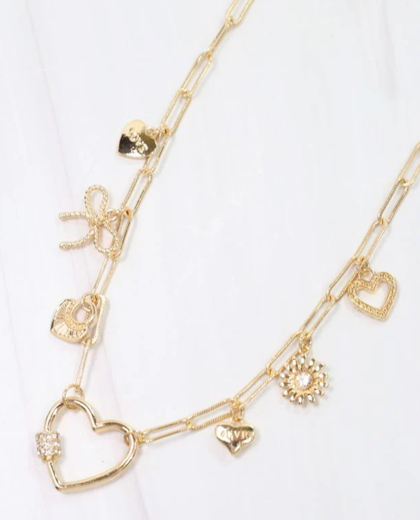 This textured link necklace features an array of charms that blend so well together. Wear for an everyday casual look or for a dressy occasion.