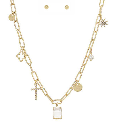 Add some elegance to your outfit with our Square Glass & Multi Charm Necklace Set. Made with high-quality metal, faux pearls, and glass, it features a secure lobster clasp and measures 16" in length. Perfect for any occasion, this set is finished with a chic post design.