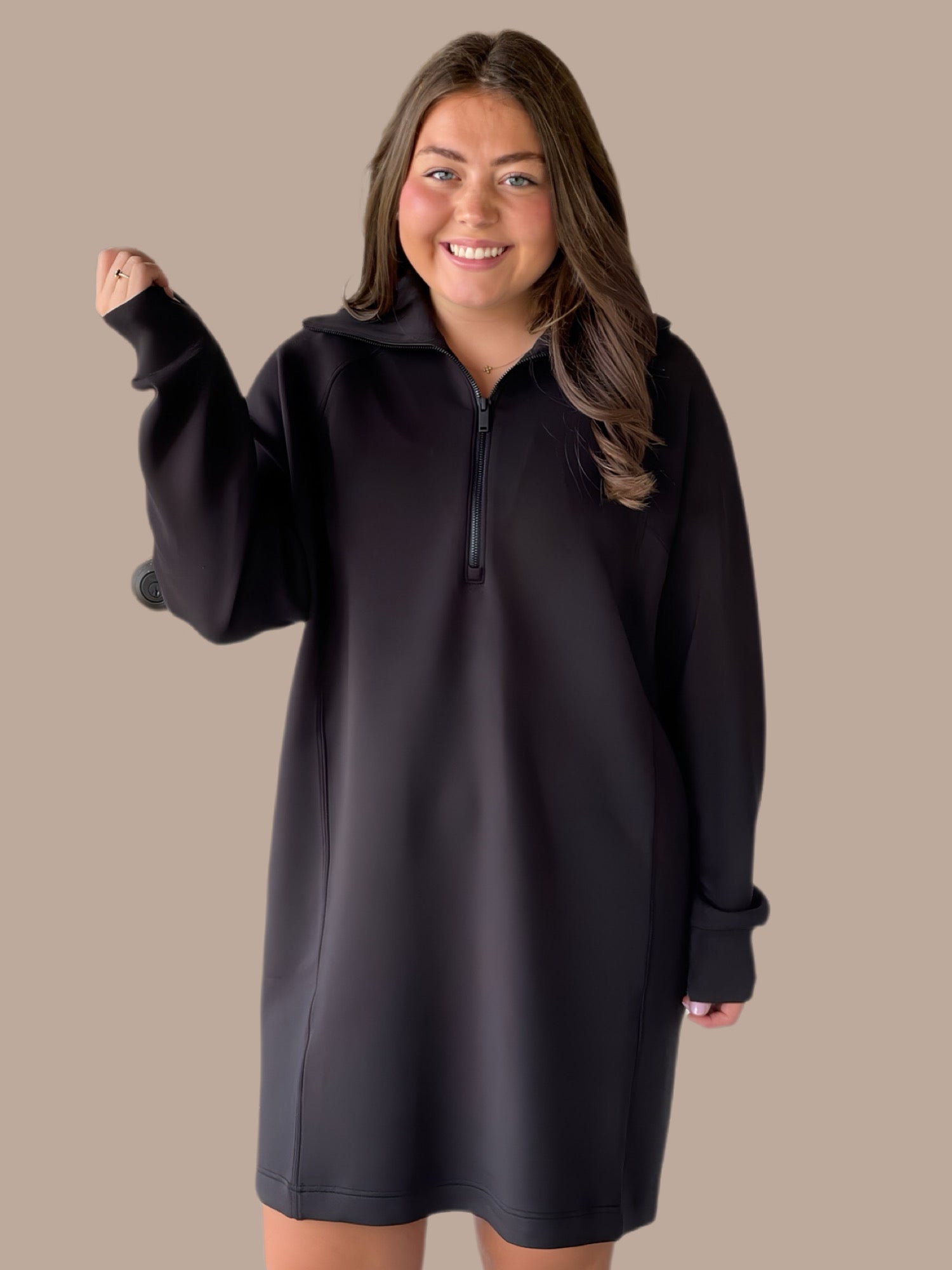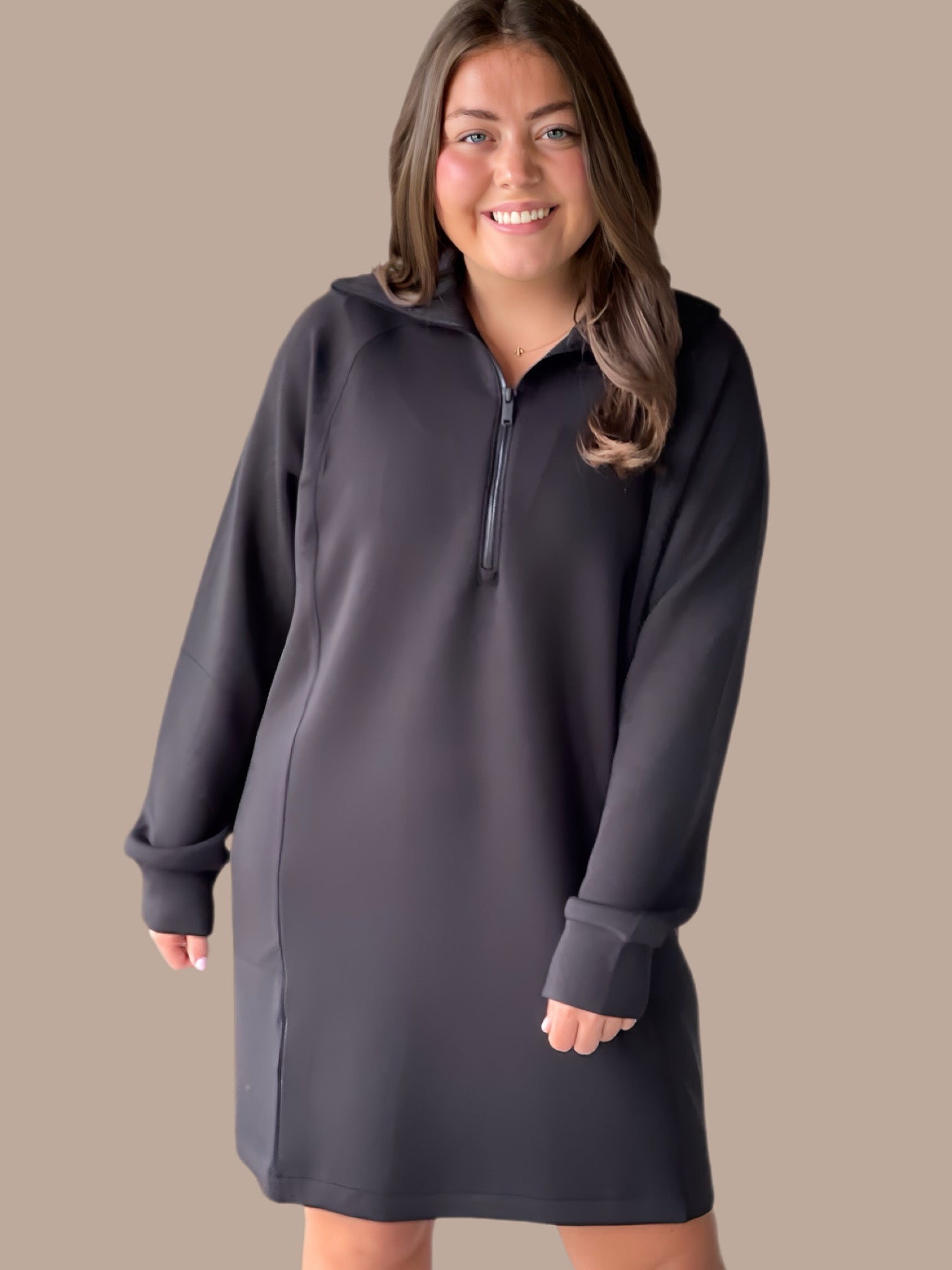 The SPANX Ae Half Zip Dress in Black from the Airessentials collection combines comfort and style with its lounge-inspired design. Crafted to provide a sleek silhouette, this dress features a convenient half-zip detail, enhancing versatility and ease of wear. Its breathable fabric ensures all-day comfort, making it an ideal choice for both relaxed and polished looks. Perfect for those seeking functional elegance in their wardrobe.
