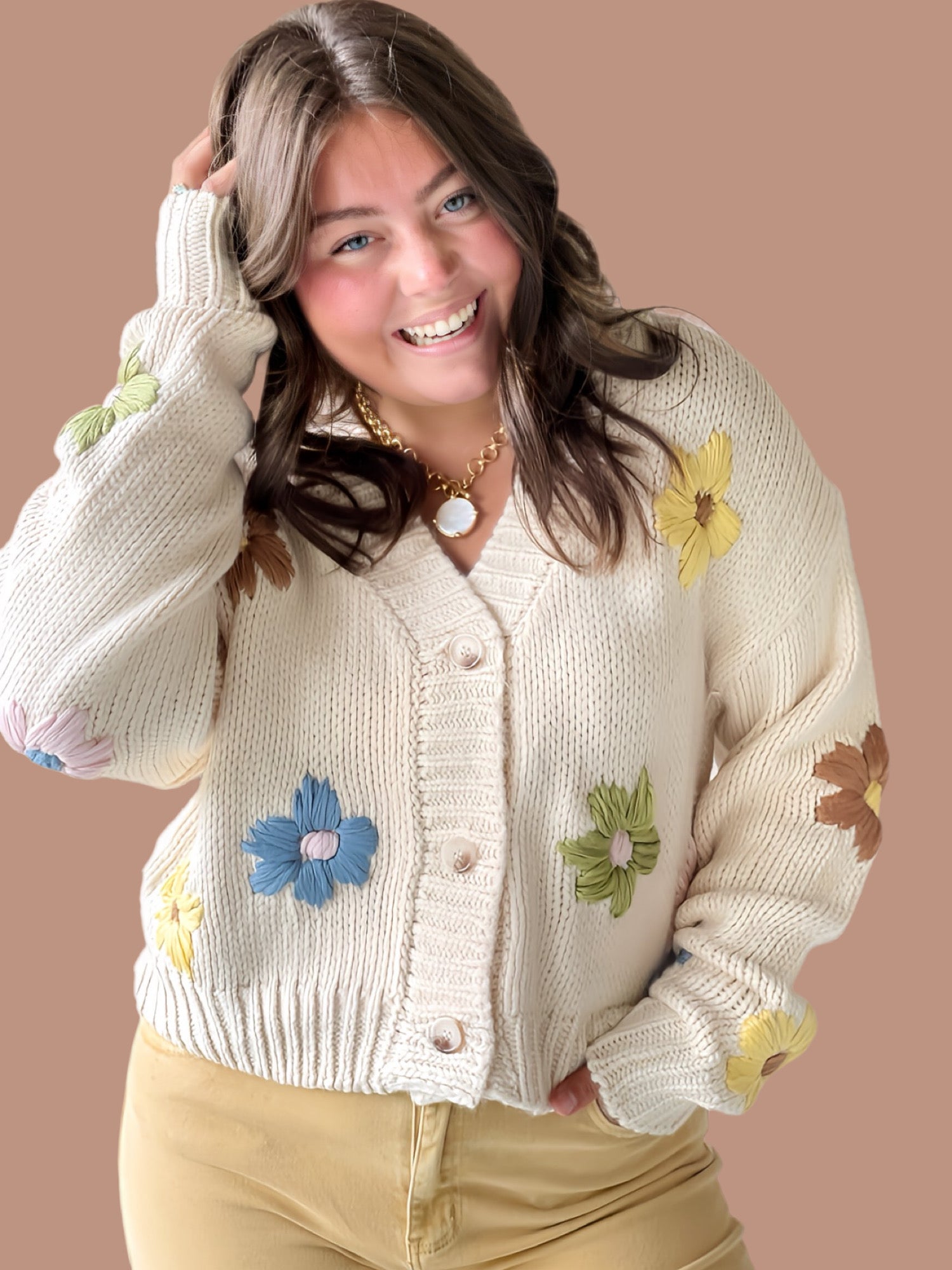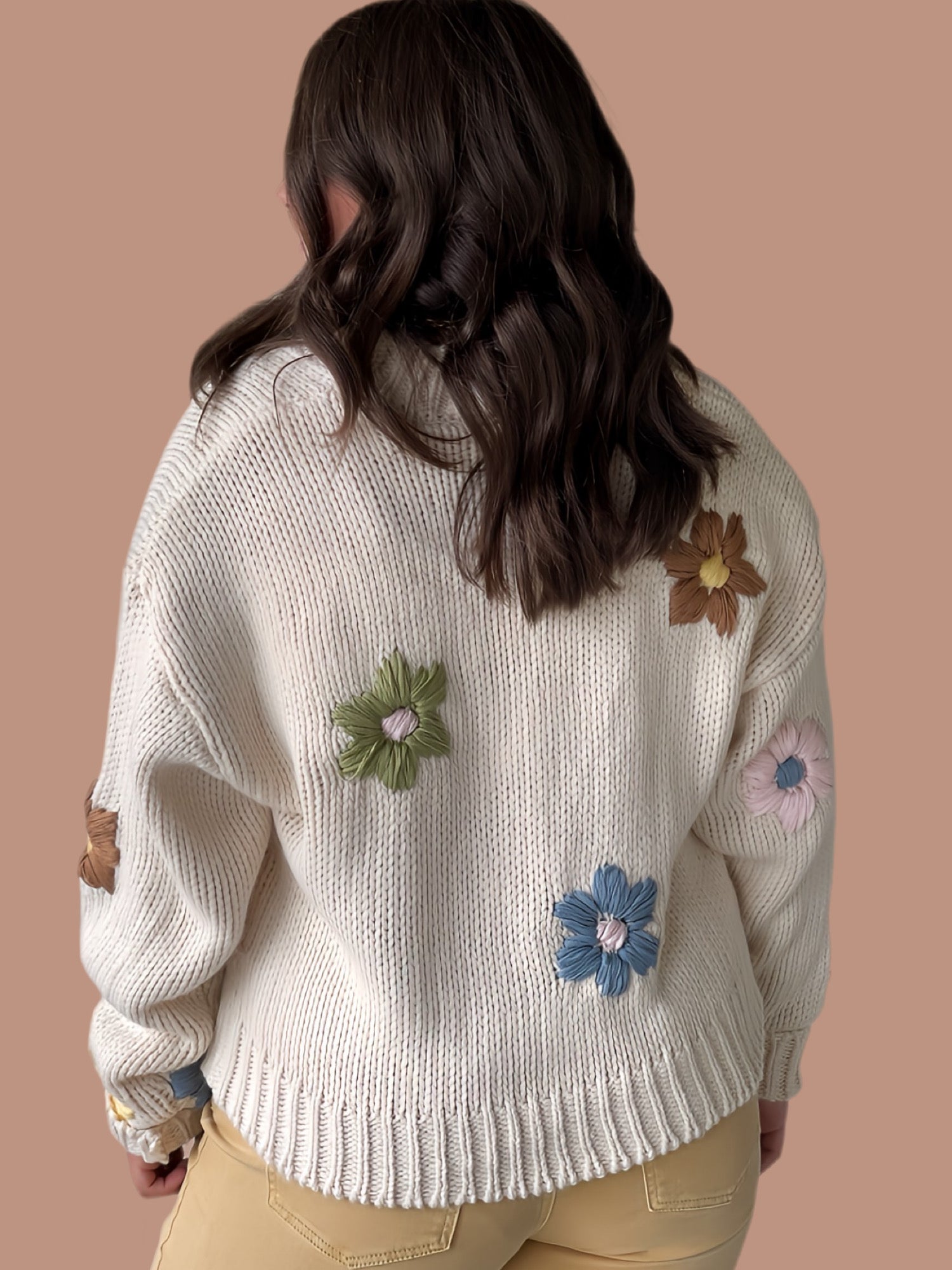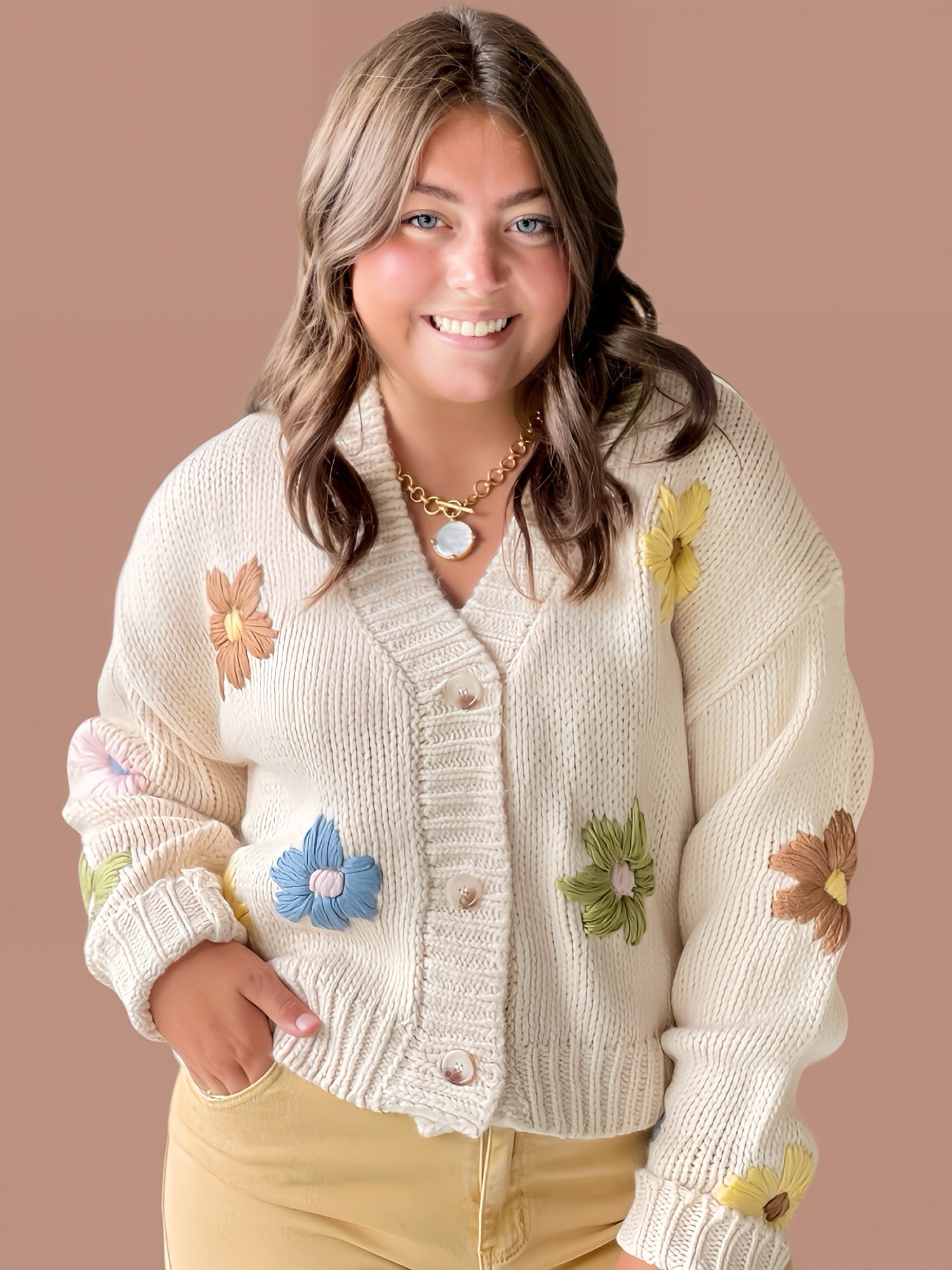 This Bloom & Button Knit Cardigan combines cozy comfort with artistic detail. Crafted with chunky knit fabric, it showcases oversized multicolor embroidered floral appliques that add a vibrant, textured dimension. The deep V-neckline and button-down front offer classic styling, while dropped shoulders and ribbed trim enhance its relaxed, whimsical appeal. Perfect for layering, this cardigan brings both warmth and a sophisticated, playful touch to your wardrobe.