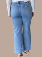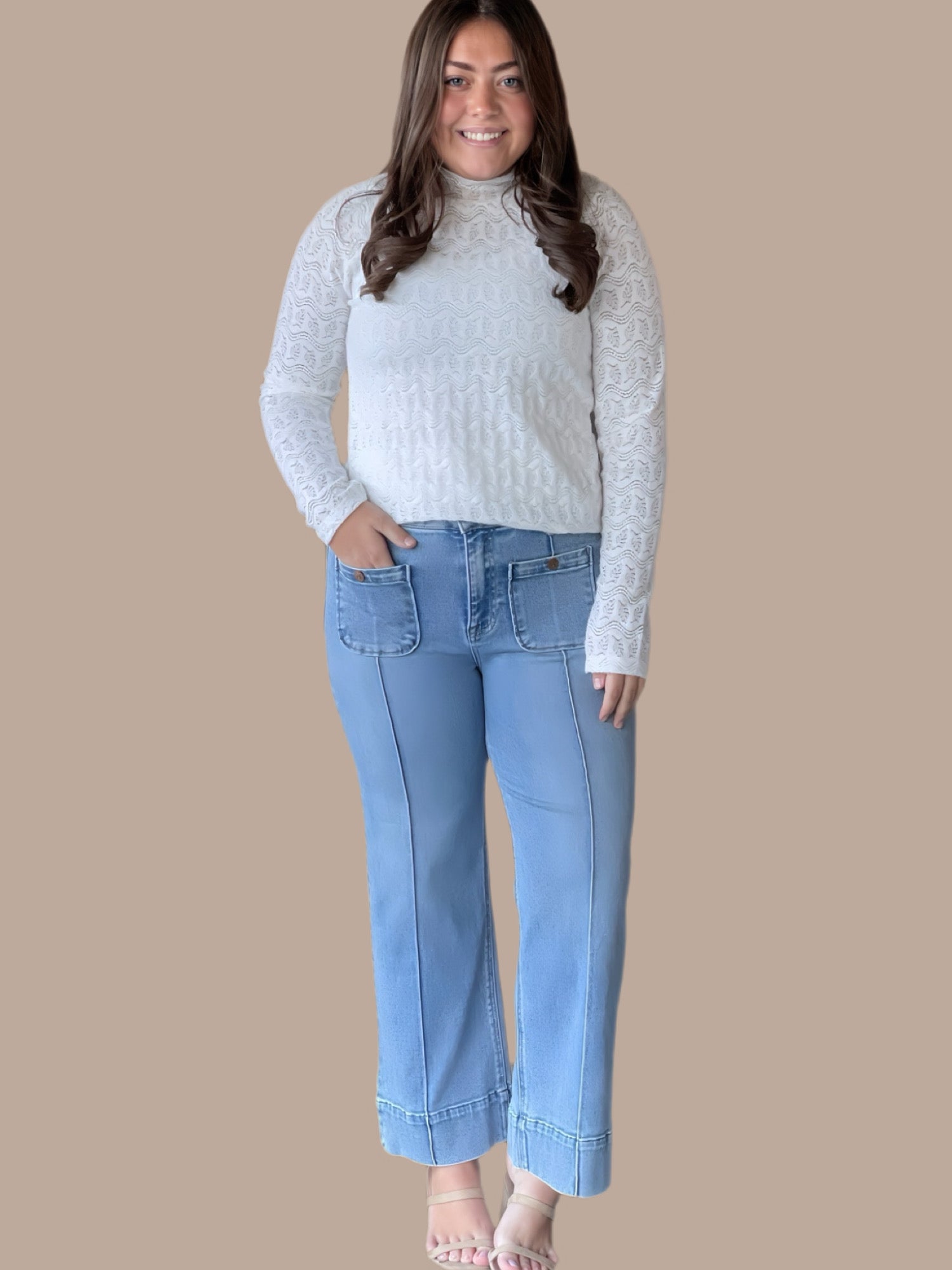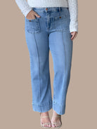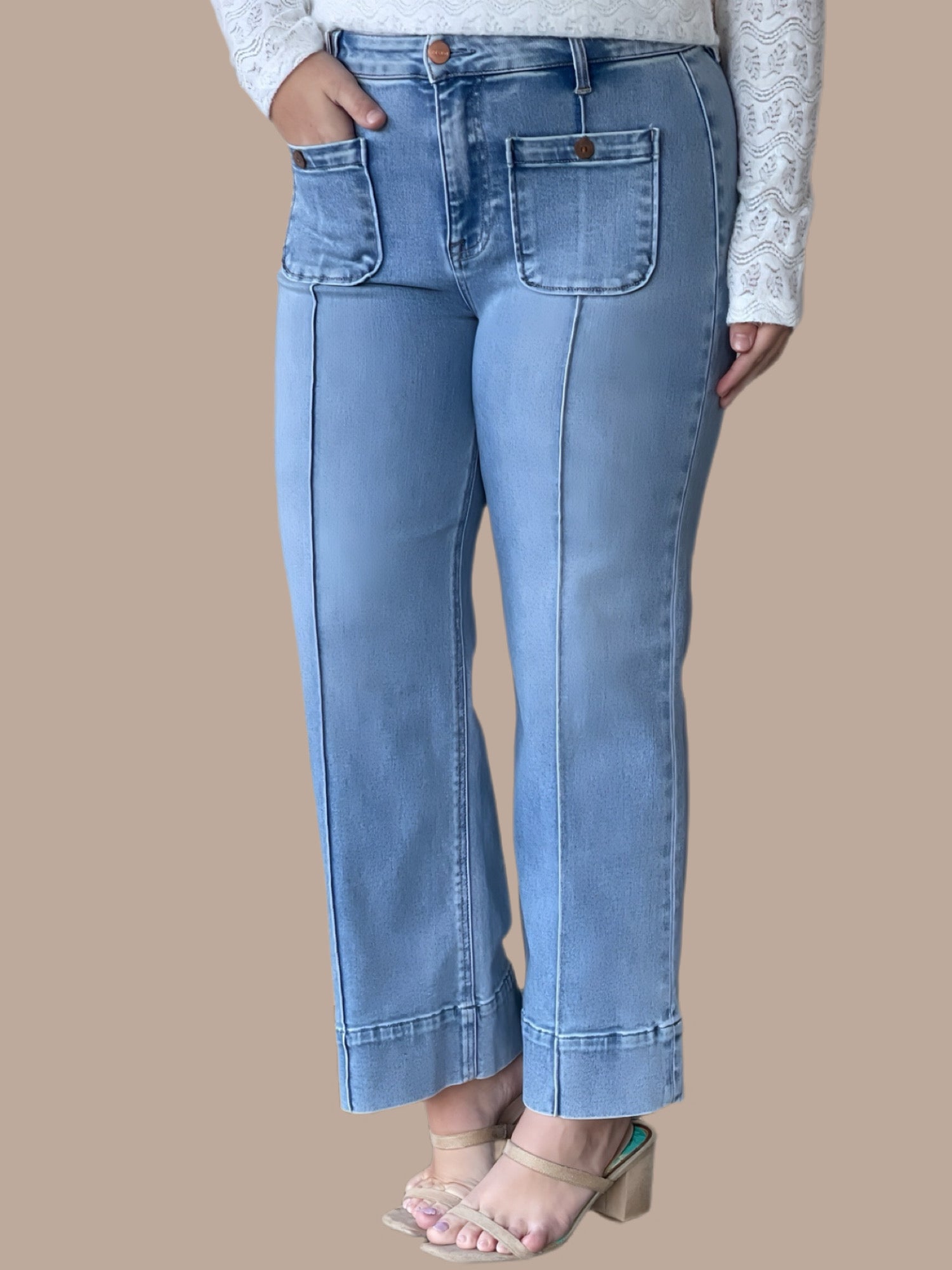 These high-rise crop wide jeans combine contemporary silhouette with refined tailoring details. The front pintuck design adds vertical dimension and a polished aesthetic, while patch pockets deliver functional style. The cropped length works seamlessly with sneakers or heels, making this versatile piece a wardrobe essential. The wide-leg cut offers comfortable movement without sacrificing sophistication. Perfect for elevating casual outfits or dressing down more formal pieces.