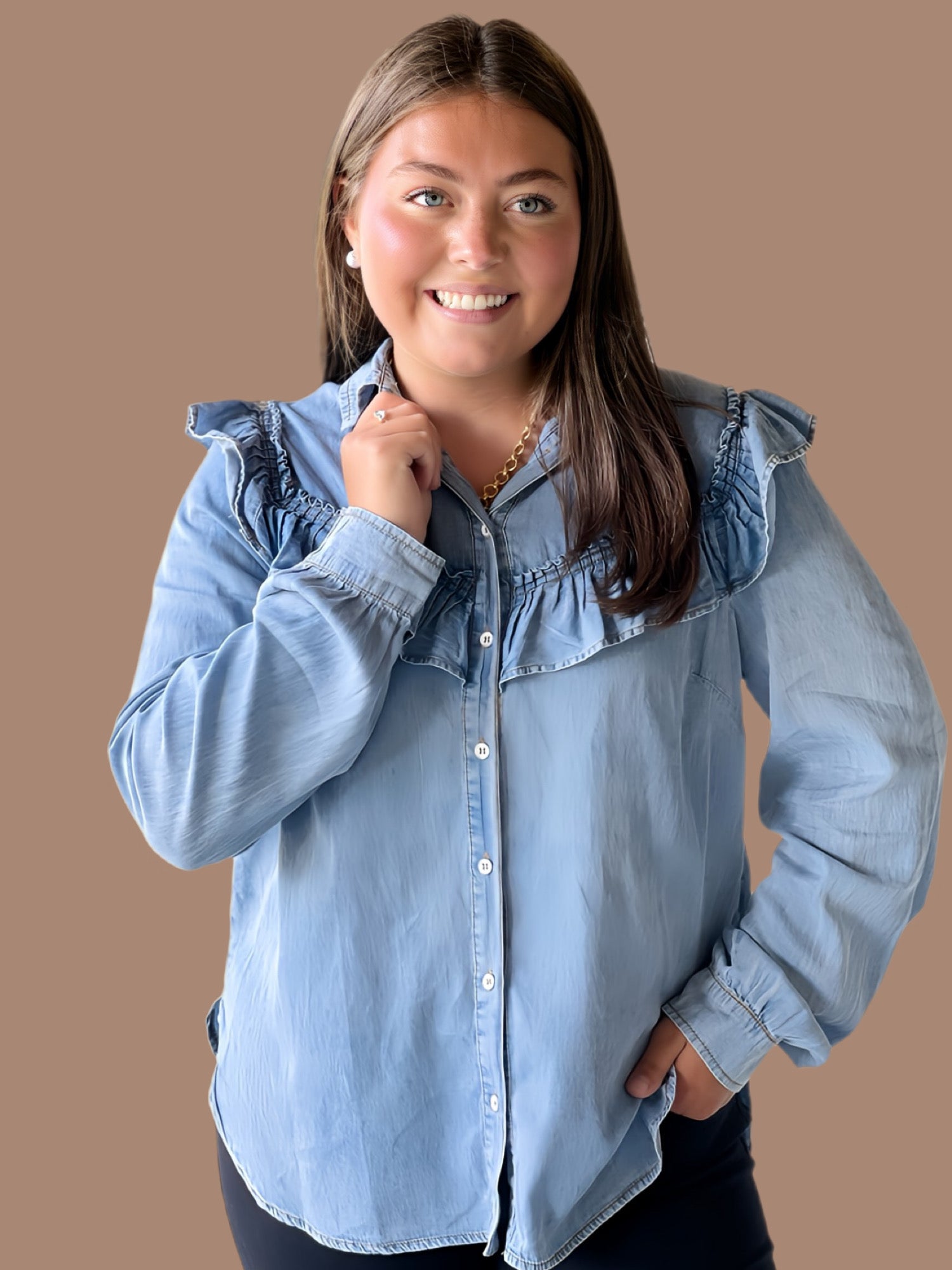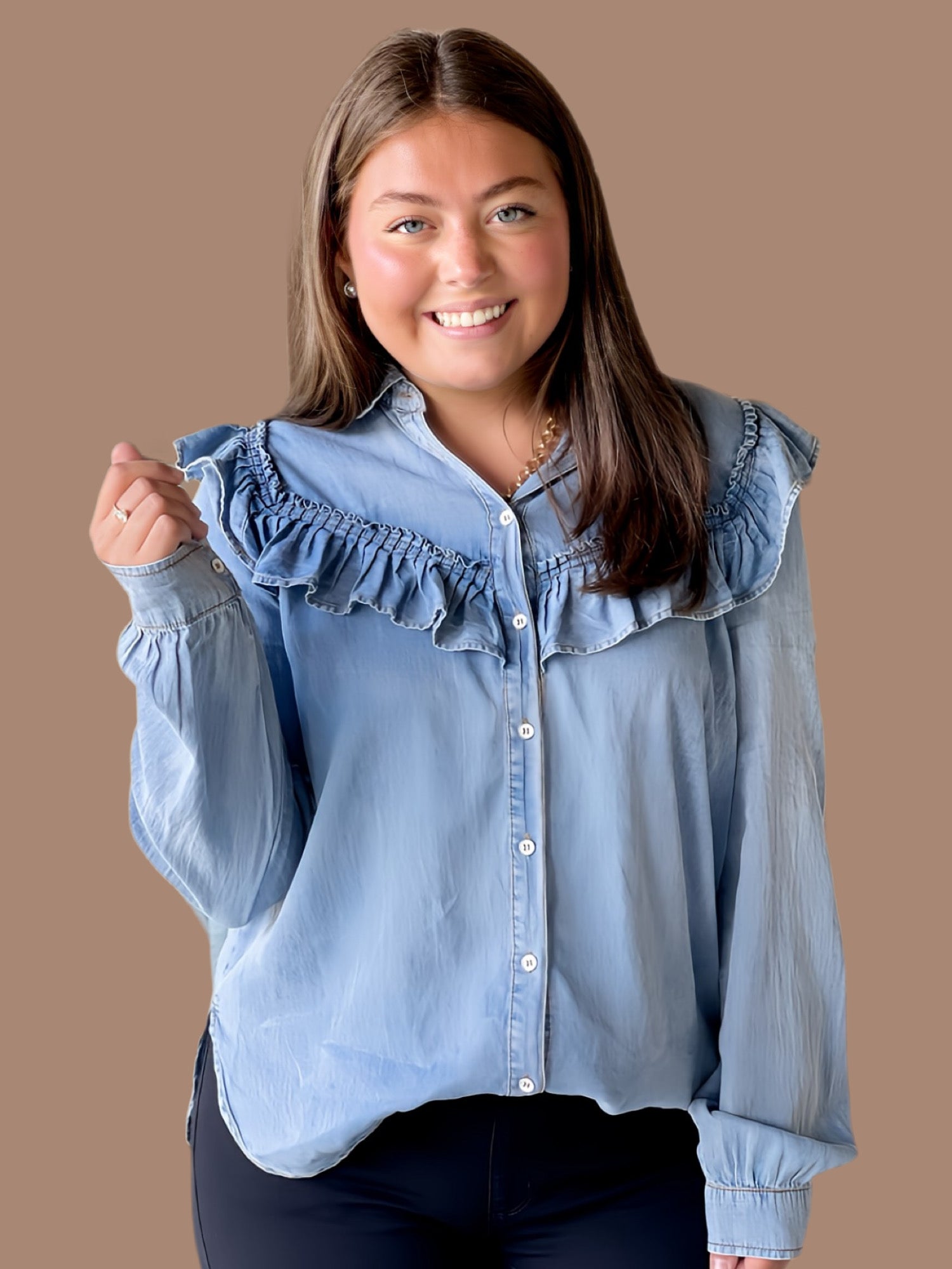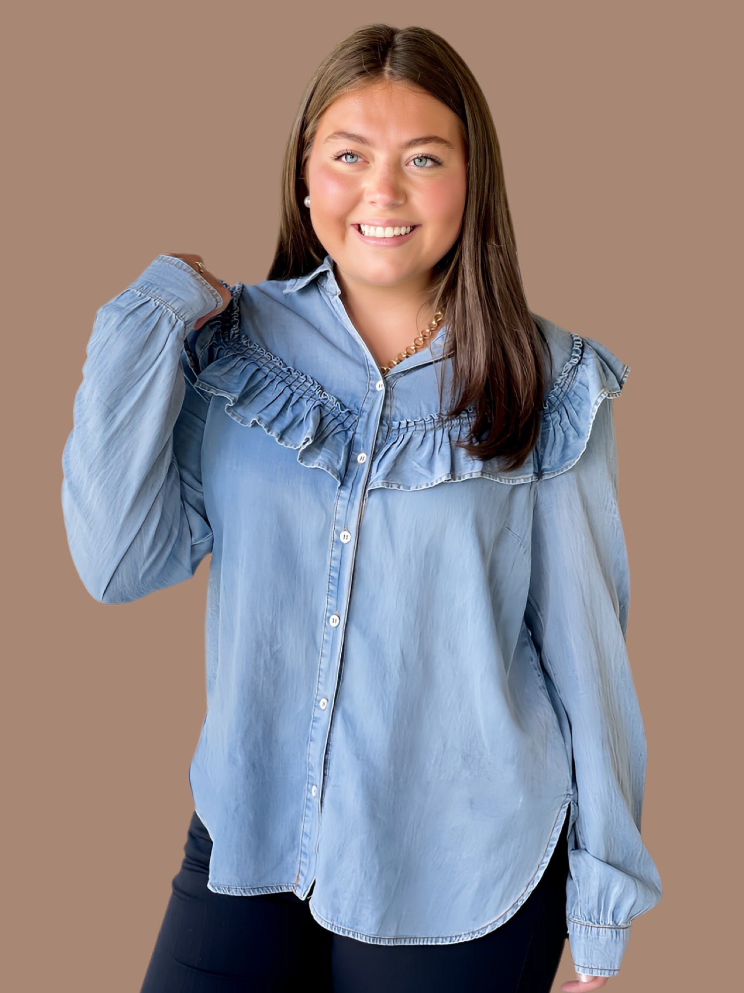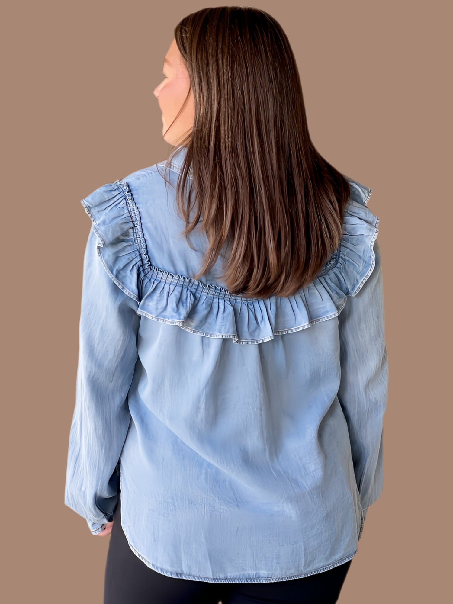 Softly feminine with a vintage edge, this chambray button-up is crafted with an enzyme, stone, bleach, and snow wash process for a beautifully worn-in finish. A collared neckline and buttoned long sleeves keep the look classic, while the shirred ruffle yoke wrapping around the shoulders and back adds a delicate twist. The curved high-low hem with subtle side slits creates an easy, flattering drape, making it perfect for pairing with denim, skirts, or layered over leggings.