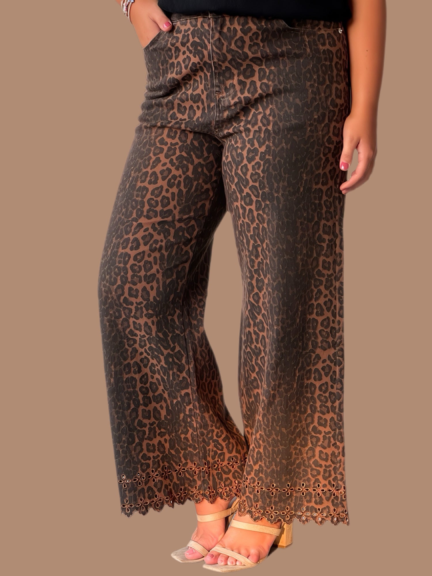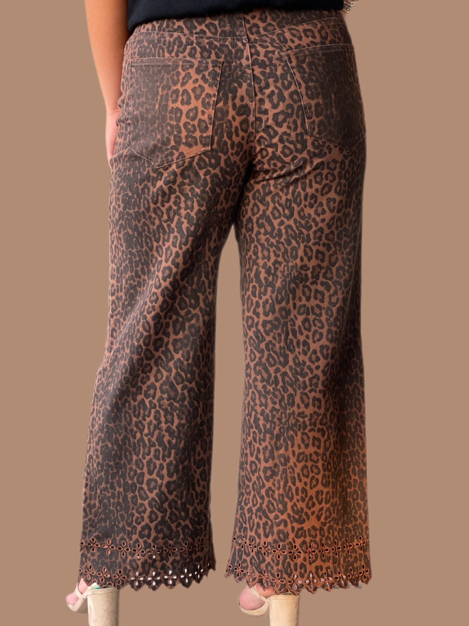 These leopard pattern pants combine bold style with delicate detail, featuring a floral embroidered hem for a refined finish. Crafted from lightweight woven fabric, they offer comfort and breathability while maintaining opacity. The button zip-fly front and classic denim pockets provide practical, familiar wearability. Unlined and designed for everyday versatility, these pants are a sophisticated choice for those seeking a statement piece with expert craftsmanship.