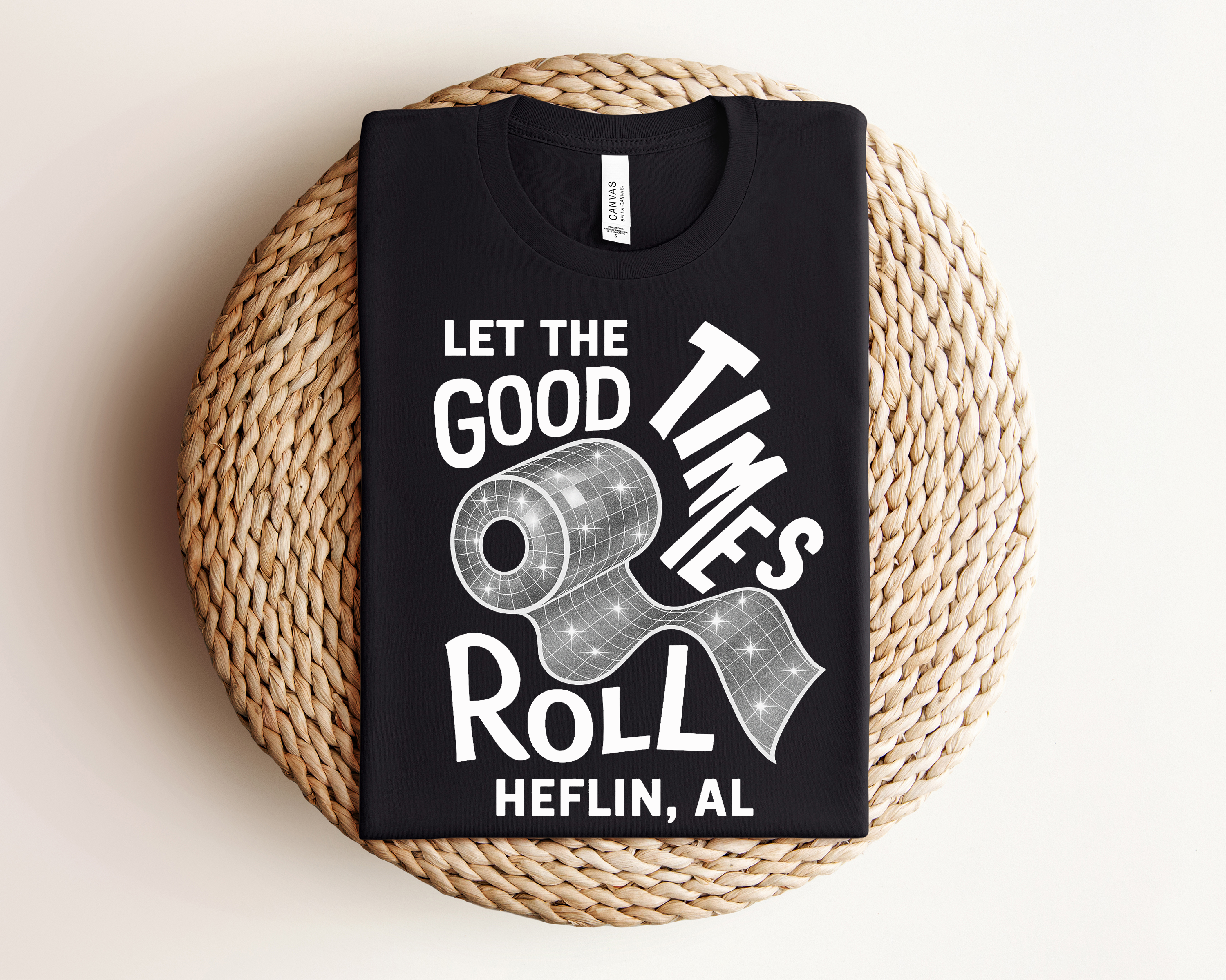 Celebrate with the Let the Good Times Roll Graphic Tee, showcasing our exclusive design inspired by the Heflin Toilet Paper War. Proudly crafted in-house at our Heflin, AL storefront, this tee embodies local spirit and unique storytelling.