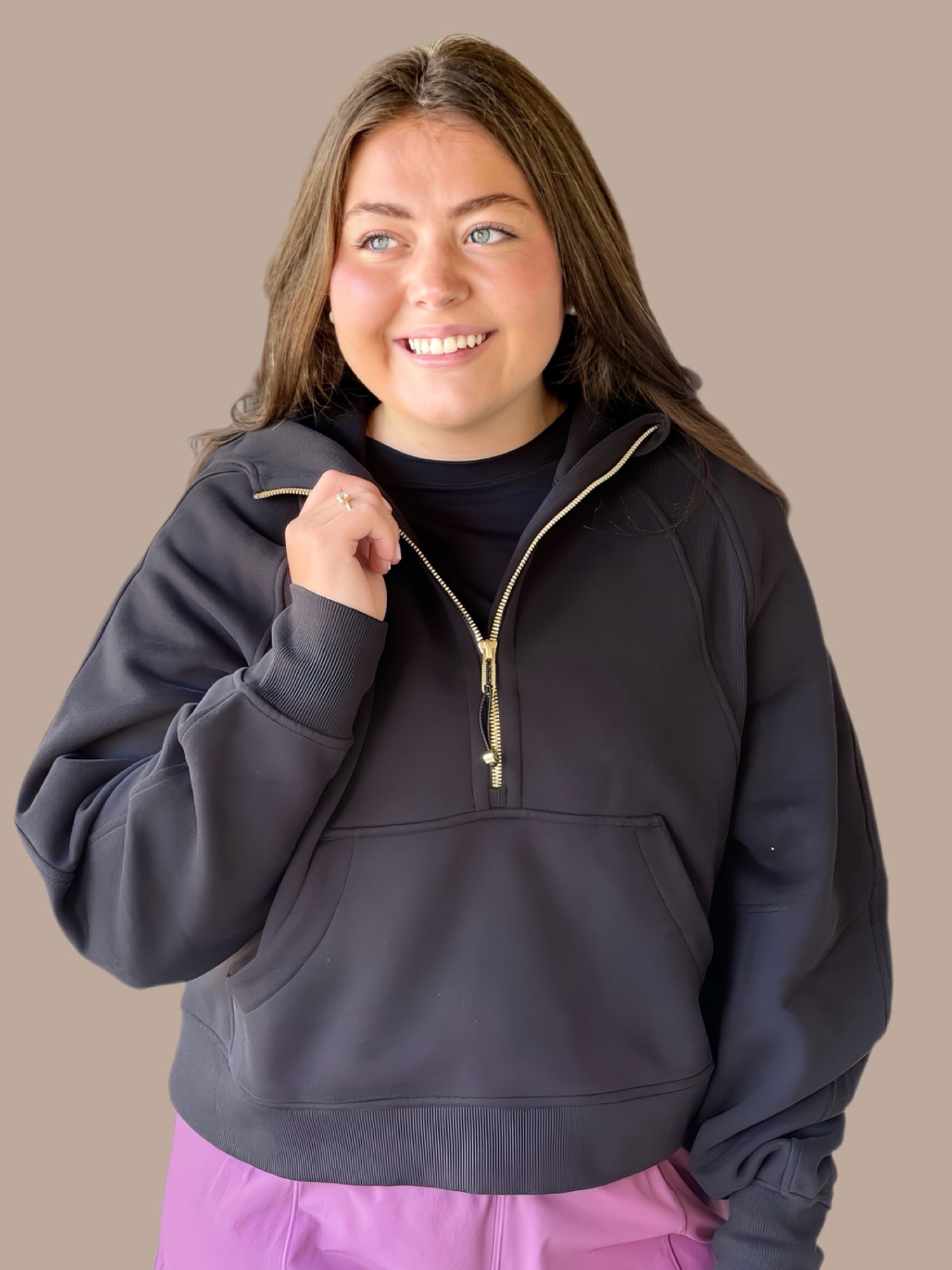 Experience ultimate comfort with the Scuba Oversized Half-Zip Hoodie in Black/Gold. Crafted from plush fleecy fabric, this hoodie delivers exceptional softness that feels cozy against your skin. Its versatile half-zip design offers easy layering and adjustable ventilation, while the oversized fit provides relaxed style and mobility. Perfectly coordinated with our Scuba sweatpants, this hoodie creates a cohesive, stylish loungewear set built for everyday comfort and ease.