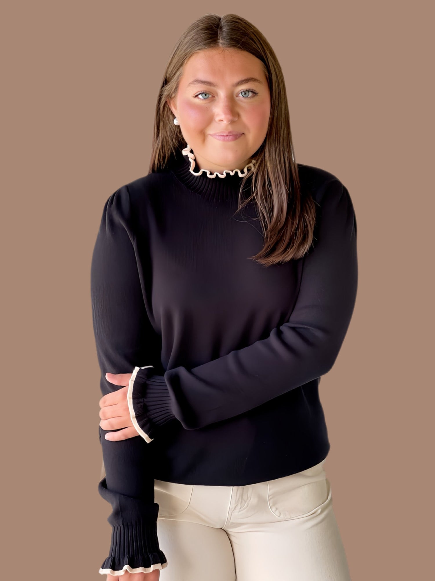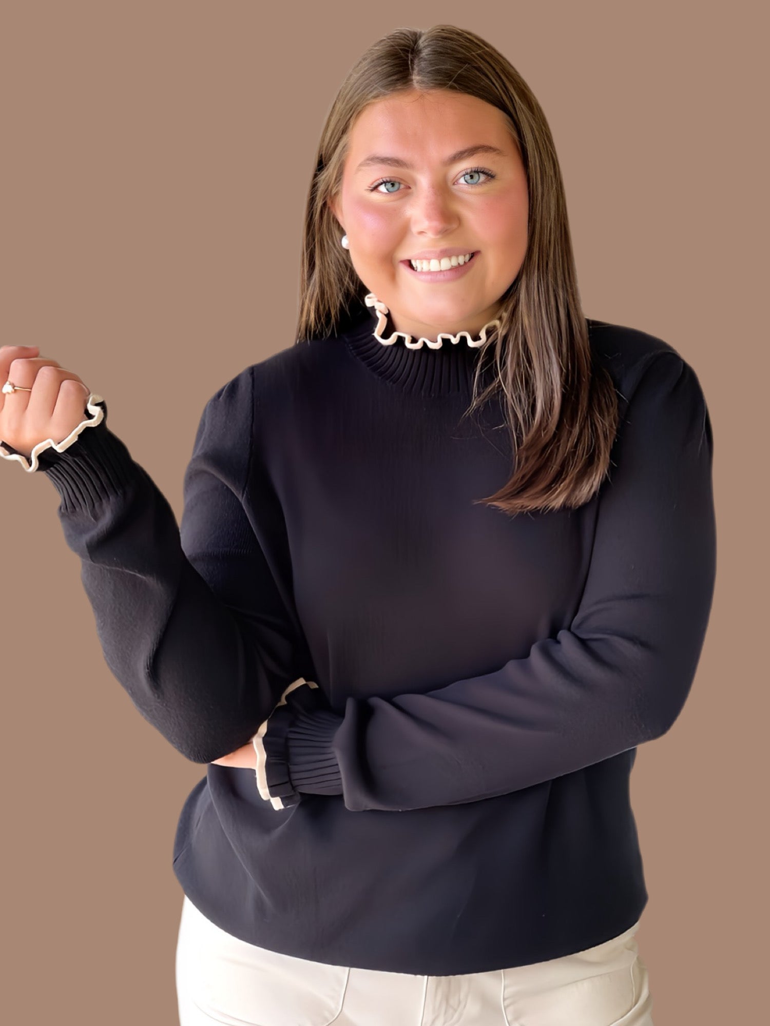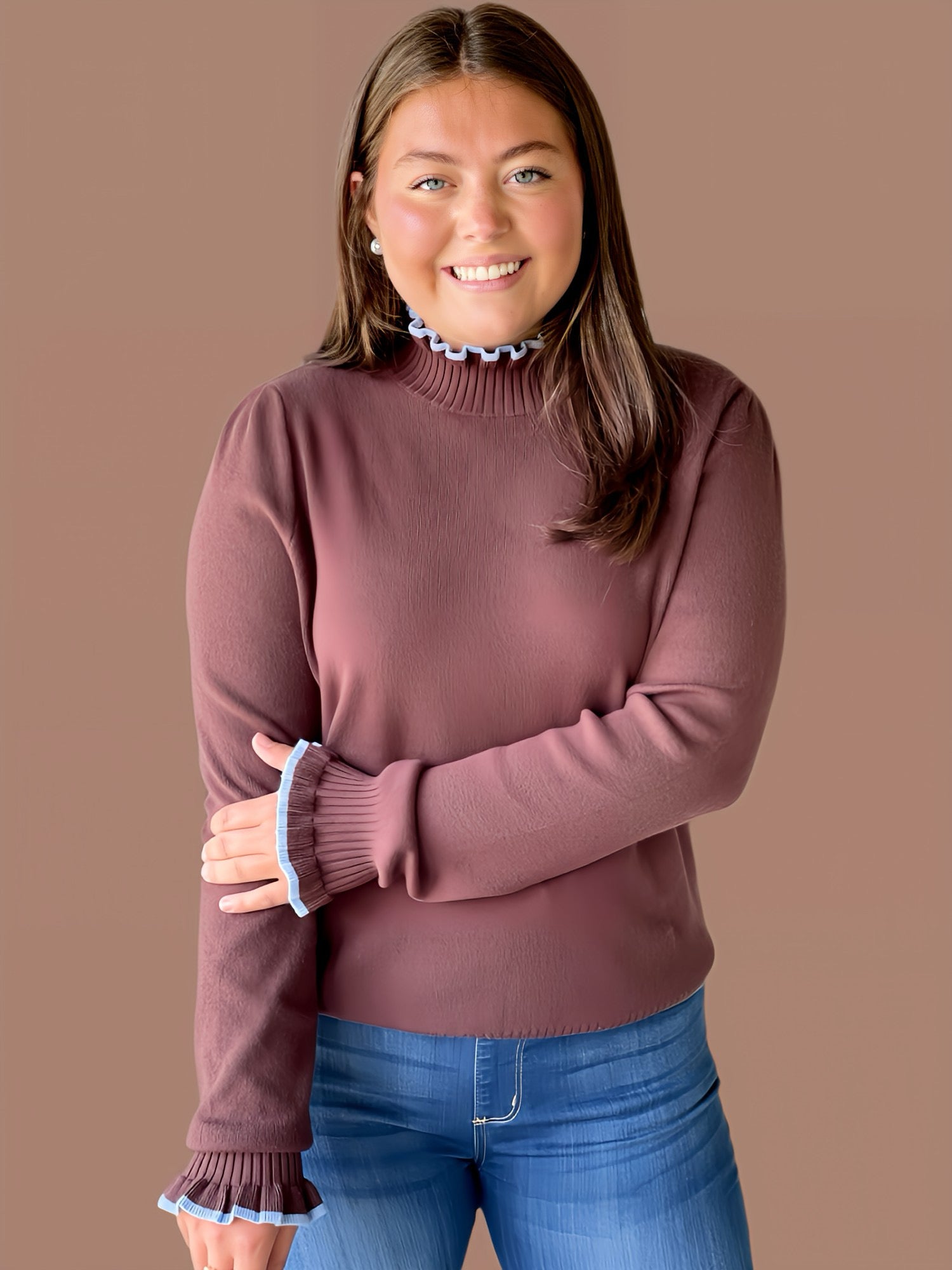 This Soft & Sweet Ruffle Knit features a refined crew neckline accented with a delicate ruffled edge for subtle elegance. Its long sleeves end in ruffle-trimmed cuffs, adding a touch of sophistication, while ribbed hems and cuffs ensure a comfortable, secure fit. Lightweight and unlined, this knit offers breathable layering perfect for transitional seasons.