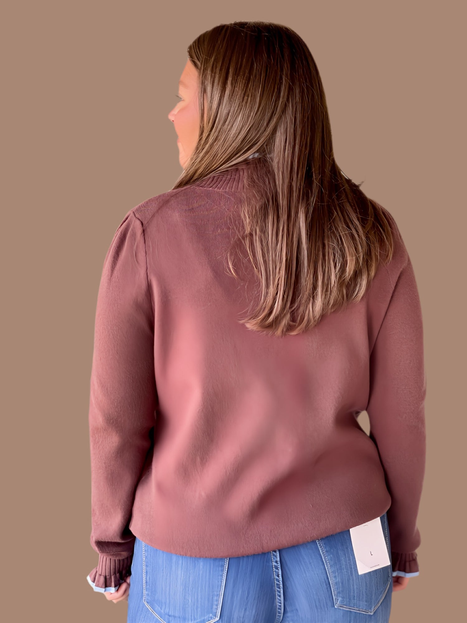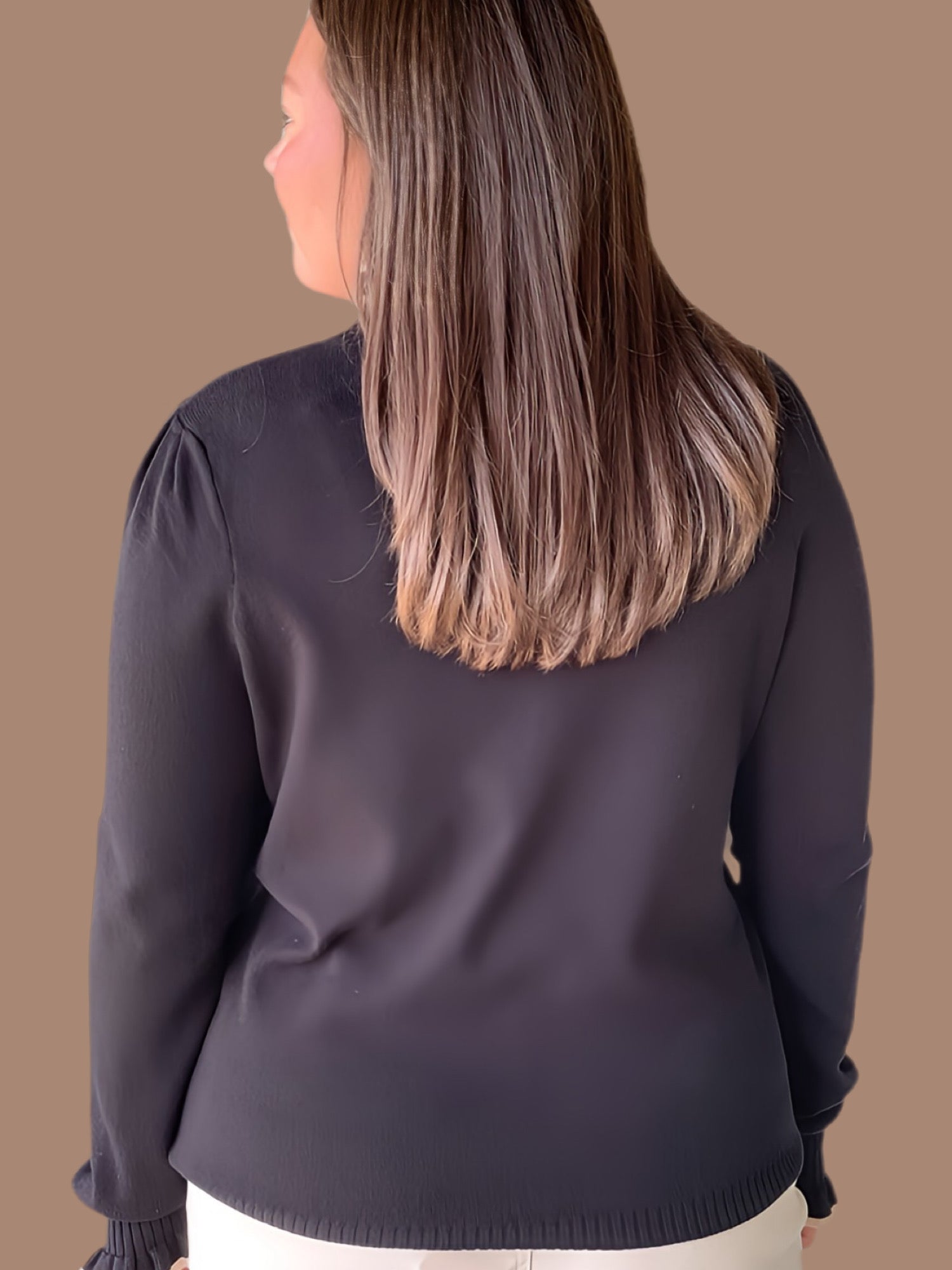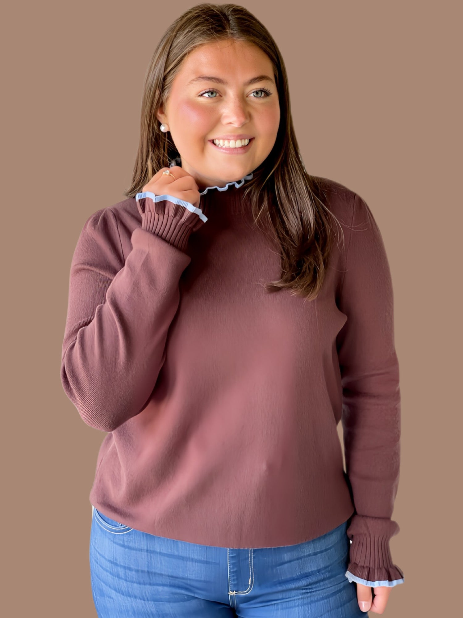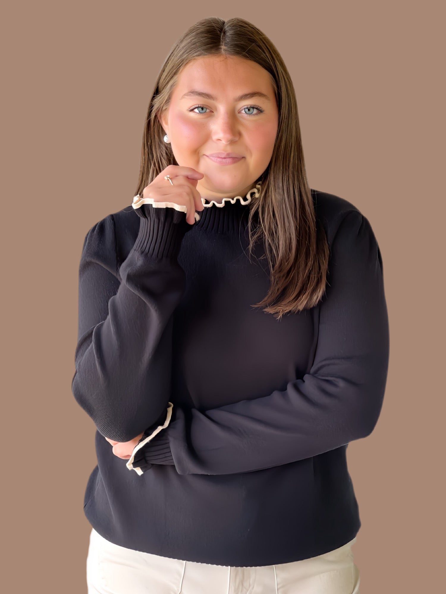This Soft & Sweet Ruffle Knit features a refined crew neckline accented with a delicate ruffled edge for subtle elegance. Its long sleeves end in ruffle-trimmed cuffs, adding a touch of sophistication, while ribbed hems and cuffs ensure a comfortable, secure fit. Lightweight and unlined, this knit offers breathable layering perfect for transitional seasons.
