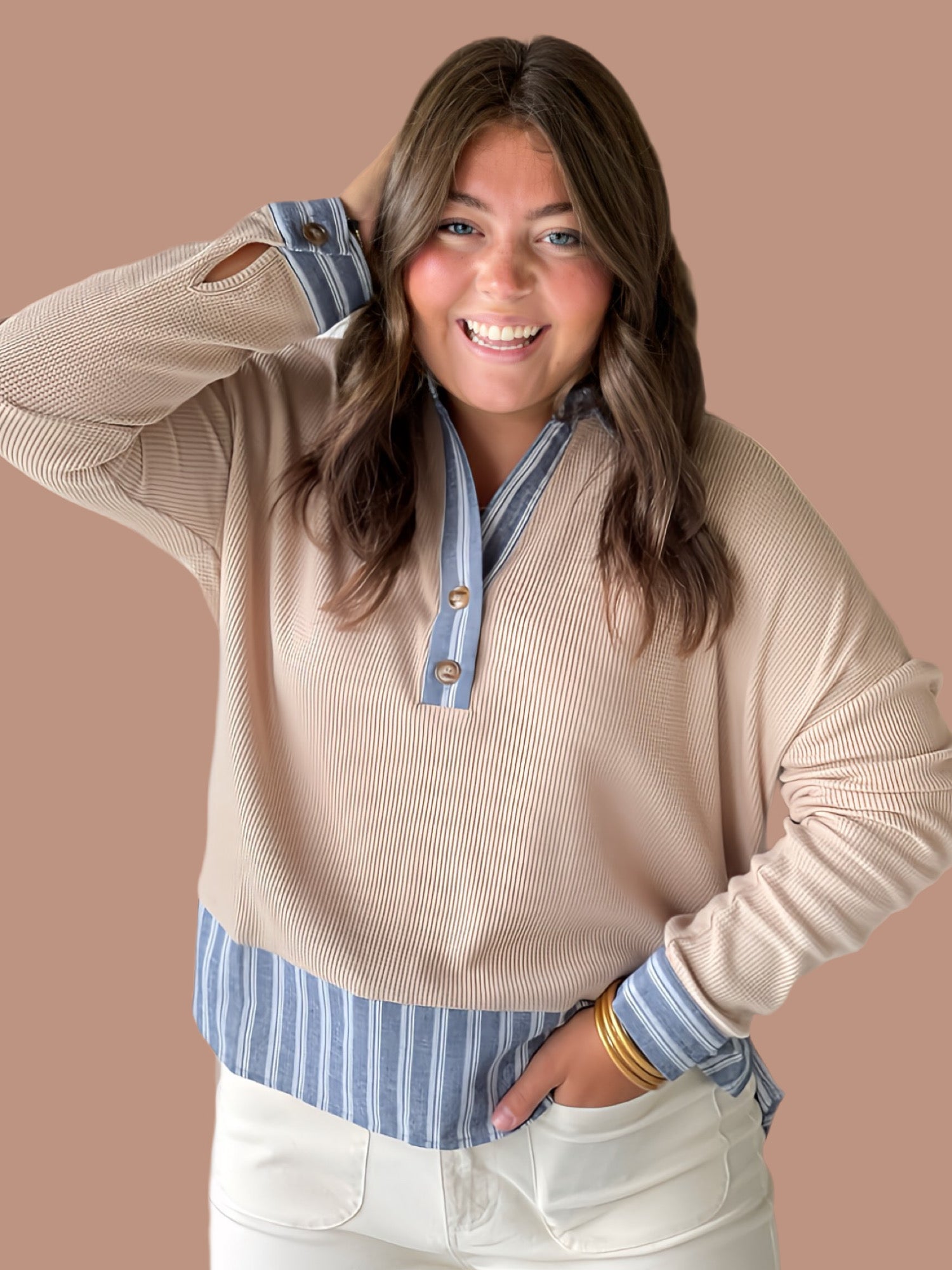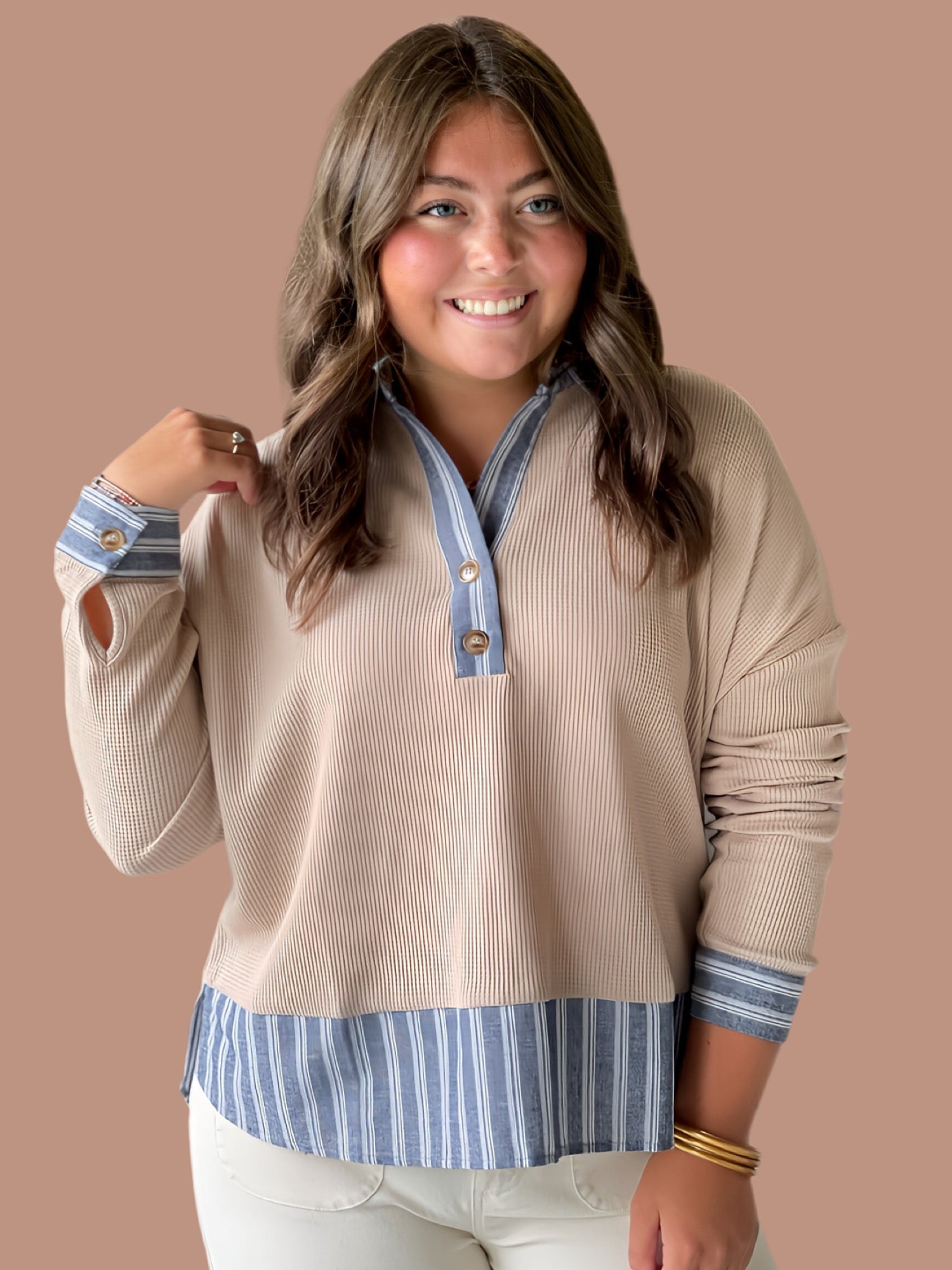 This long sleeve top combines a waffle knit body with contrast striped woven panels on the shoulders, cuffs, and hem for a refined mixed media effect. Featuring a collared split neckline with button detailing, dropped shoulders, and buttoned cuffs, it offers both style and comfort. Two side slits and a curved high-low hem create a casual layered silhouette, making it a versatile addition to any wardrobe.