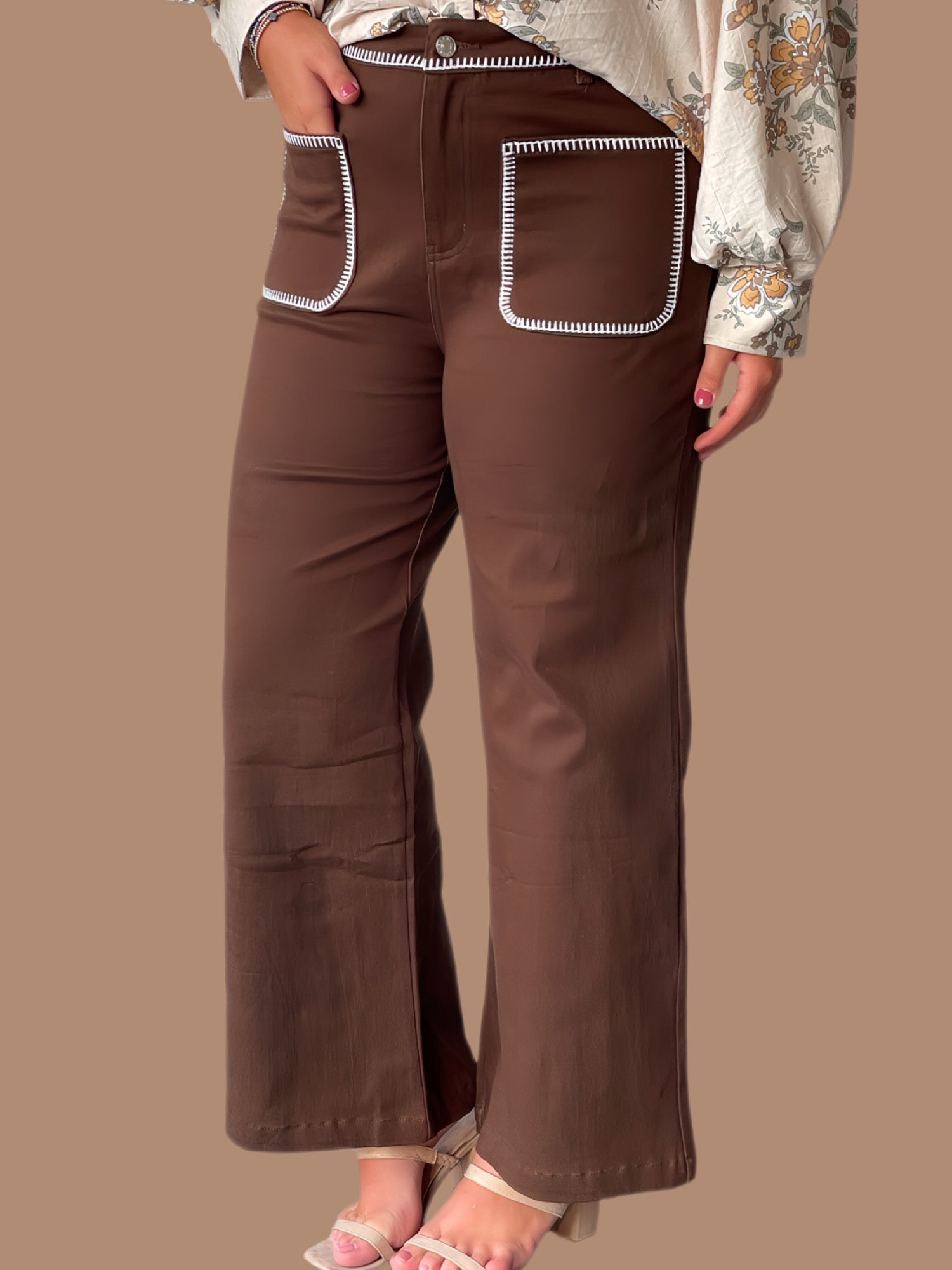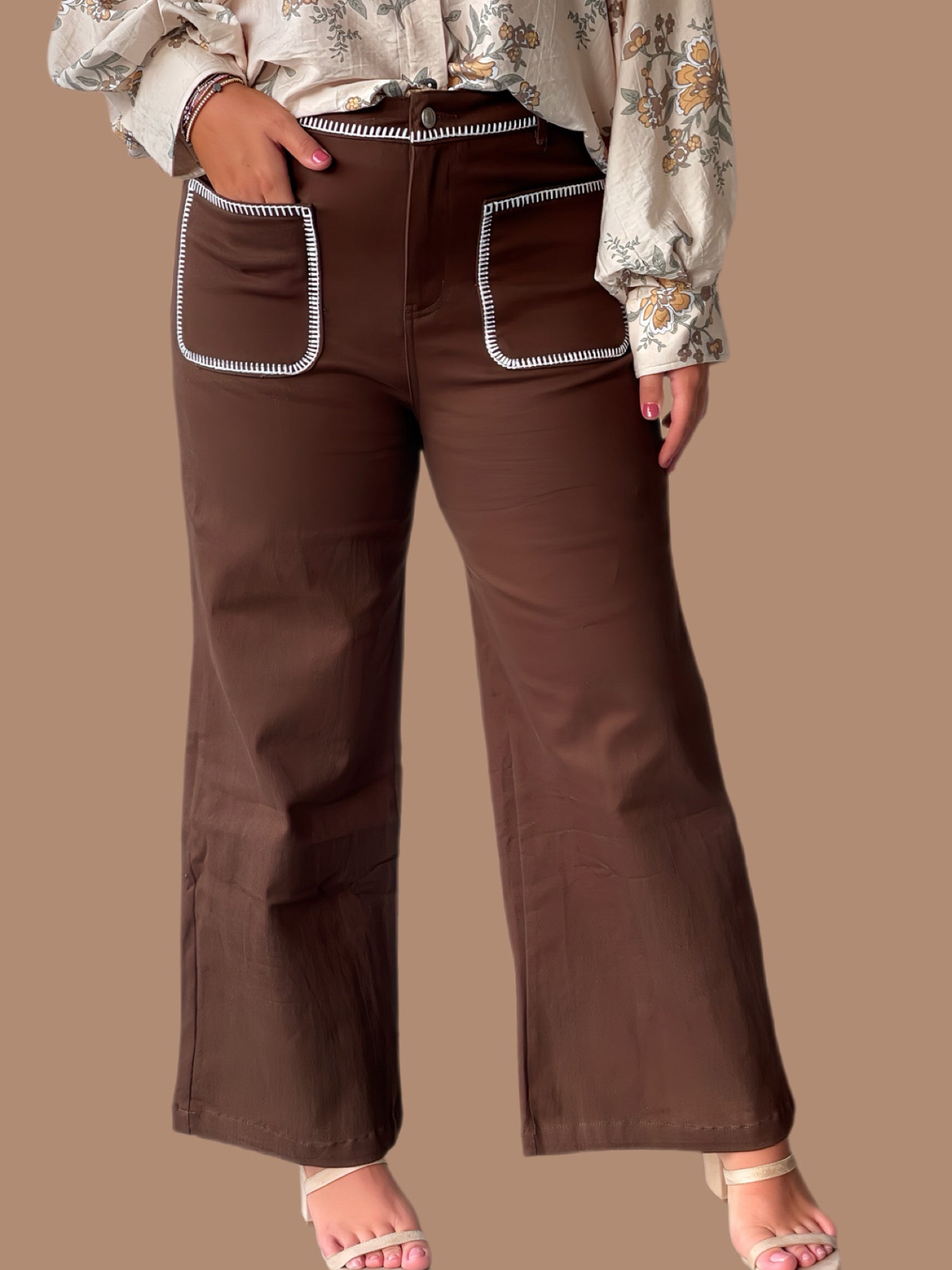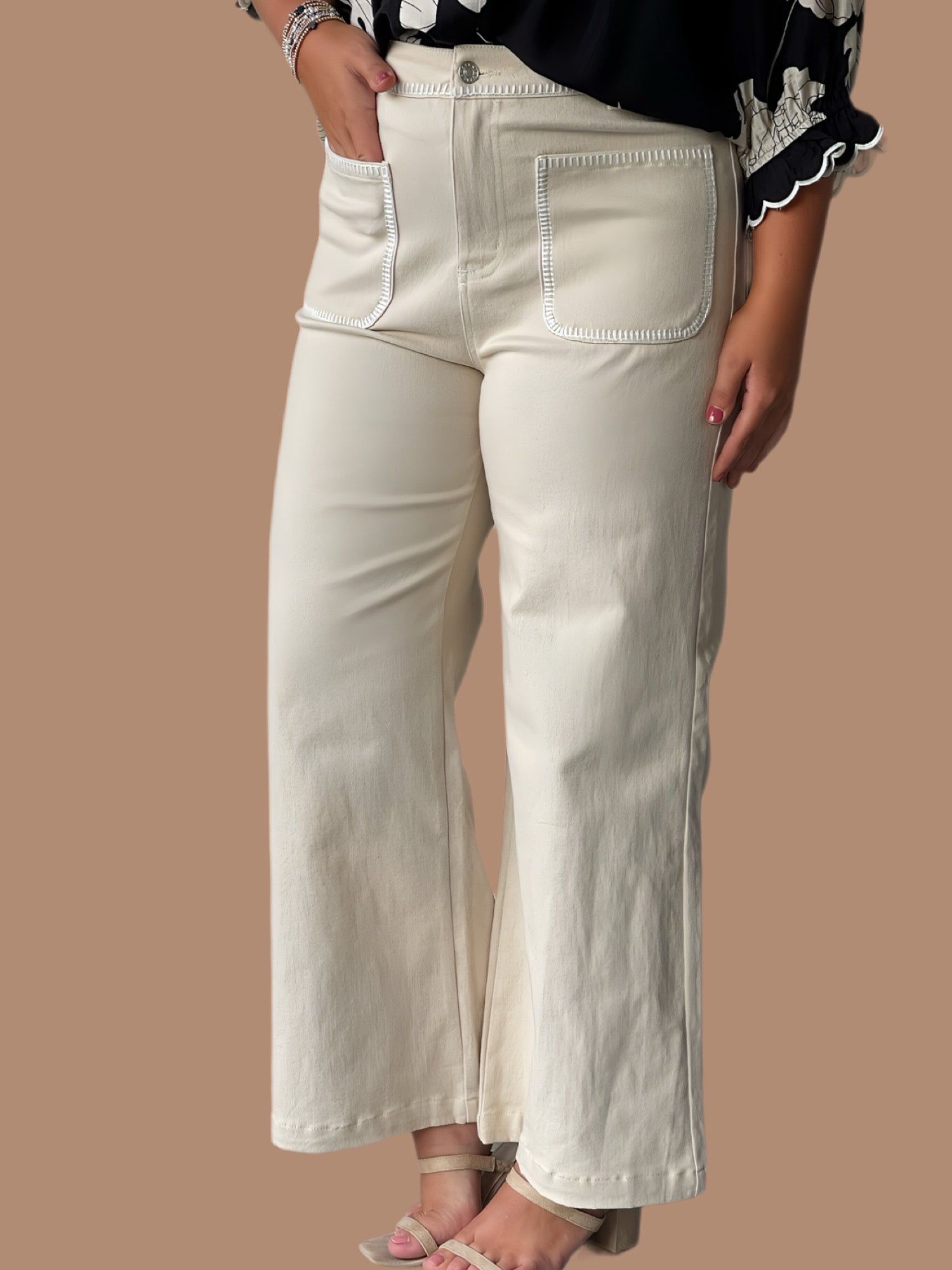 These Thread & Trend wide leg pants offer a sophisticated silhouette with their high waist and flowing wide legs. Crafted from lightweight woven fabric, they ensure comfort without sacrificing structure. Detailed with embroidered blanket stitch trim and practical front and back patch pockets, these pants balance style with functionality. The front zipper closure enhances fit and ease, while the unlined, non-sheer fabric provides breathable wear suitable for various occasions.