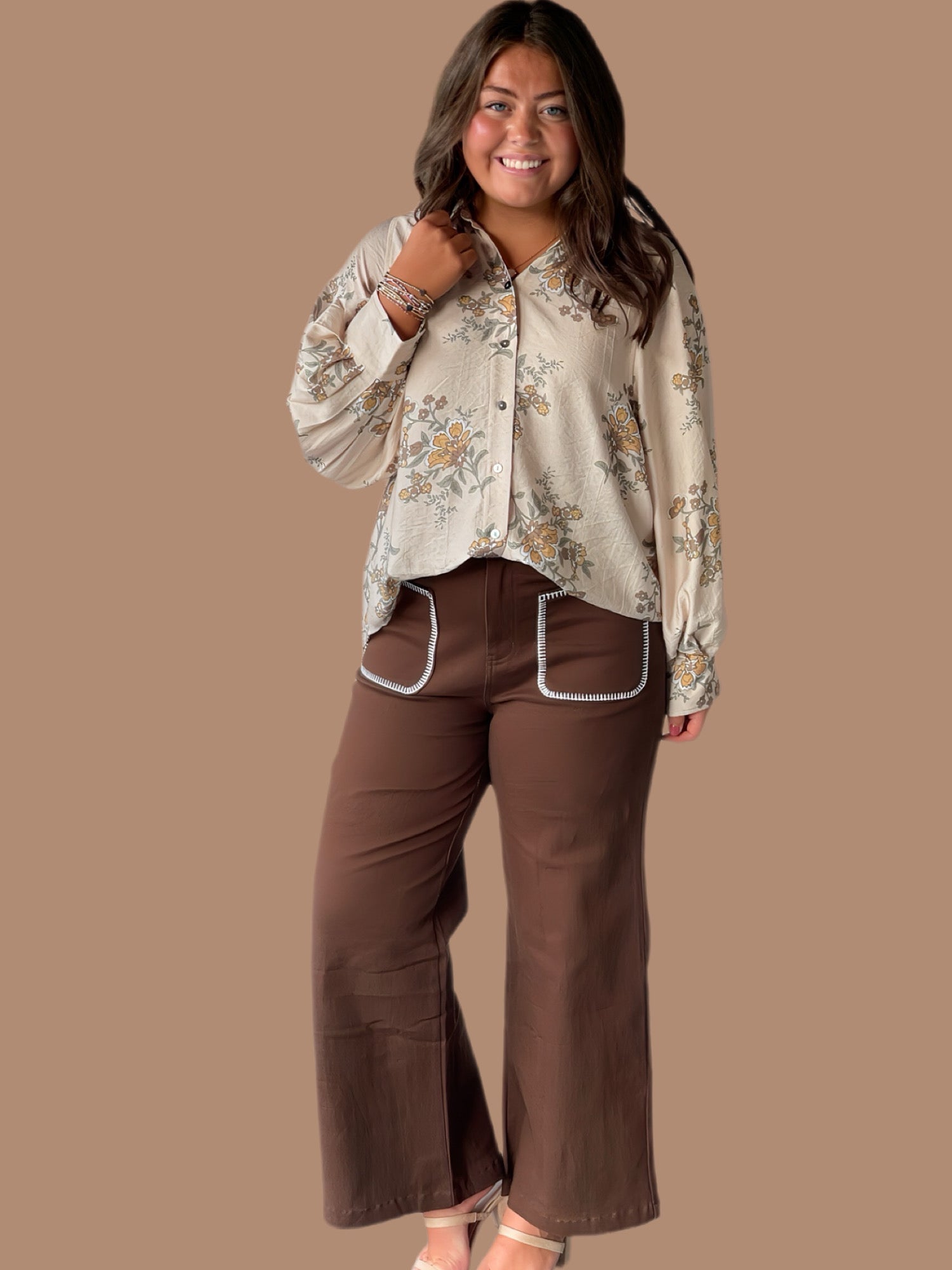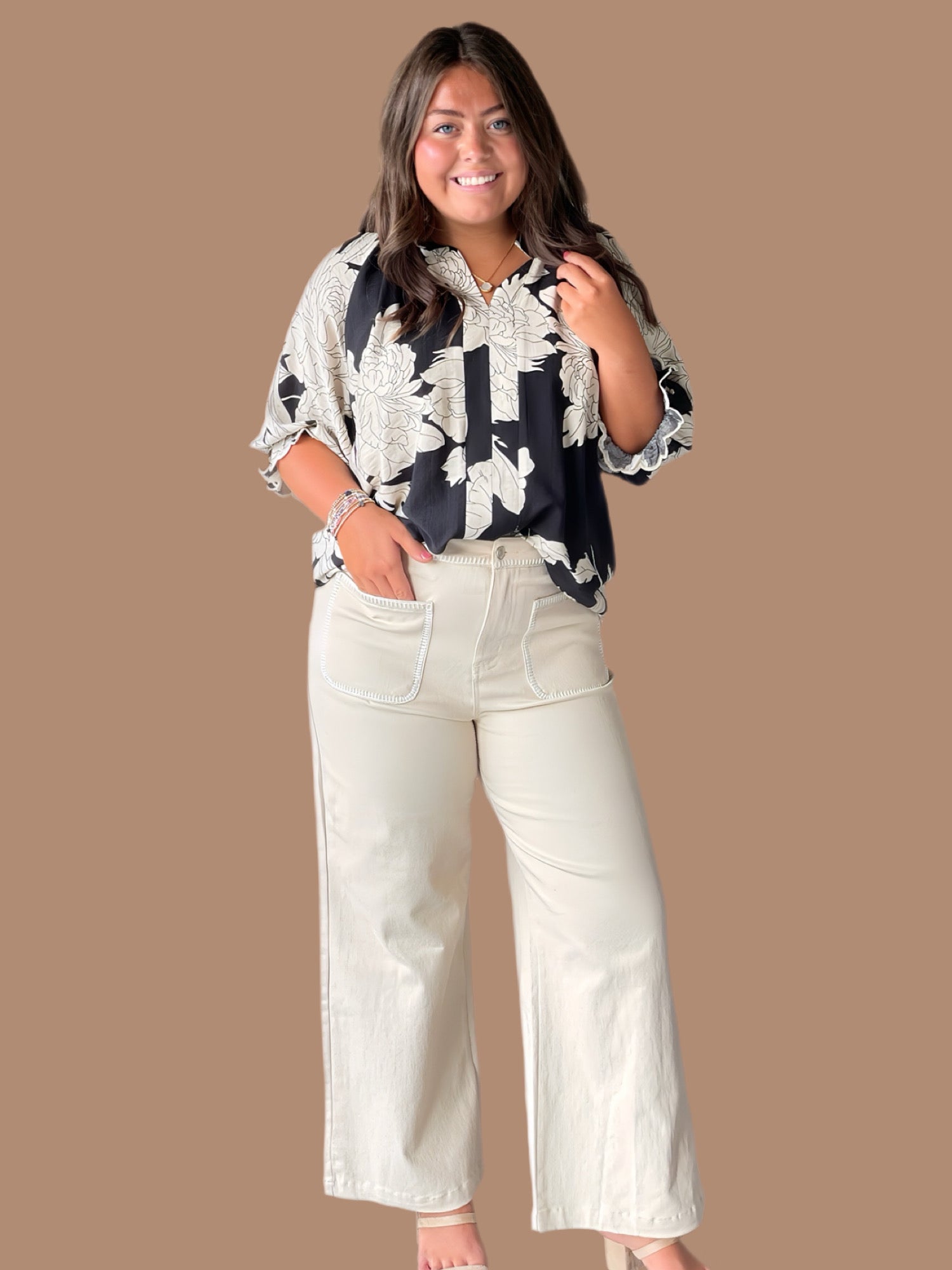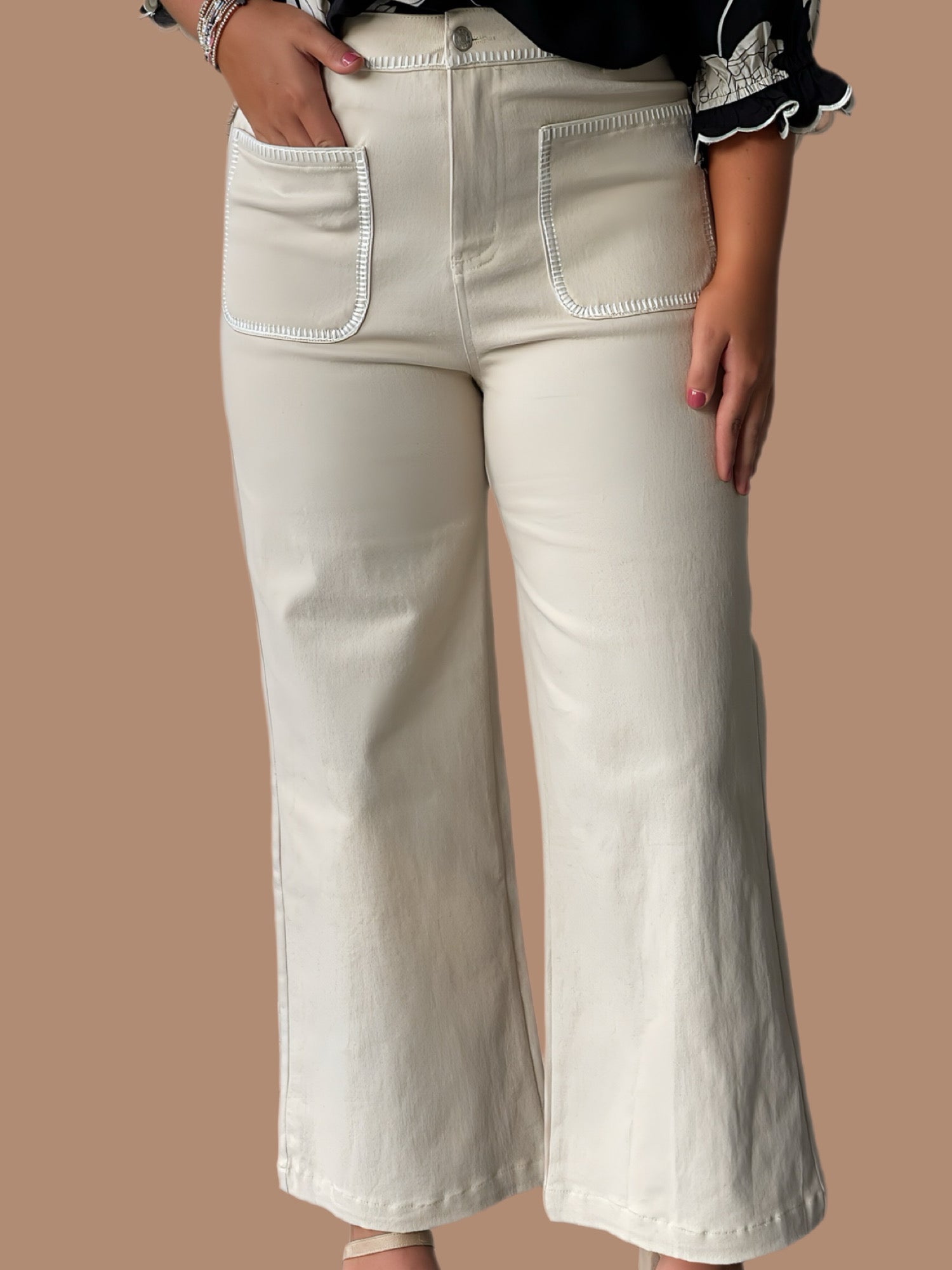 These Thread & Trend wide leg pants offer a sophisticated silhouette with their high waist and flowing wide legs. Crafted from lightweight woven fabric, they ensure comfort without sacrificing structure. Detailed with embroidered blanket stitch trim and practical front and back patch pockets, these pants balance style with functionality. The front zipper closure enhances fit and ease, while the unlined, non-sheer fabric provides breathable wear suitable for various occasions.