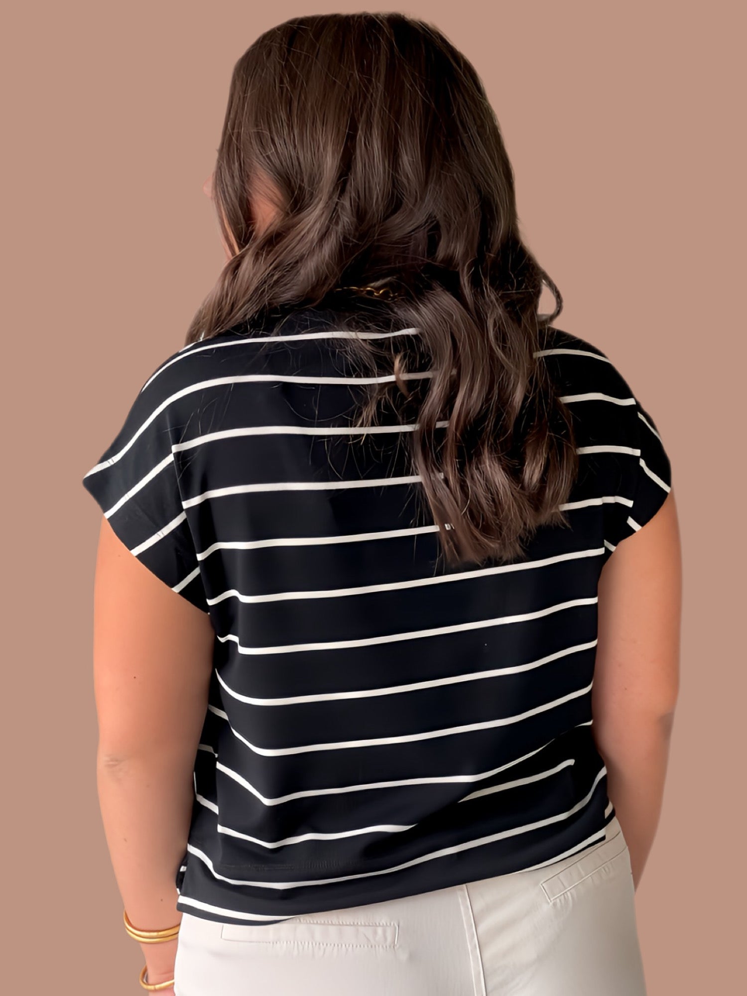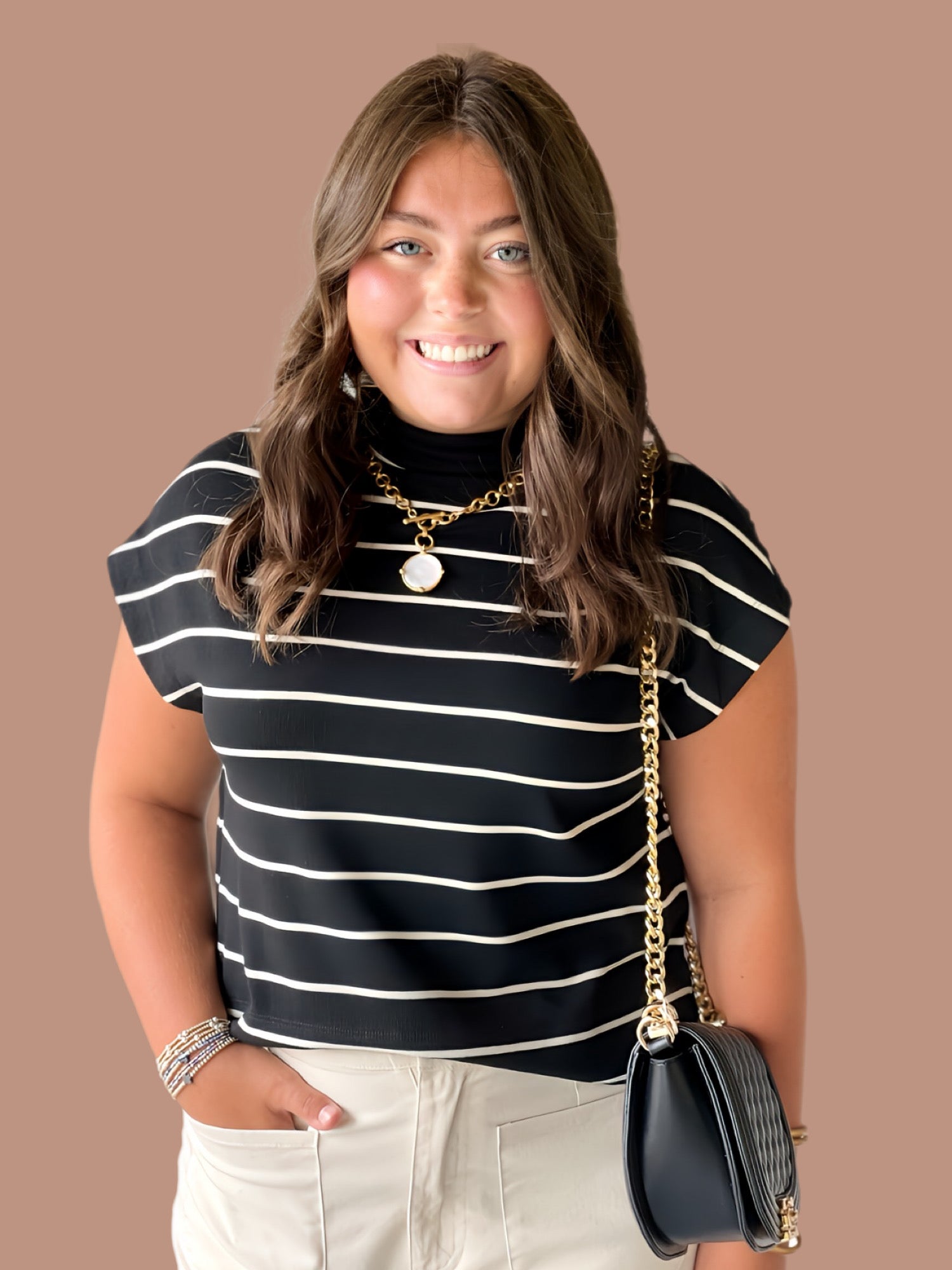 This lightweight pullover top features a refined stripe pattern and a mock neck design, crafted from breathable jersey knit fabric. Its unlined construction ensures comfort without added bulk, while the non-sheer material provides reliable coverage. Ideal for layering or wearing alone, this top combines subtle style with practical wearability.