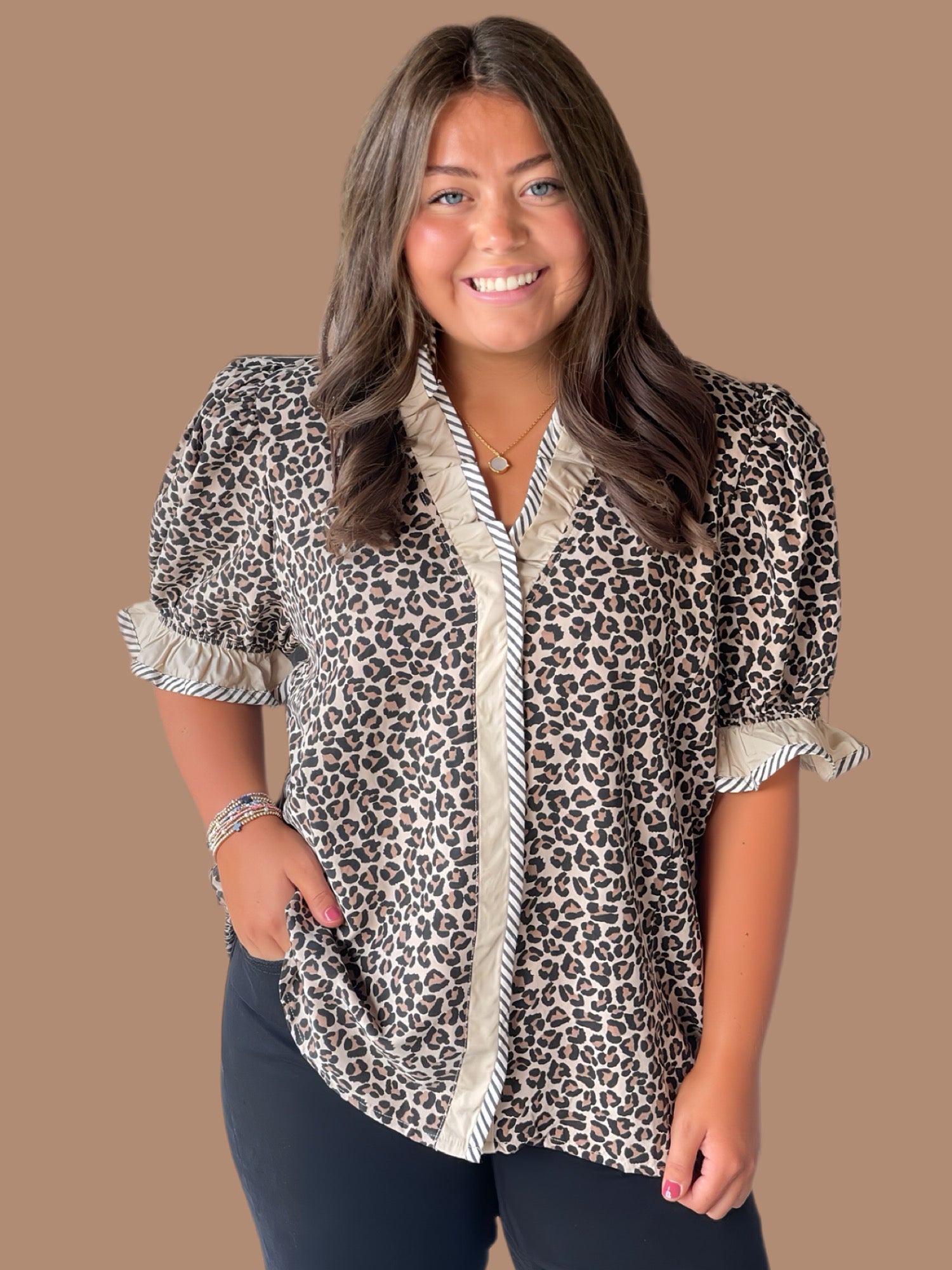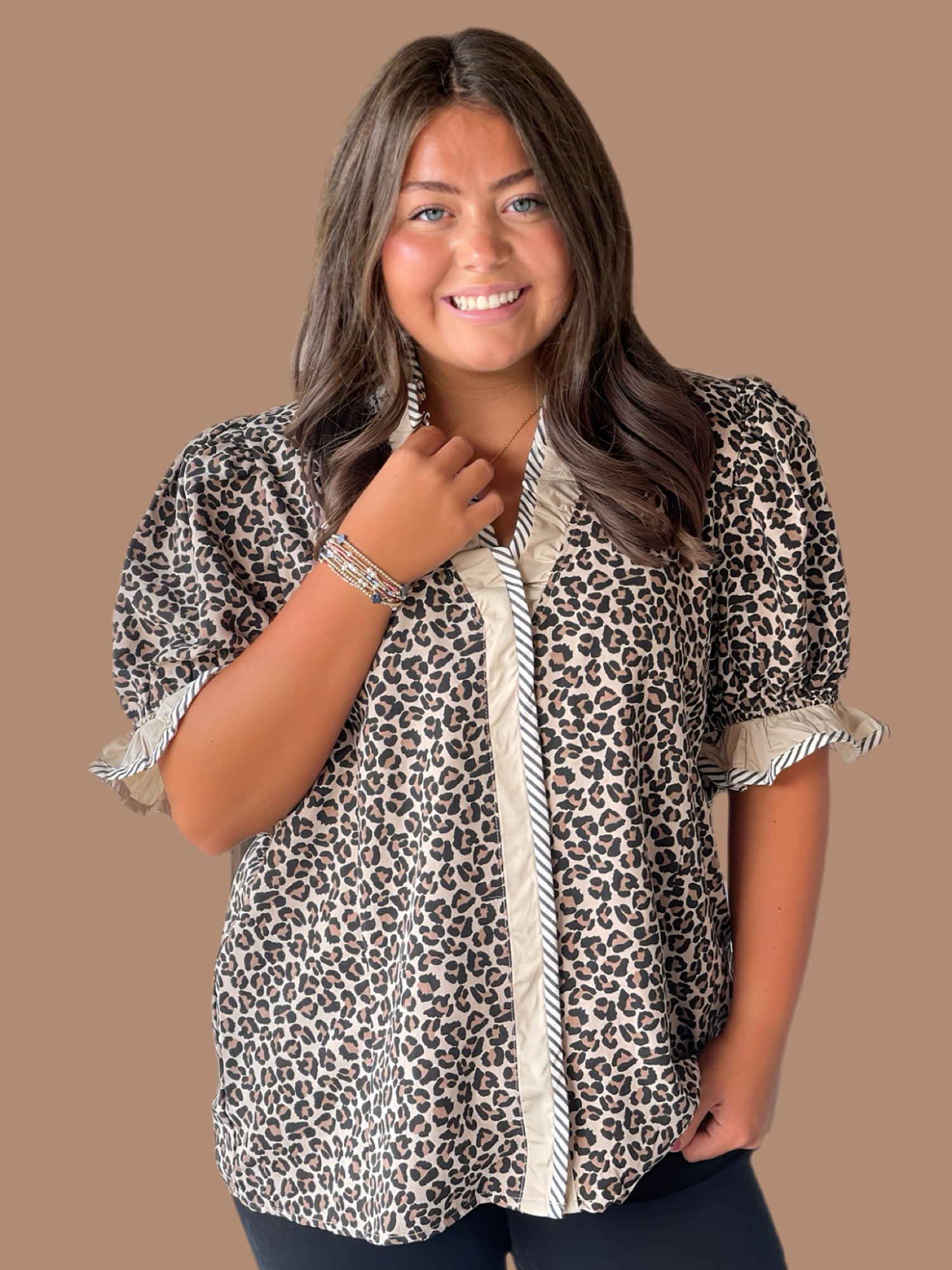 This leopard print puff sleeve top is crafted from lightweight woven fabric, ensuring comfort without compromising style. It features a ruffled neckline and contrast striped trim along the placket and cuffs for subtle detailing. The snap button closure at the bust offers ease of wear, while the unlined, non-sheer construction makes it perfect for layering or wearing alone with confidence. A sophisticated choice that balances bold prints with refined design elements.