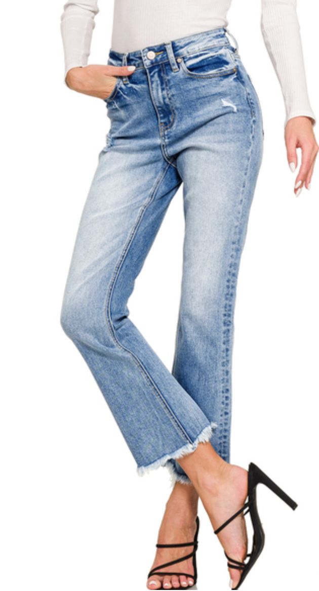 These High Rise Straight Raw Hem Cropped Denim Pants are distressed and stretchy. With a front rise of 10.5" and an inseam of 27", they provide a comfortable and flattering fit. The leg opening of 16.25" offers a trendy cropped look.