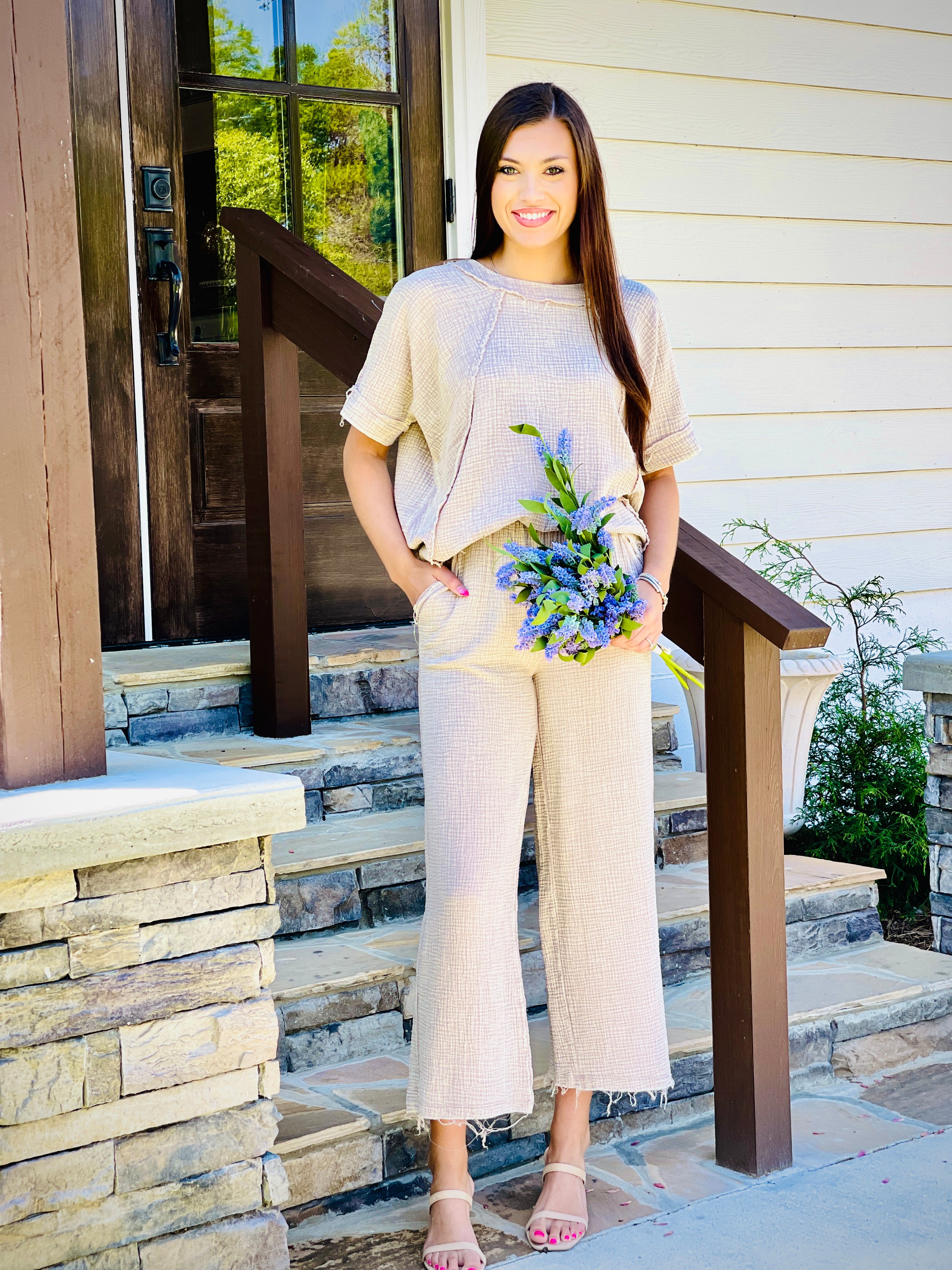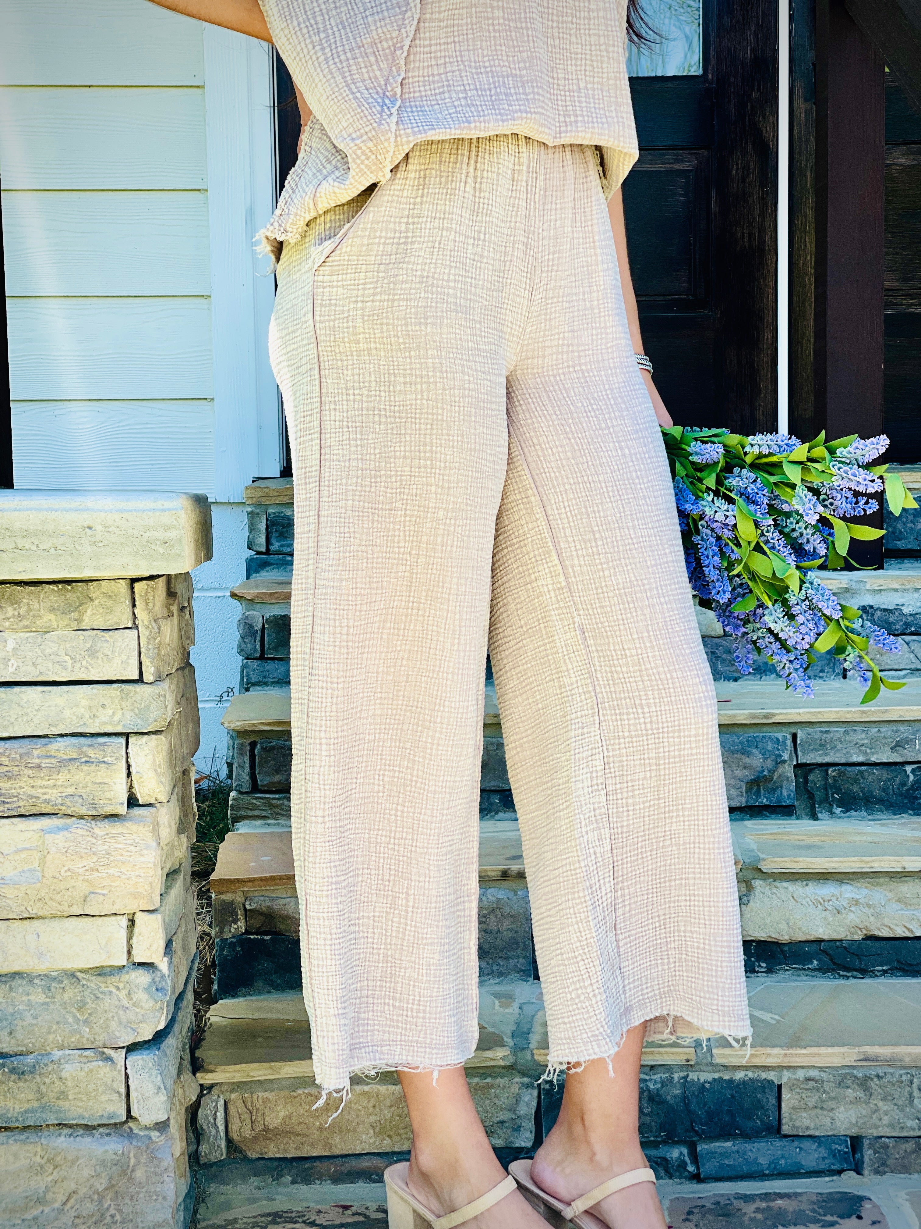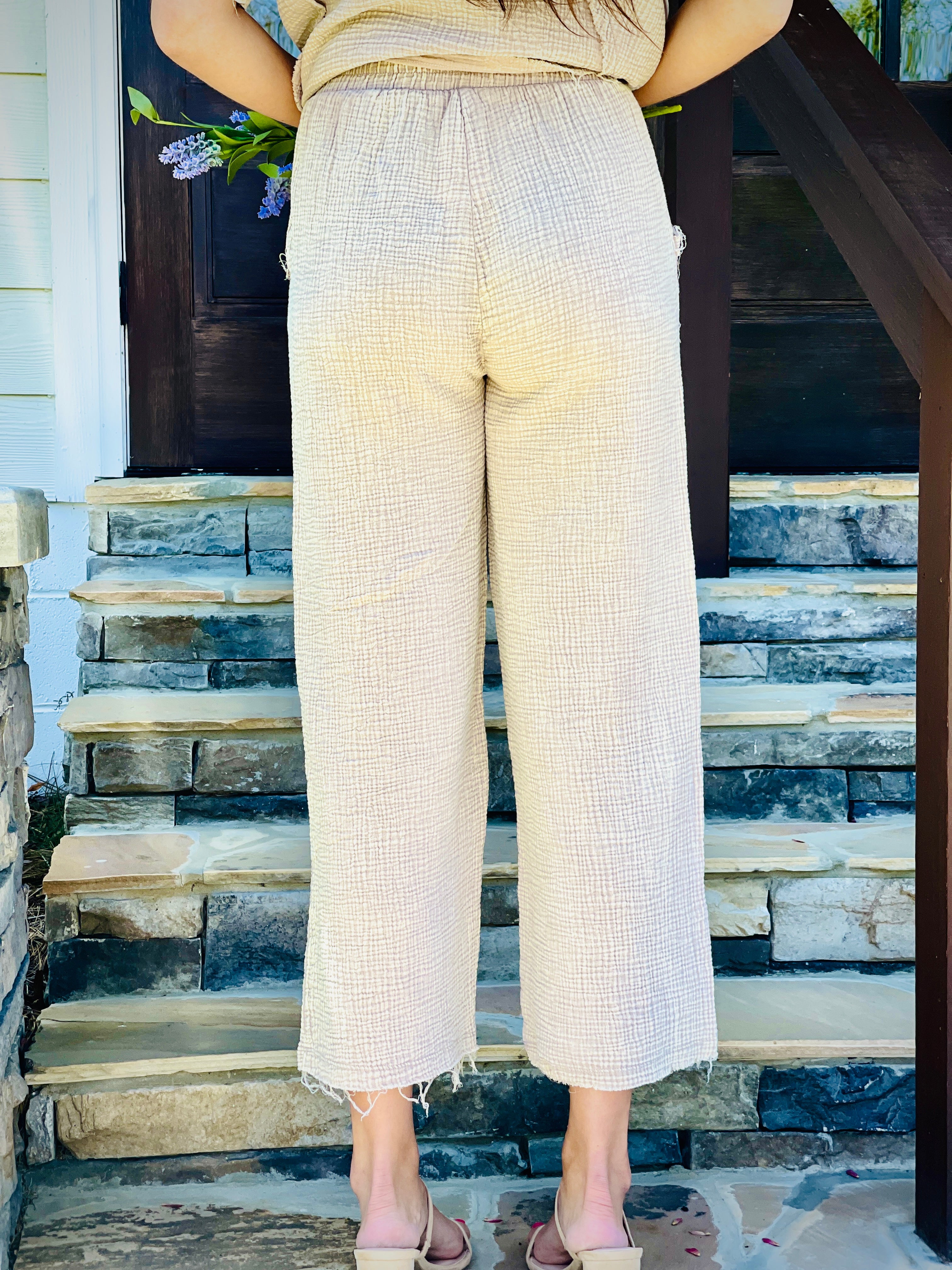 Expertly crafted from washed double gauze, these pants feature raw edge details and a frayed hem for a casual, yet elevated look. The elastic waistband provides a comfortable fit, while side pockets add functionality. Perfect for any occasion, these pants combine style and comfort effortlessly.