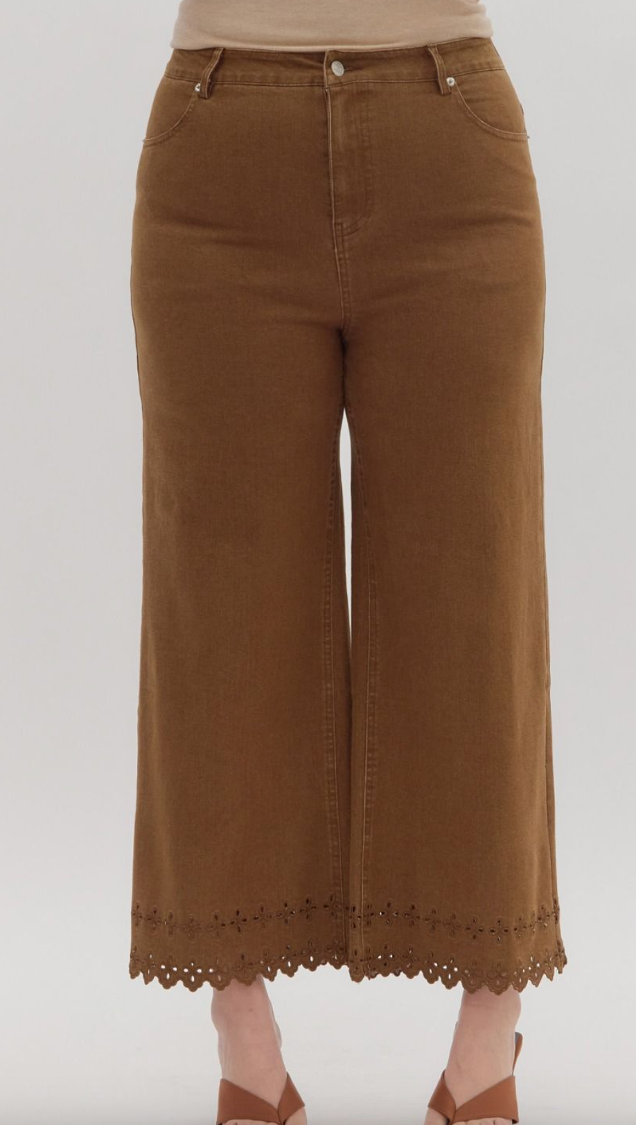 These high-waist, ankle-length pants combine style and comfort with a delicate floral embroidered border hem that adds a refined touch. Featuring a classic button fly-front zipper closure and traditional jean pockets, they offer both functionality and timeless design. Crafted from lightweight, woven fabric, these pants are unlined and non-sheer, ensuring breathability and ease of wear throughout the day. Ideal for those seeking a sophisticated yet comfortable wardrobe staple.