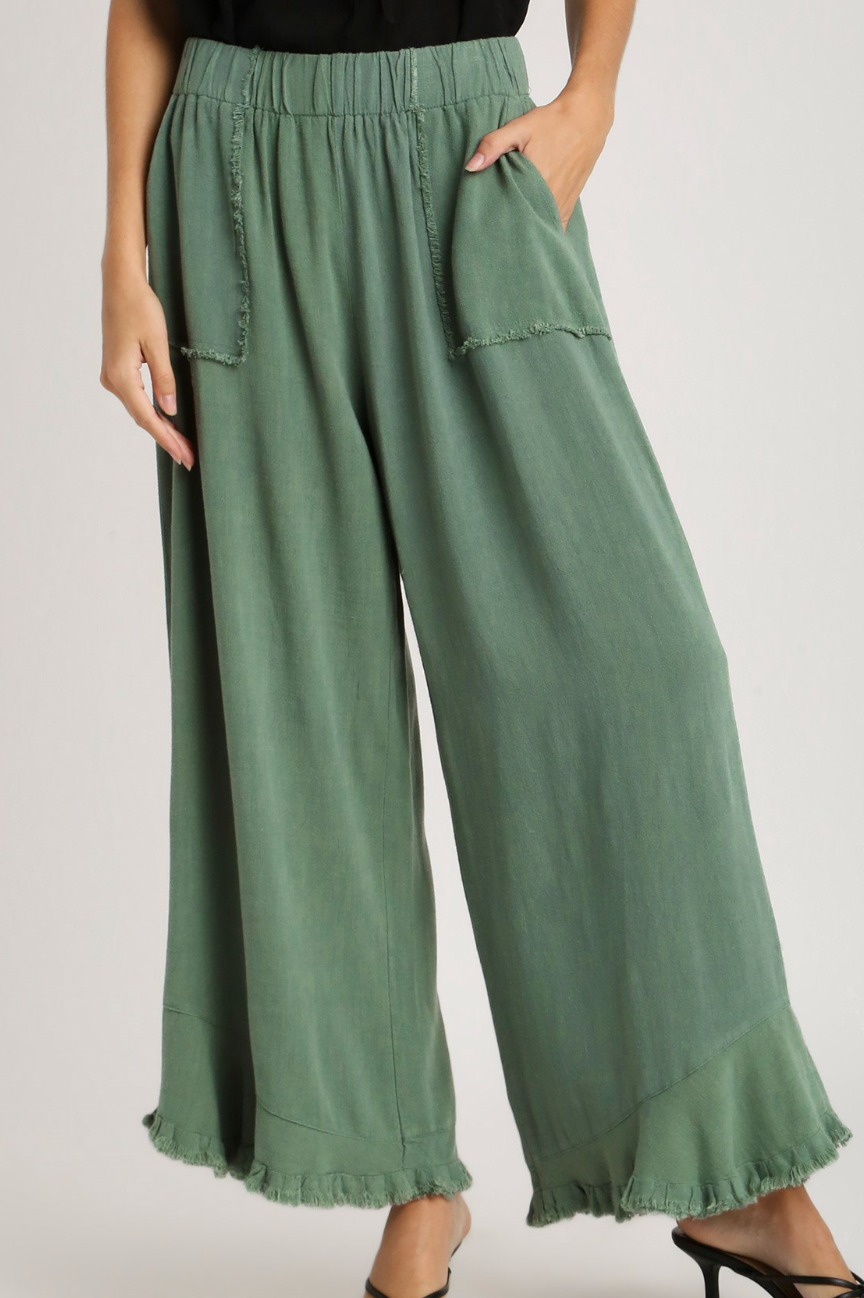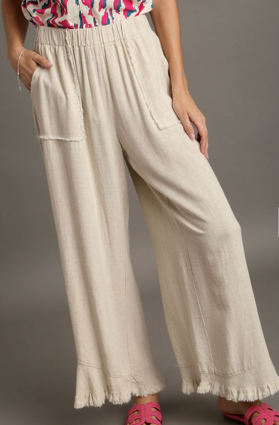 Stay comfortably stylish with our Linen Blend Elastic Waist Band Wide Frayed Hem Pants. Made with a blend of linen, these pants offer breathable comfort while the elastic waistband provides a perfect fit. The frayed hem adds a touch of trendiness, while the side pockets offer convenience. Perfect for any occasion.