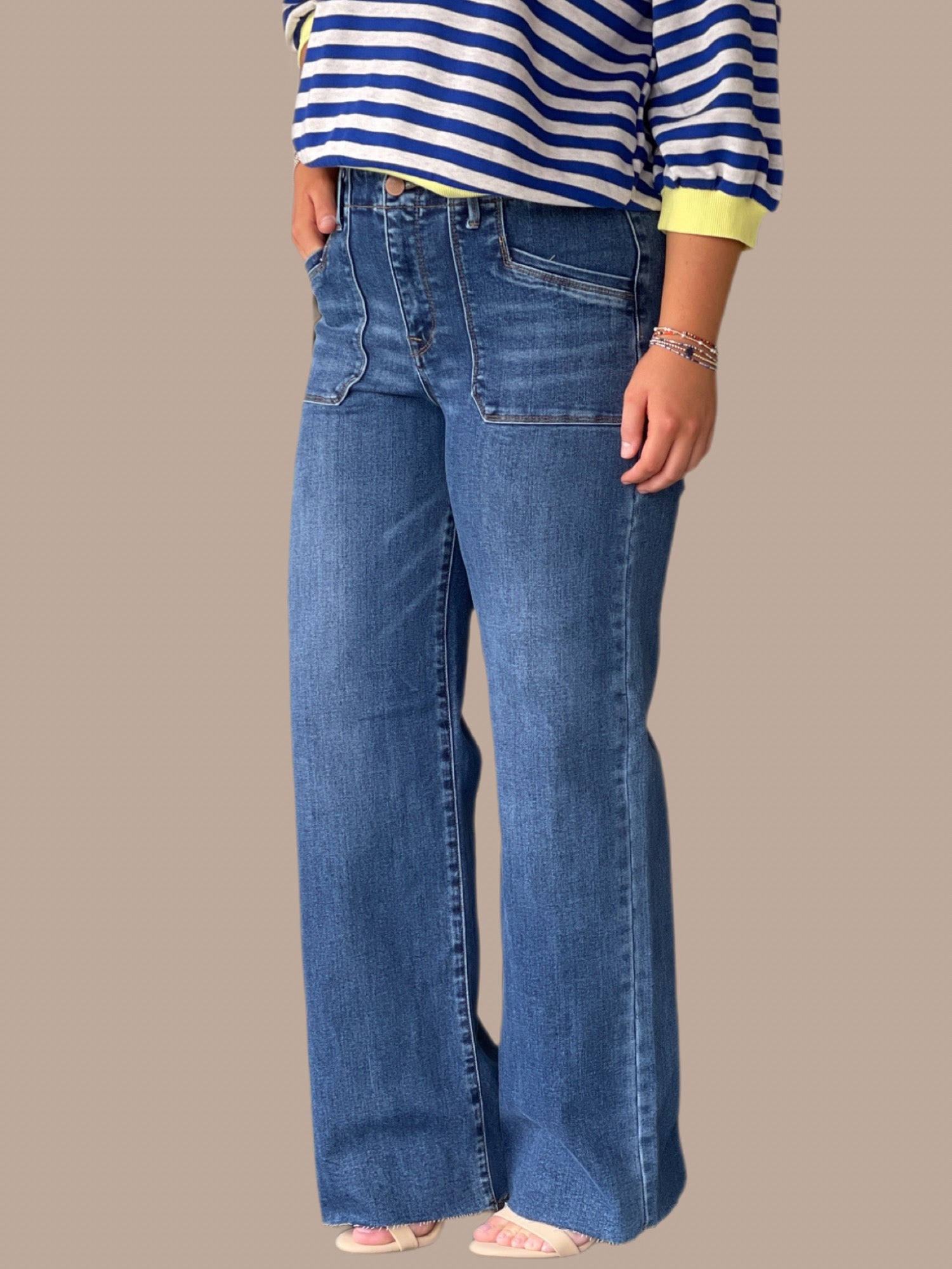 Effortlessly chic, these slouchy wide-leg jeans deliver relaxed comfort without sacrificing style. The distinctive front patch pocket detail adds visual interest and dimension to the silhouette, while the generous cut through the hips and thighs creates that coveted laid-back aesthetic. Perfect for layering or wearing solo, this versatile piece transitions seamlessly from casual weekends to elevated everyday looks. The wide-leg proportions elongate the frame and pair beautifully with everything from sneakers to heels, making it a wardrobe essential for those who appreciate modern, understated sophistication.