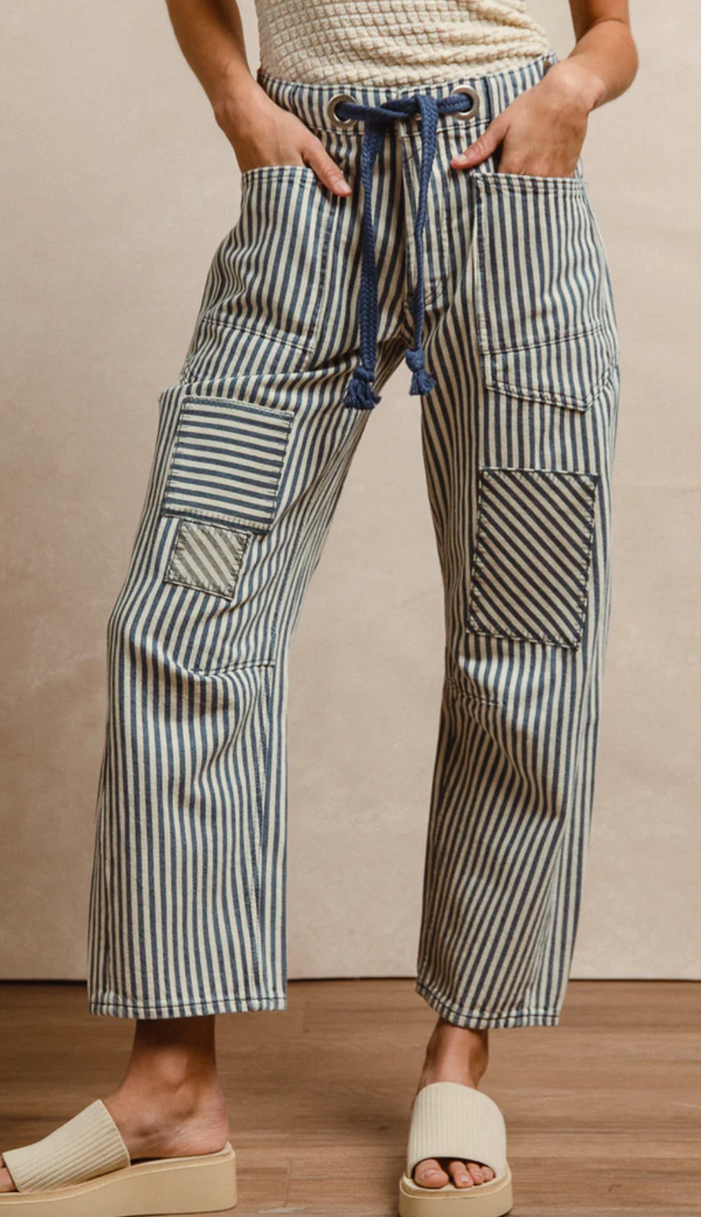 Crafted from durable twill fabric, these barrel pants feature a distinctive striped pattern that effortlessly transitions from casual to polished. The relaxed, tapered silhouette offers contemporary styling with a comfortable fit through the hip and thigh, narrowing at the ankle for a refined finish. Versatile enough for weekend wear or elevated casual occasions, these pants pair seamlessly with everything from fitted tops to oversized blazers. The quality construction ensures lasting wear season after season.