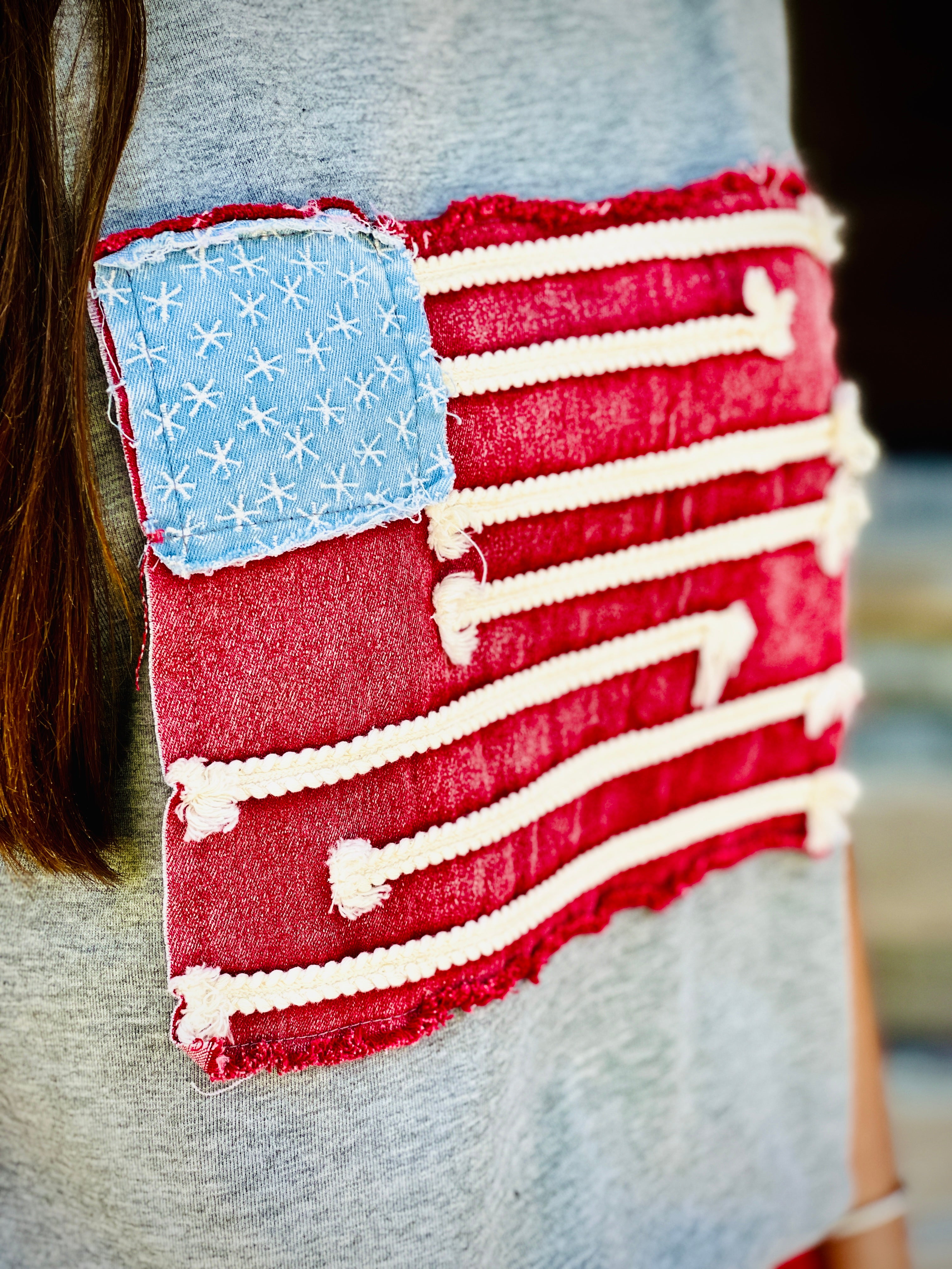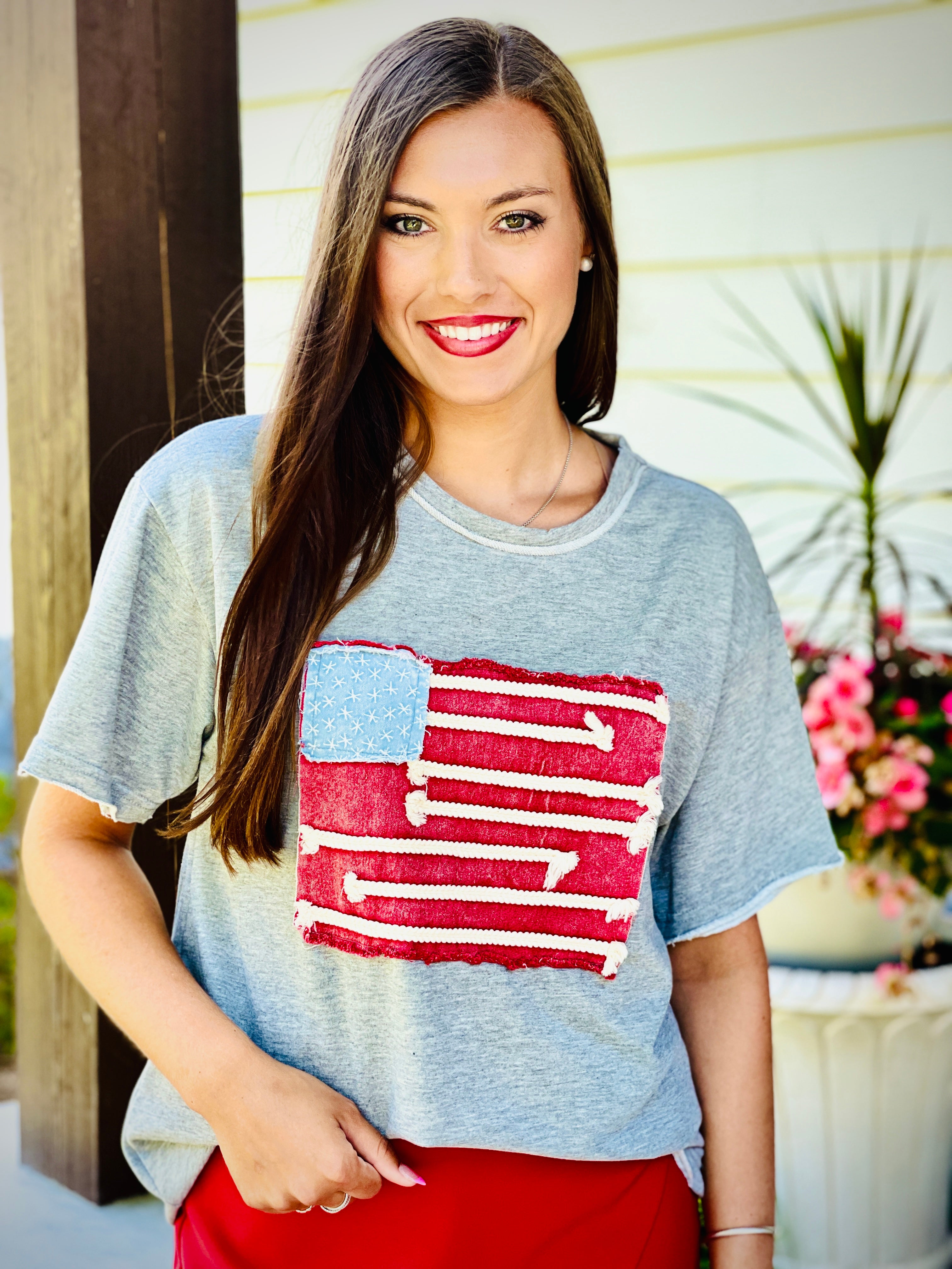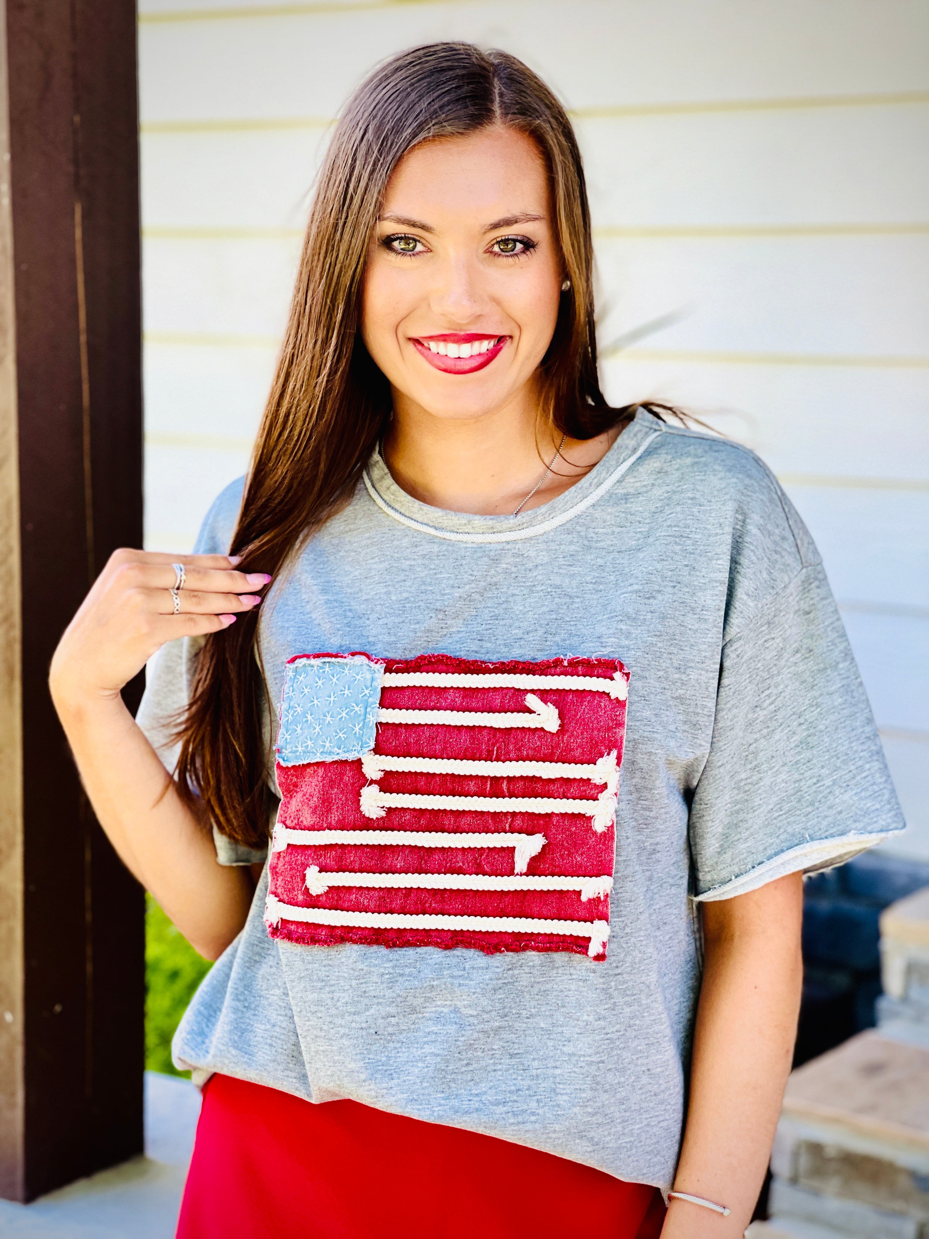 Expertly designed with 100% cotton, this top offers both comfort and style. The U-neck and short sleeves provide a relaxed fit, while the drop shoulder adds a touch of elegance. Featuring a front American flag detail, it is perfect for showing off your patriotic spirit. With its non-sheer and lightweight fabric, it's a must-have for any wardrobe.