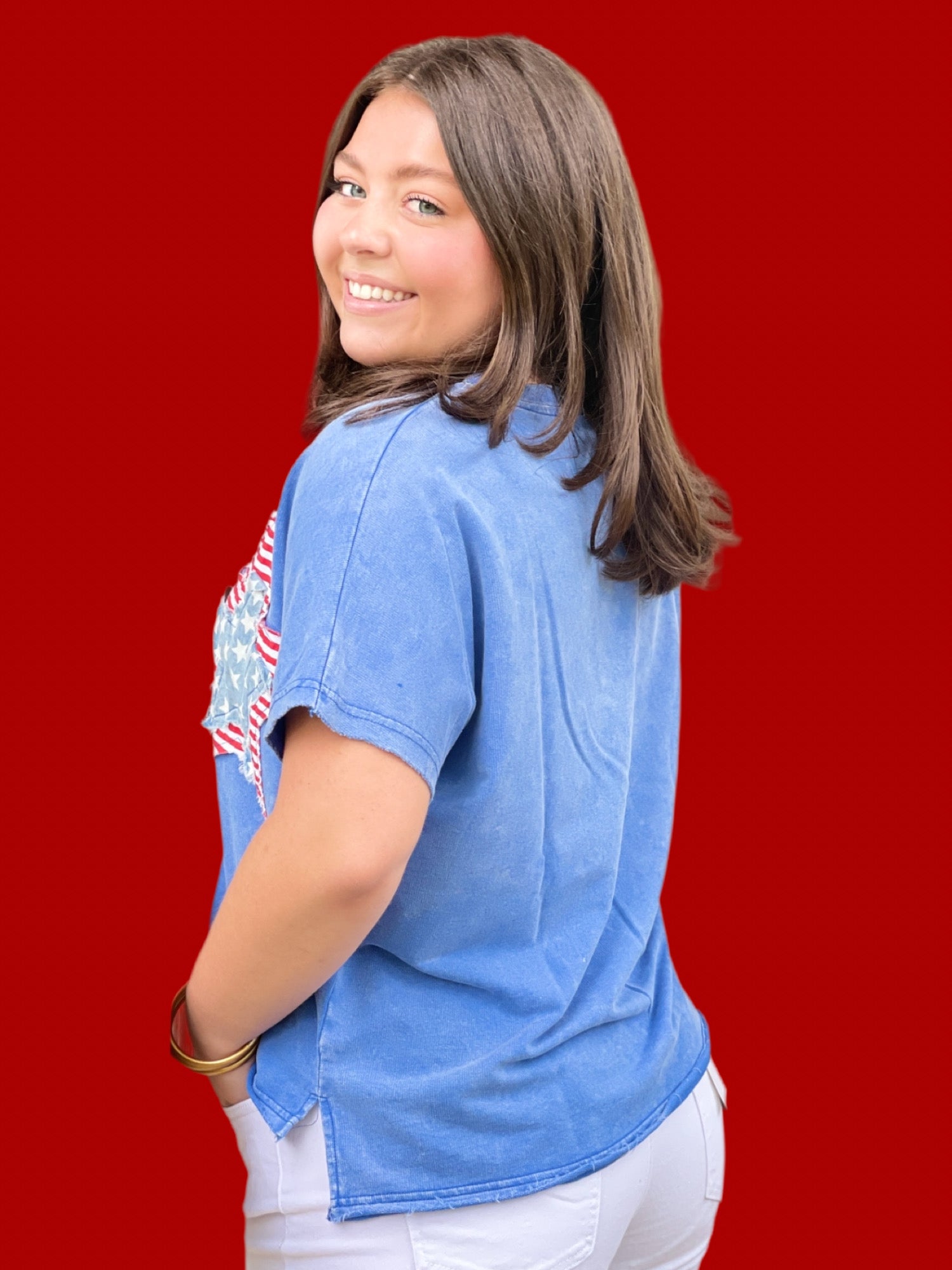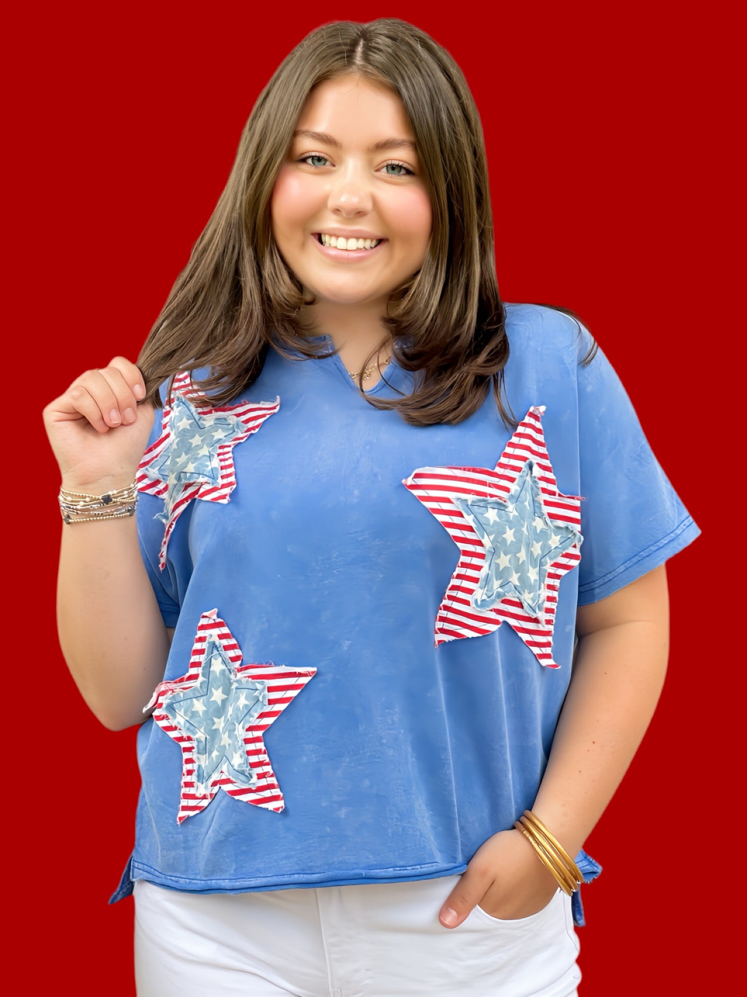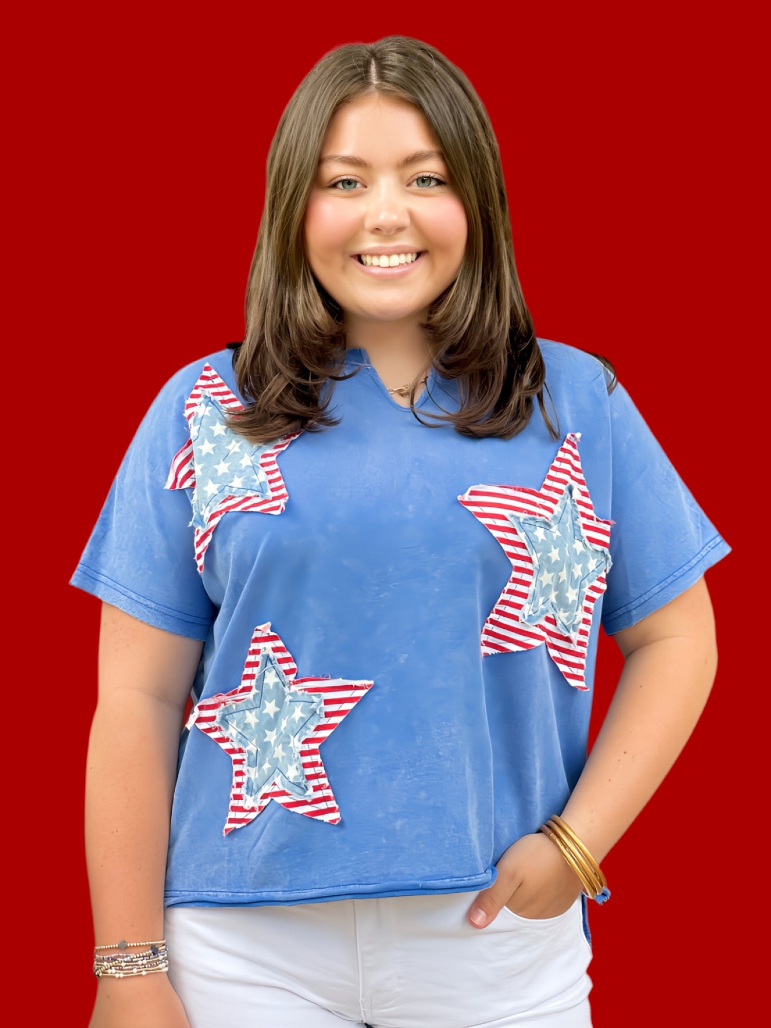 Expertly crafted for comfort and style, our Star Patched Mineral Knit Top is a must-have addition to your wardrobe. The mineral washed fabric provides a unique and lightweight texture, while the mixed fabric star patch adds a touch of edginess. With a notched neckline and short dolman sleeves, this loose-fitting top is perfect for any casual occasion.