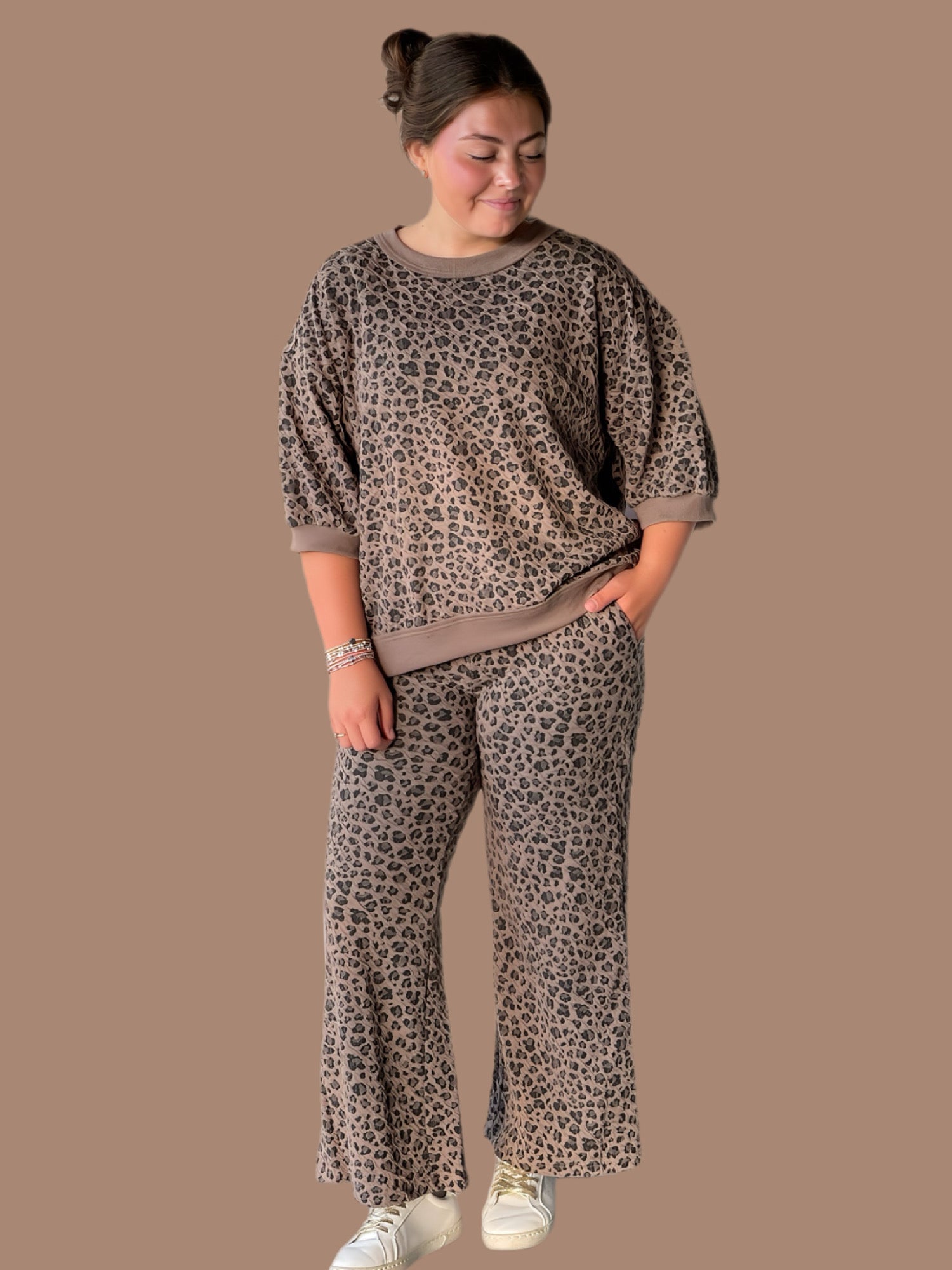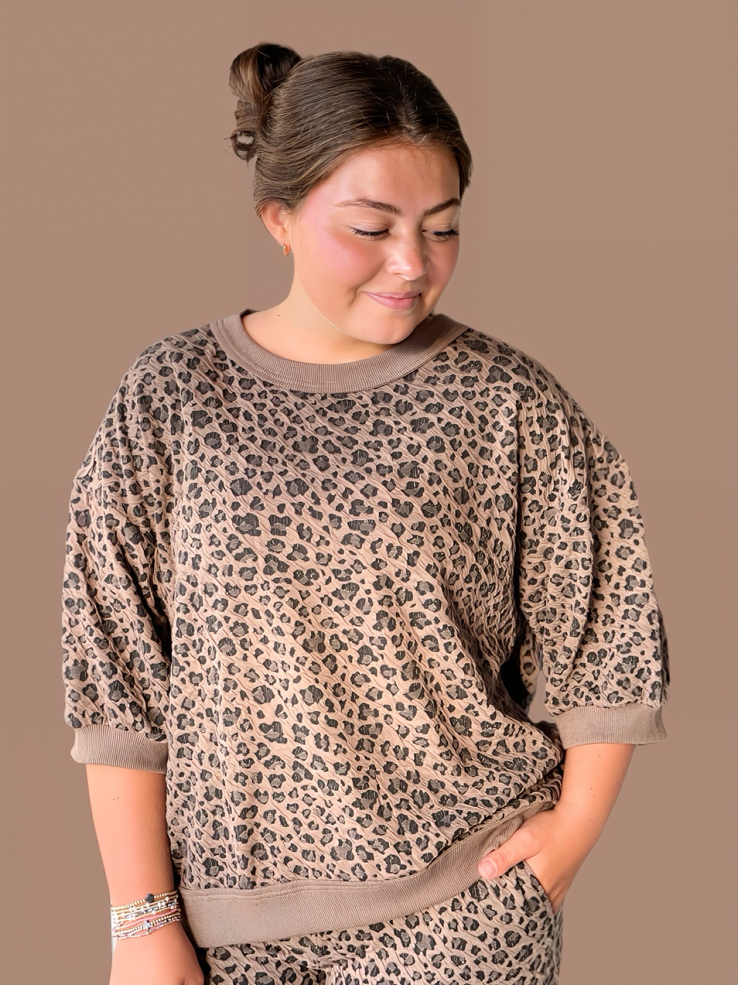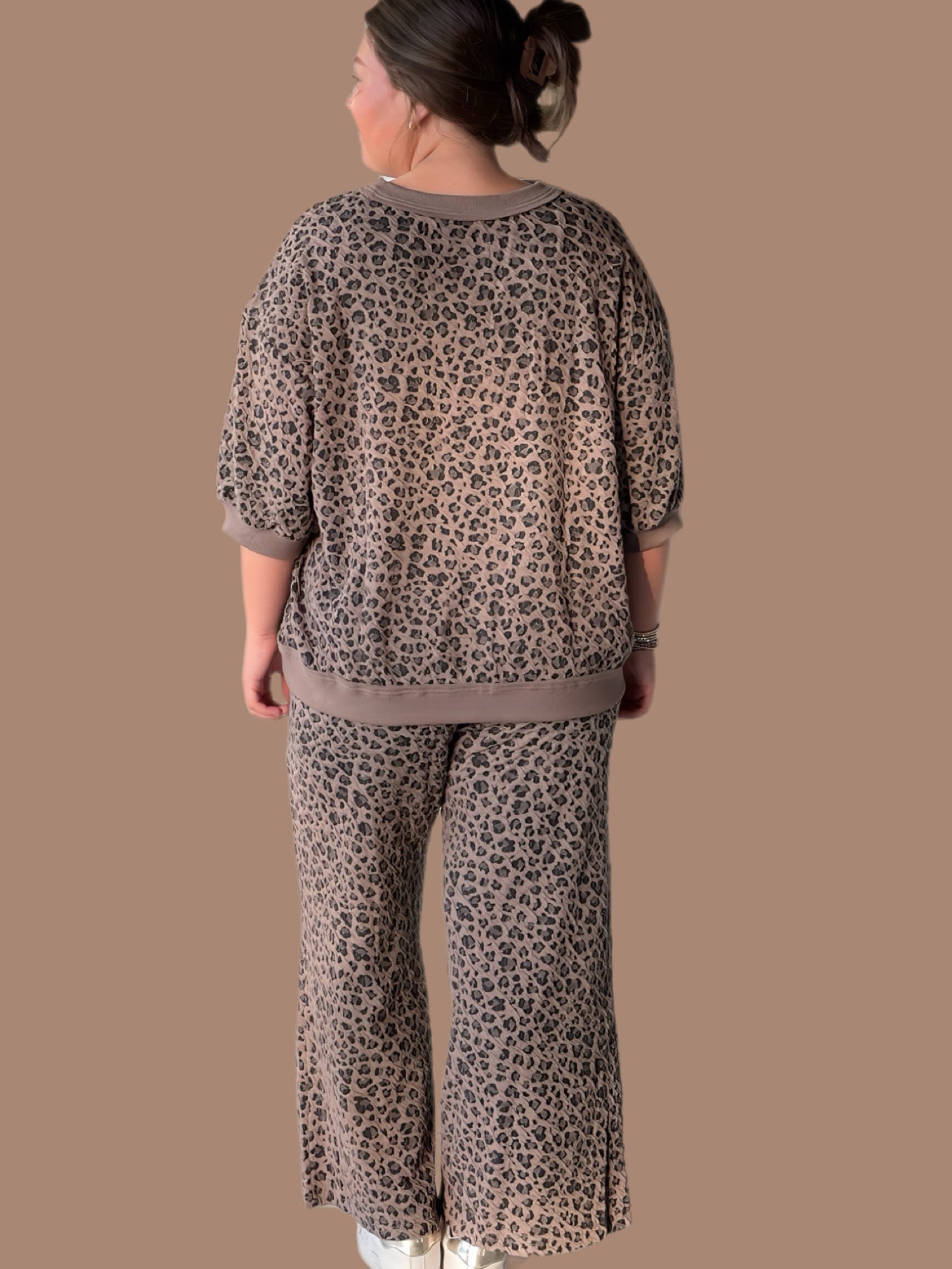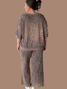 This Animal Knit Jacquard Set features a wide-leg design crafted from breathable knit jacquard fabric for a comfortable fit. The set includes a top with a ribbed crewneck, short puff sleeves, and a ribbed hemline, offering subtle texture and structure without lining. The trousers have a convenient waistband and match perfectly for a coordinated yet relaxed ensemble, ideal for stylish layering and all-day wear.
