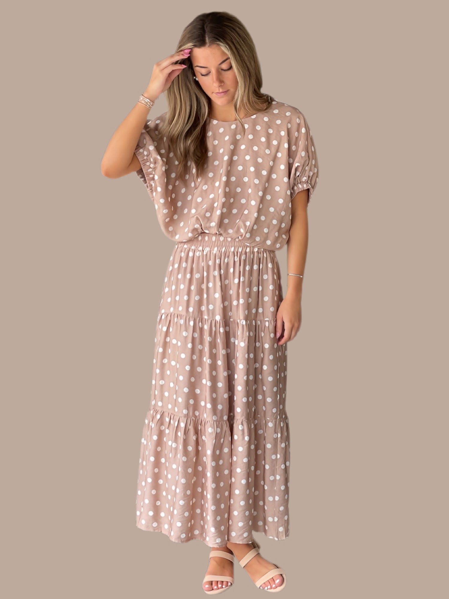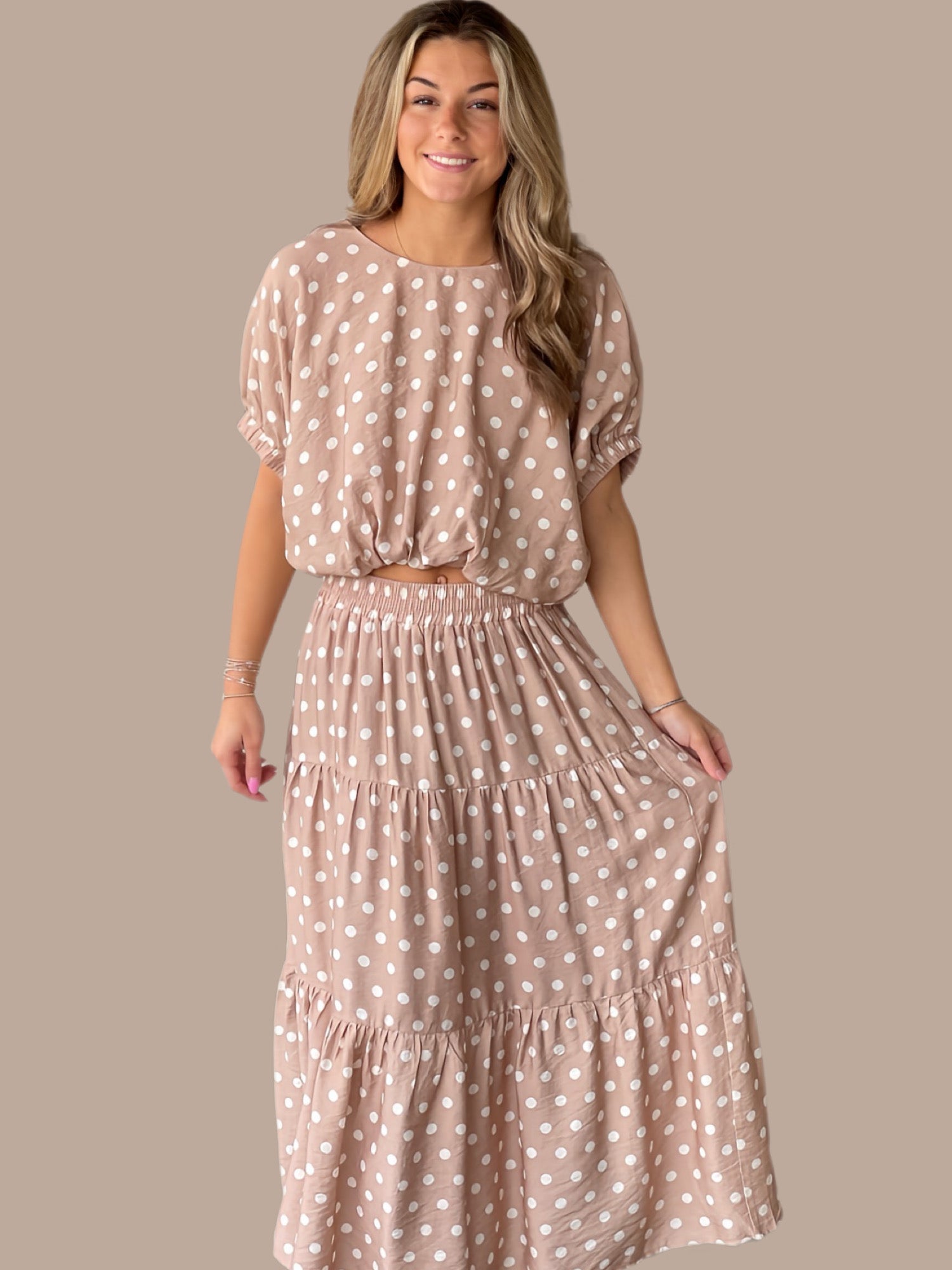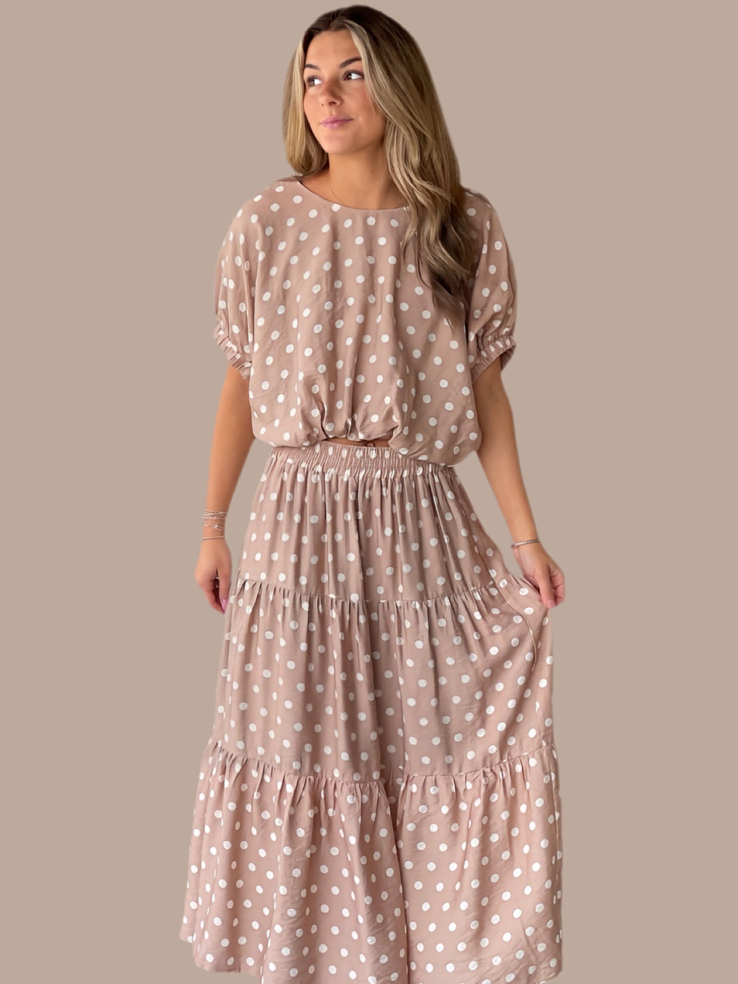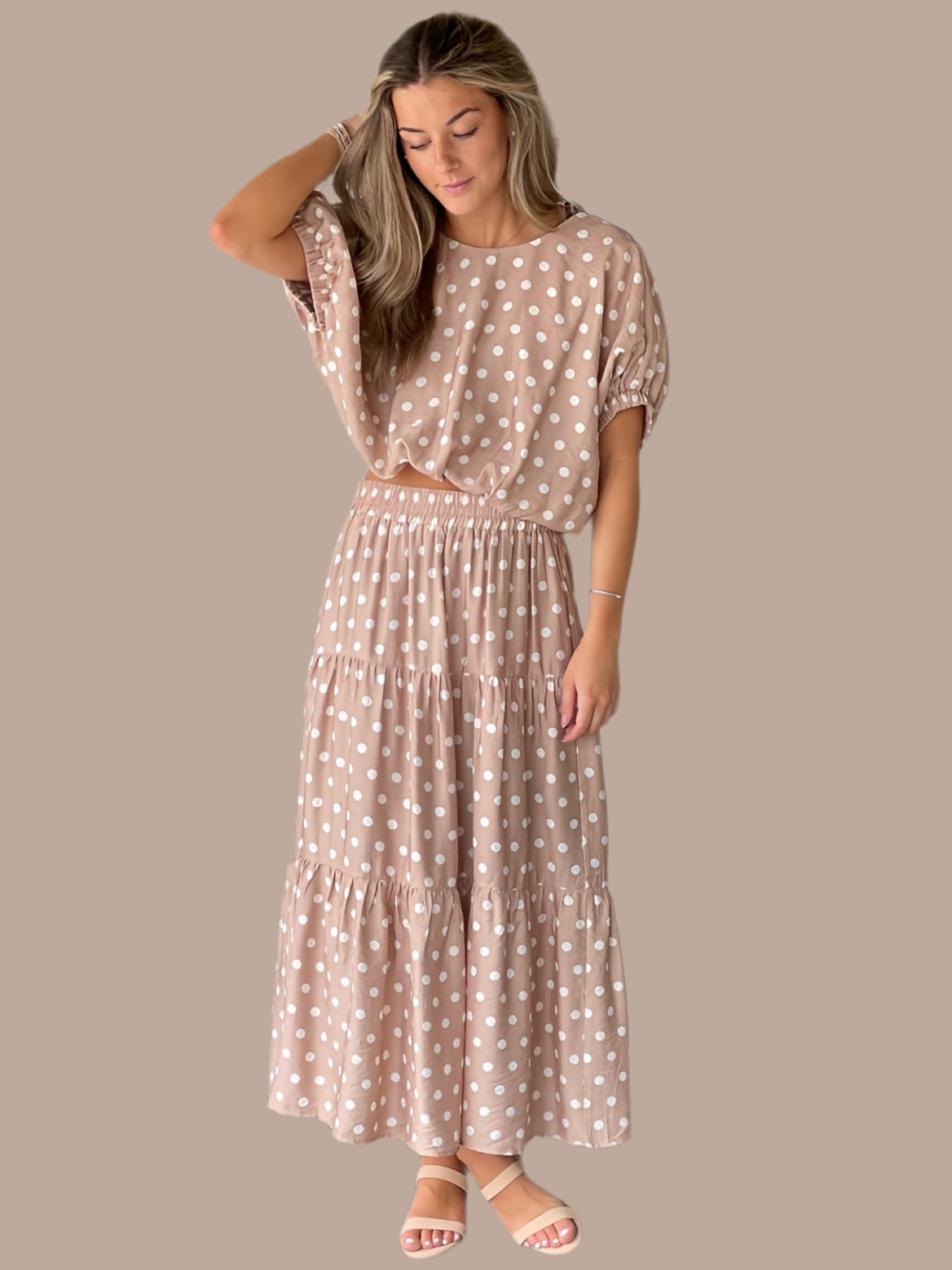 Elevate your wardrobe with this charming two-piece set featuring a polka dot short dolman sleeve top paired with a matching midi skirt. The top showcases elasticated sleeve openings and a back button closure for easy styling, while the skirt features a flattering elastic waist, ruffle hem detail, and practical side pockets. Both pieces are crafted from a lightweight viscose-nylon blend, fully lined for comfort and opacity. The woven fabric drapes beautifully without clinging, making this set perfect for casual outings or relaxed gatherings. Fits true to size.