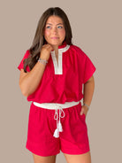 Effortlessly coordinate with this two-piece set designed for modern comfort. The elastic-waist shorts feature a contrast waistband with drawstring adjustment and functional side pockets, while the lightweight woven fabric keeps you cool. The matching dolman sleeve top showcases a split V-neck with ruffled trim and flattering side slits. Both pieces are crafted from breathable, non-sheer woven material—perfect for casual outings or relaxed weekends.