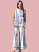 This linen blend sleeveless striped set is made of high quality material. Enjoy the luxurious and breathable fabric, perfect for warm weather. The frayed details add a touch of style, while the lack of lining allows for a lightweight and comfortable fit. Perfect for any summer outing.