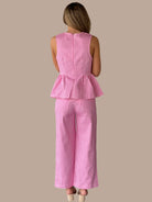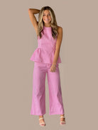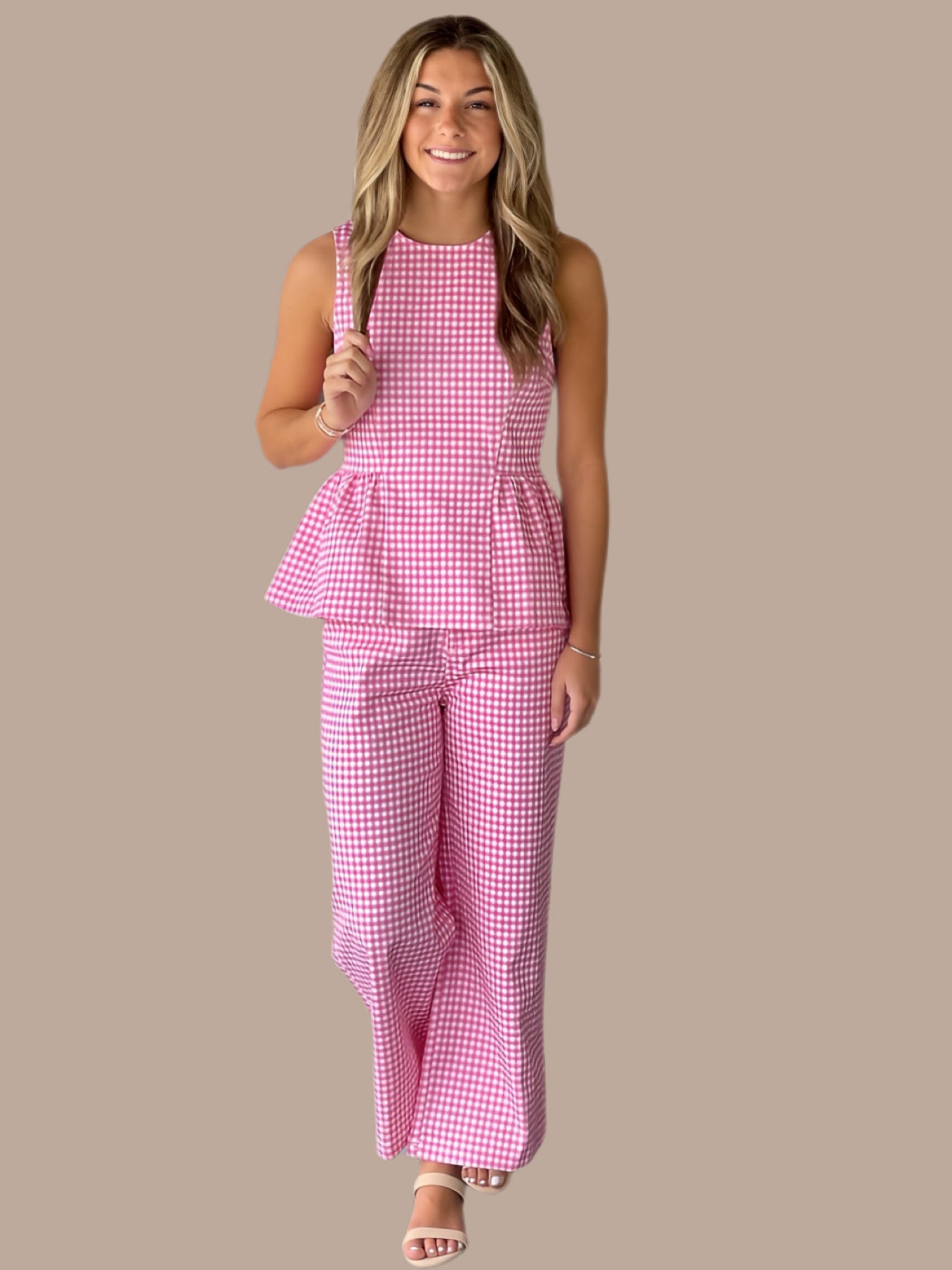 Complete your classic wardrobe with this timeless gingham set. The sleeveless peplum top features a structured waist seam and convenient back zipper closure, while the straight leg pants offer a flattering silhouette with button-front closure and functional zip-fly. Both pieces showcase lightweight, woven fabric that's non-sheer and unlined for breathable comfort. Practical front and back pockets on the pants add everyday functionality. Crafted from a soft cotton-spandex blend, this versatile set transitions effortlessly from casual days to polished occasions. Fabric: 97% Cotton, 3% Spandex Fit: True to Size.