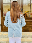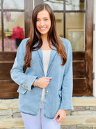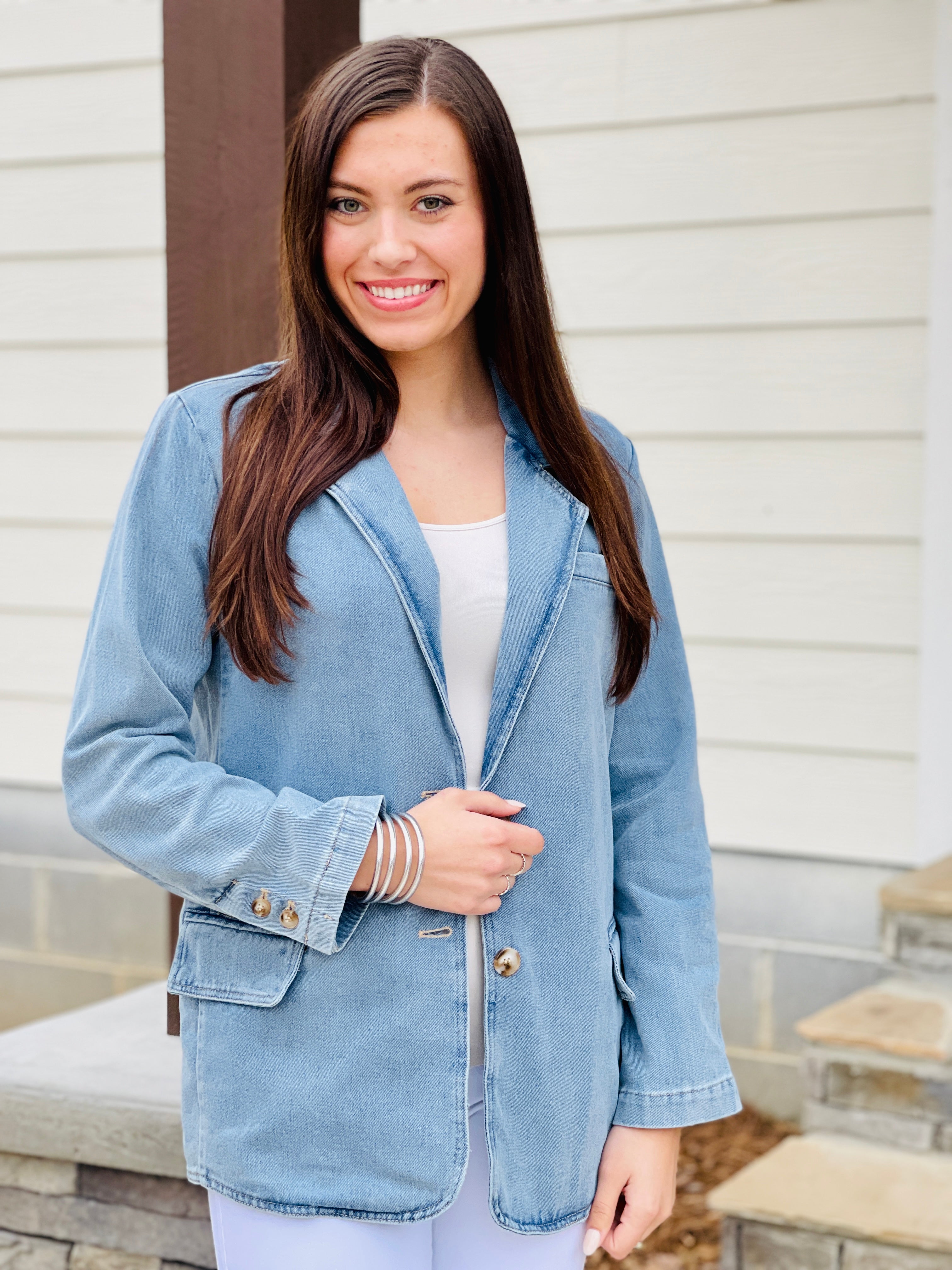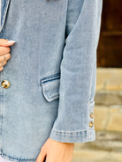 Description::: Acid wash denim button front blazer featuring pockets at bust and side. Button closure at sleeves. Unlined. Woven. Non-sheer. Mediumweight.